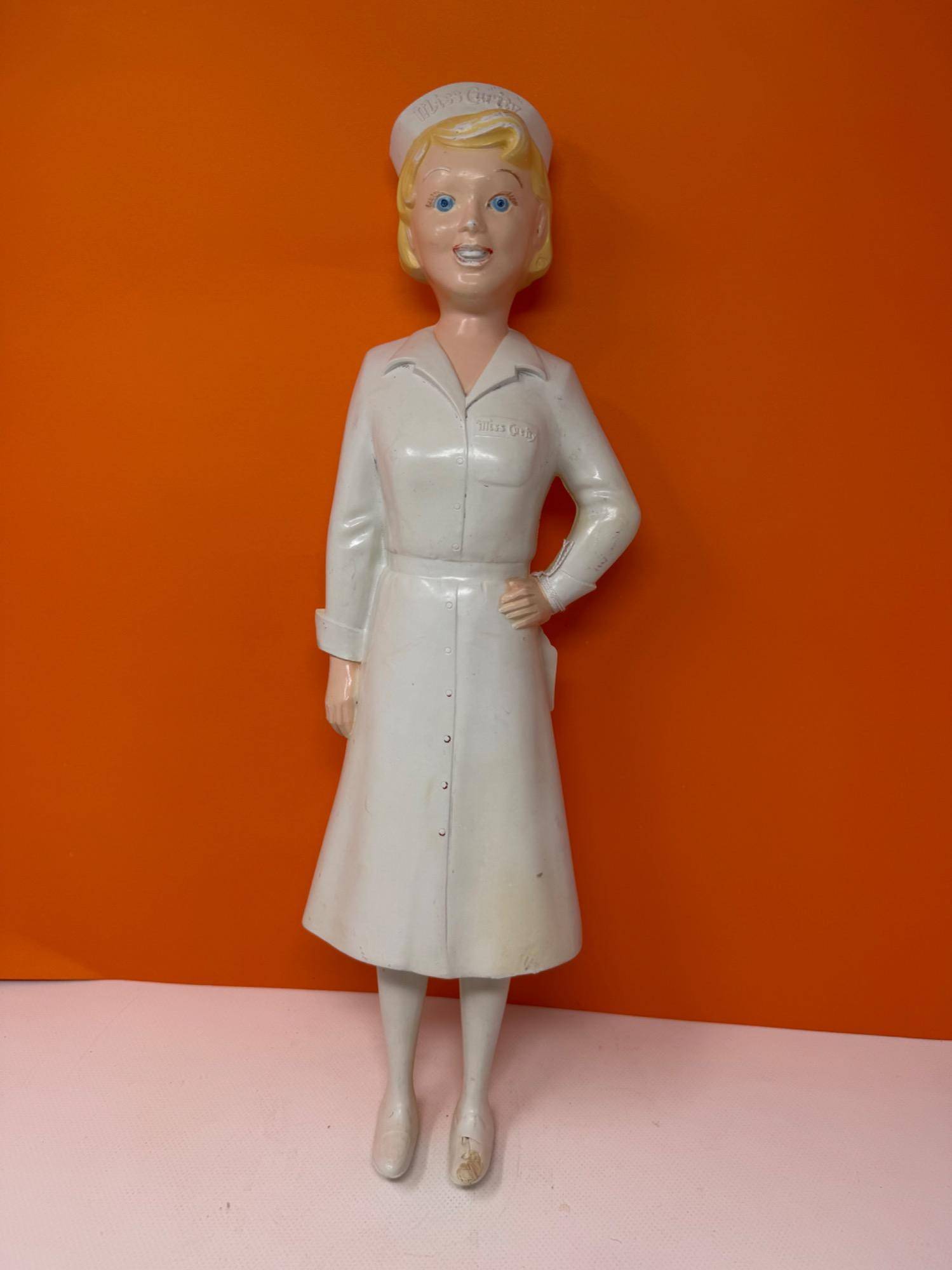 Rare hard mold plastic Nurse Curity doll. Some chips on one heel. Paint thinned in some areas. 19in tall. 1950's era