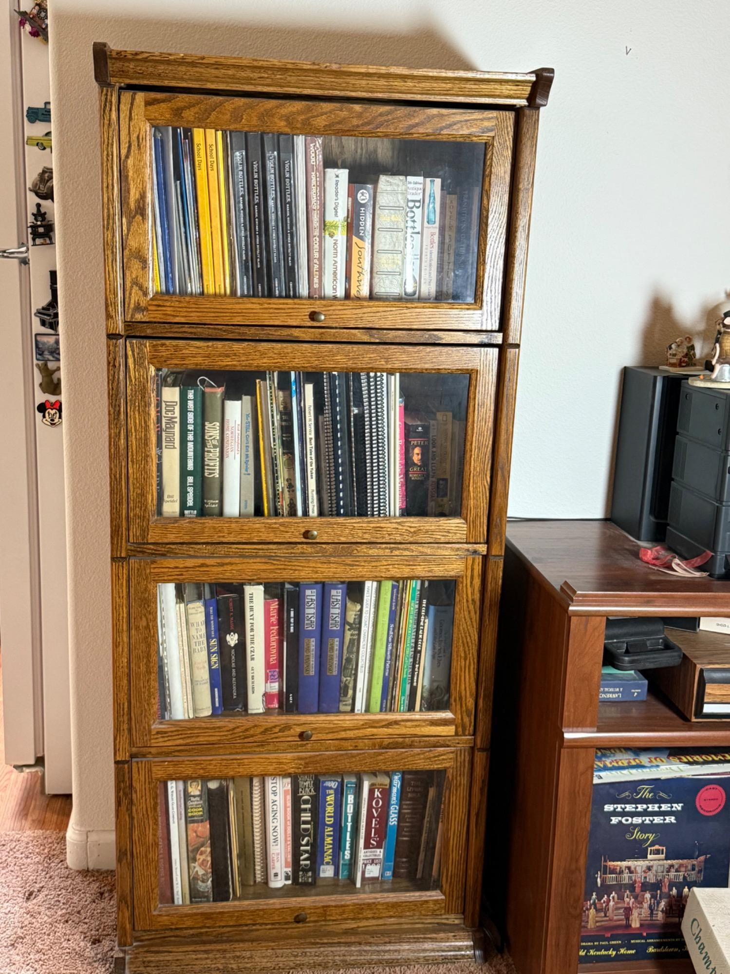 Vintage walnut lawyers bookshelf. Glass doors with original knobs. All one piece and heavy. Books range from local authors, antique and collectibles, cookbooks, novels, Russian history, travel and religion