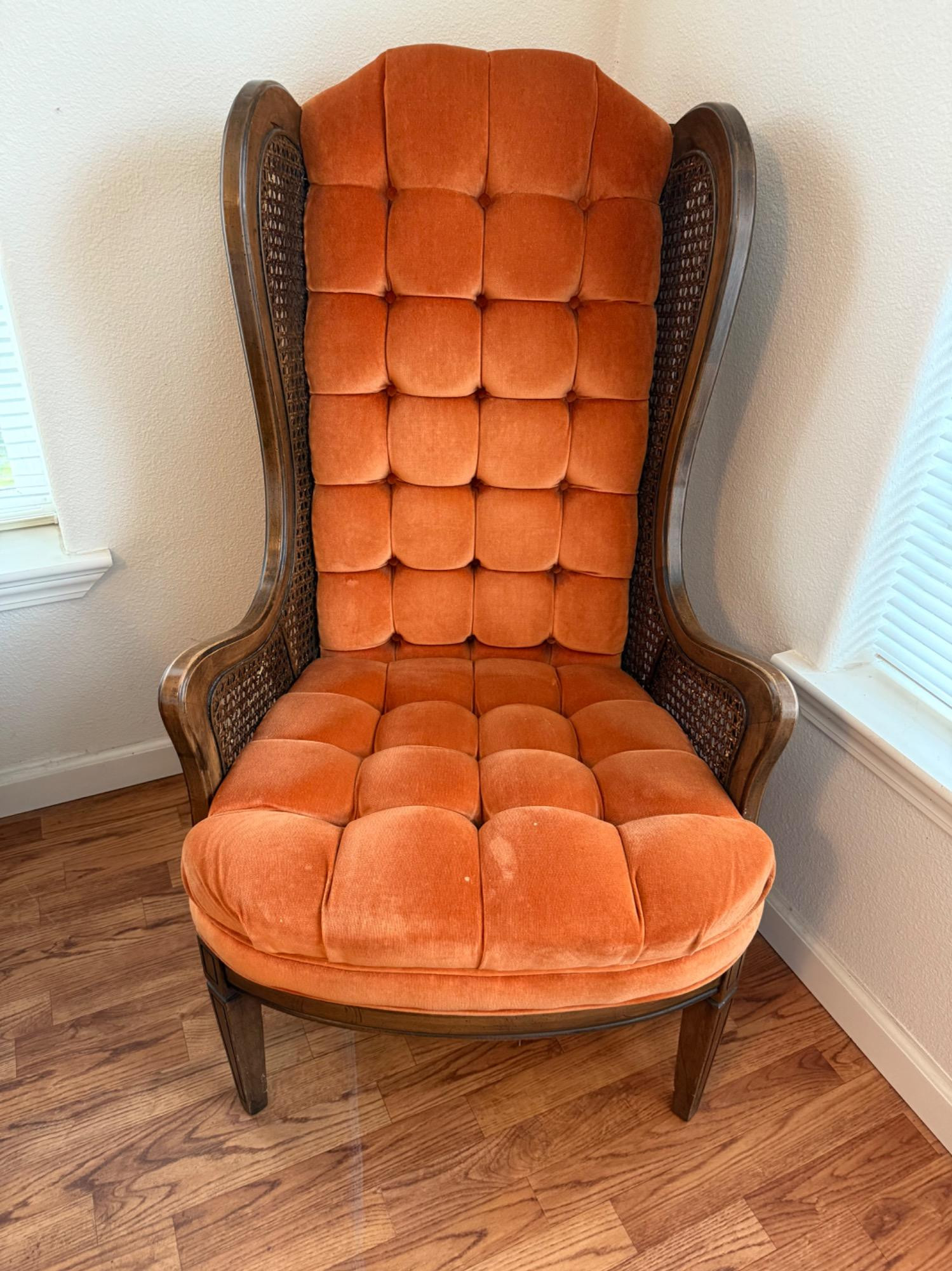 Vintage Tangerine Velvet Wing Back Chair With Rattan Accents. Cushions are firm and in good condition. A light cleaning would refresh. Does not appear to have fading The cane is in good shape A solid and comfortable chair