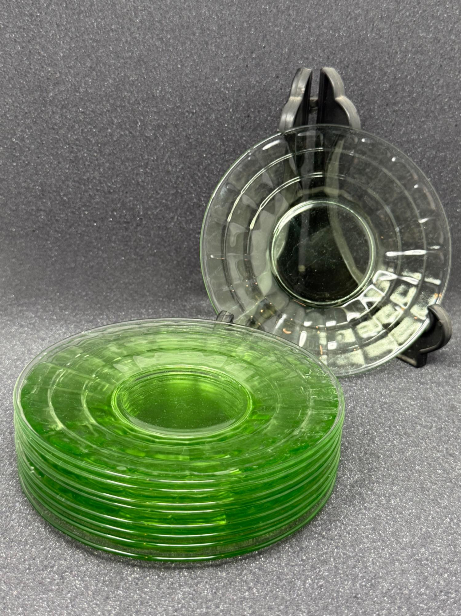 Nine vintage Green Block Optic pattern plates Uranium glass dessert plates. In great condition