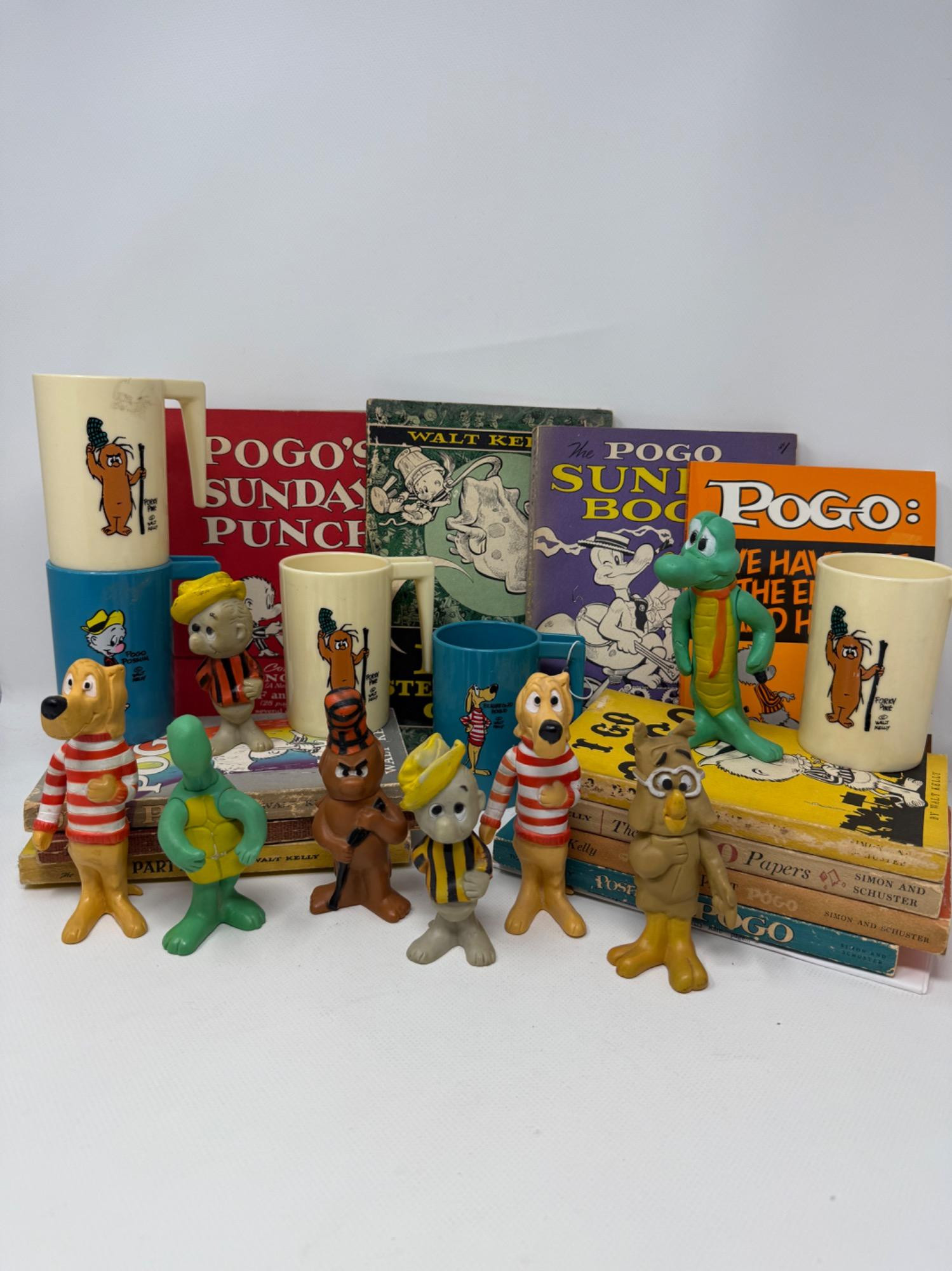 Vintage collection of mugs, books and figurines Books are in good condition Plastic mugs with three being identical Pogo Possum and friends' plastic/rubber figures One of the owls is missing an arm