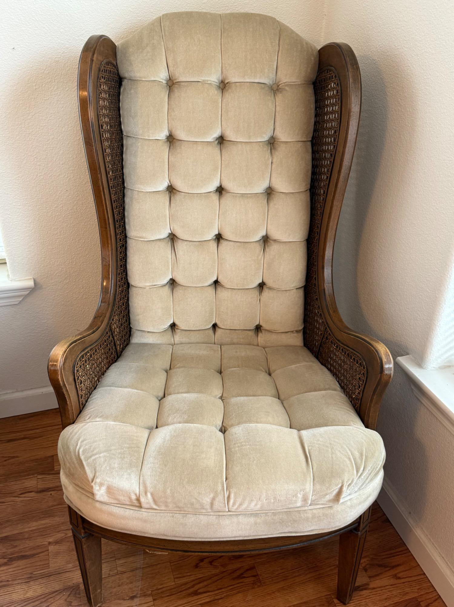 Mid Century Cream Velvet/Cane Wing Back Chair. No stains, in good condition for its age. 45" Tall x 15" Wide x 24" Deep Firm and comfy