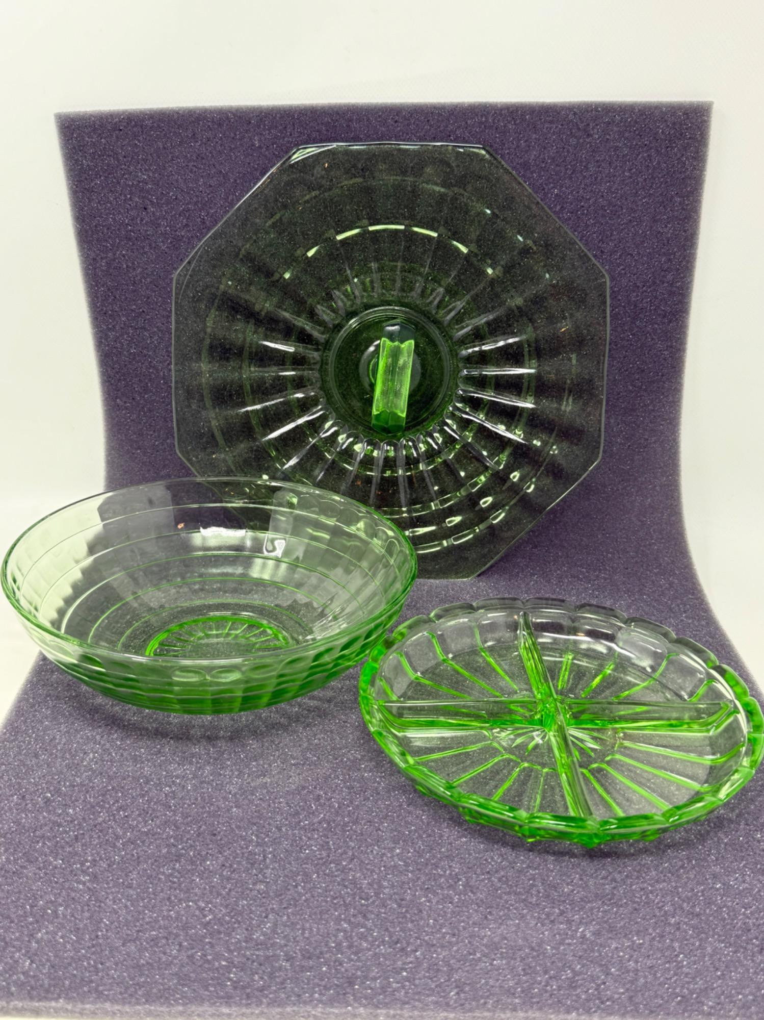 Tall serving tray is 4in tall and 10.25in wide. It is NOT uranium glass Divided relish tray and serving bowl are Uranium glass in Block Optic pattern In great condition.