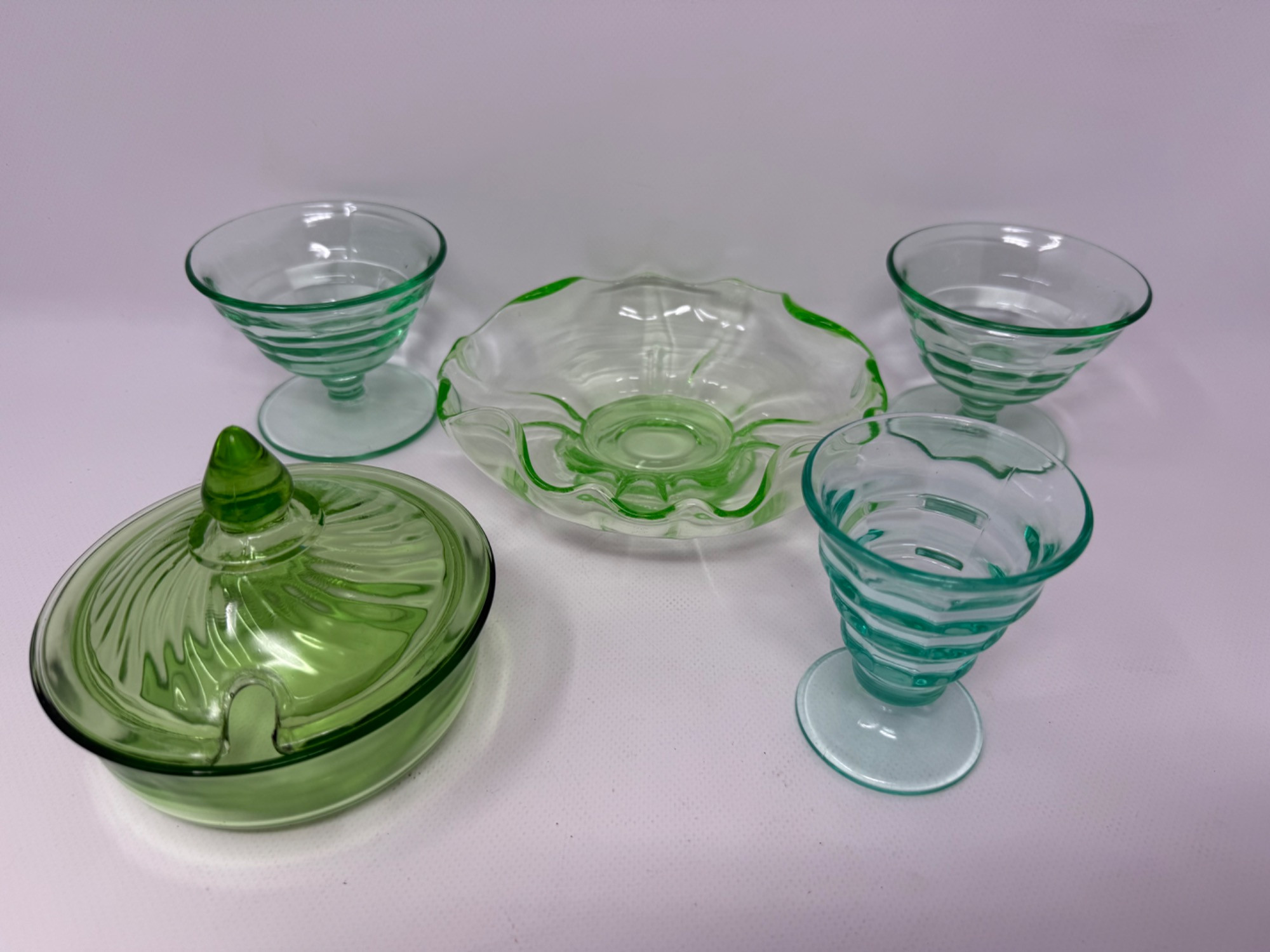 Mix of uranium glass dishes. Ice cream sundae cups, sherbert cups, lidded condiment dish-missing spoon, flared candy dish Ice cream and sundae cups are Block Optic pattern.