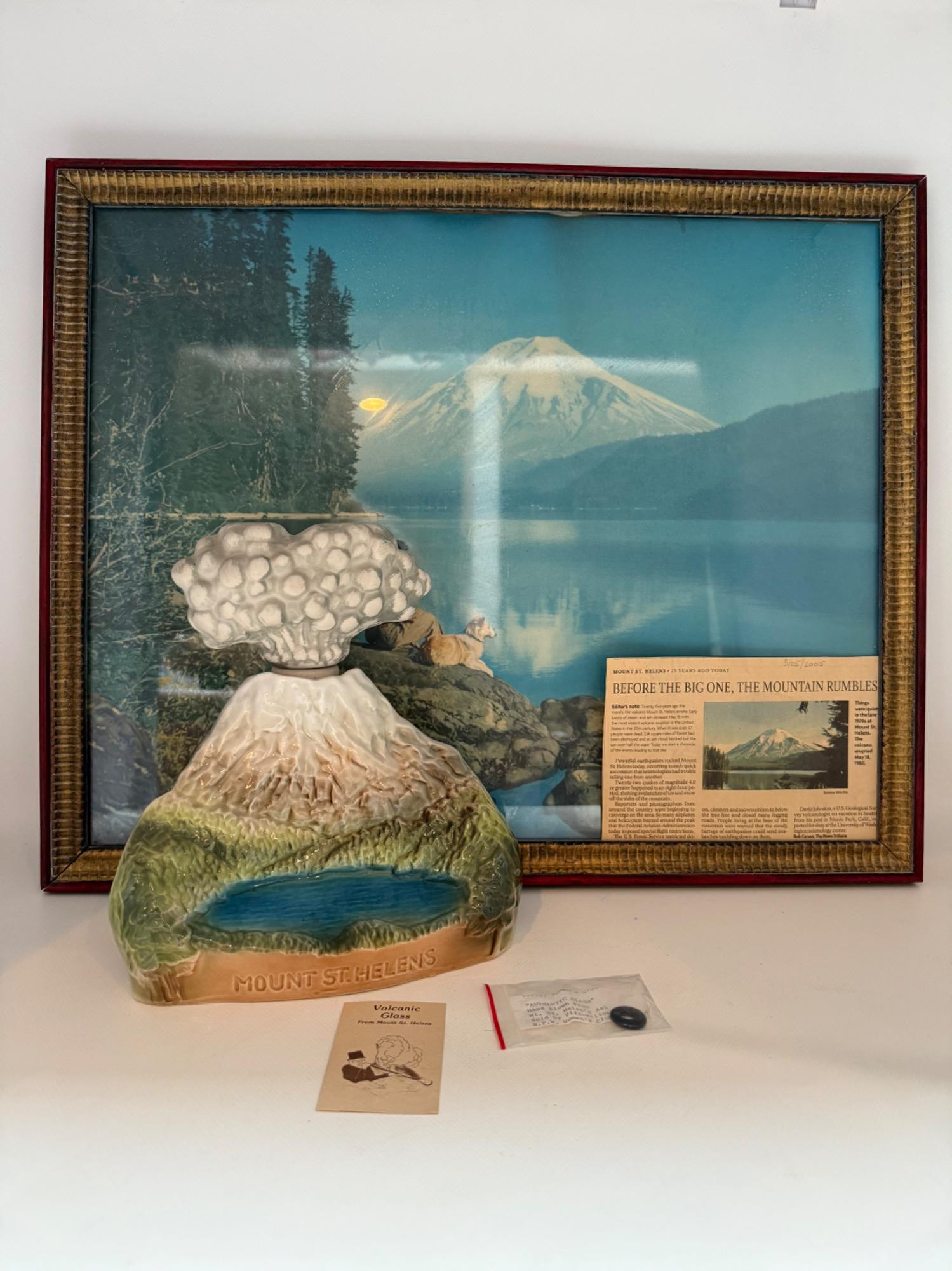 Vintage framed print of Mount St. Helens prior to eruption. Artist unknown Jim Beam bourbon bottle of Mt. St. Helens erupting. Includes a small vial of real ash. 9.5 in tall, 8.5in wide Small glass pendant made from ash.