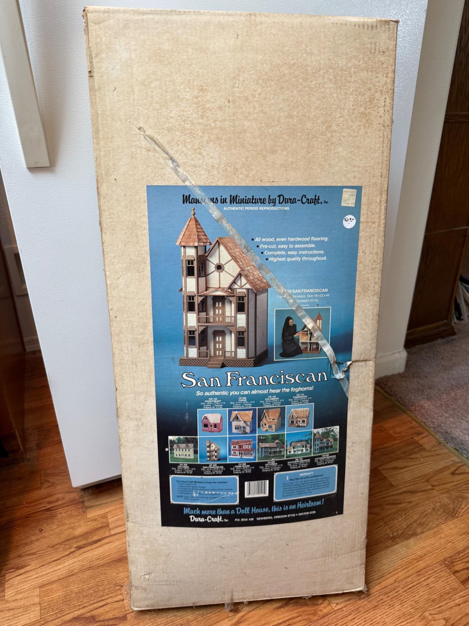New in Box wood dollhouse San Franciscan model. Pleases see pics for details. Additional accessories found
