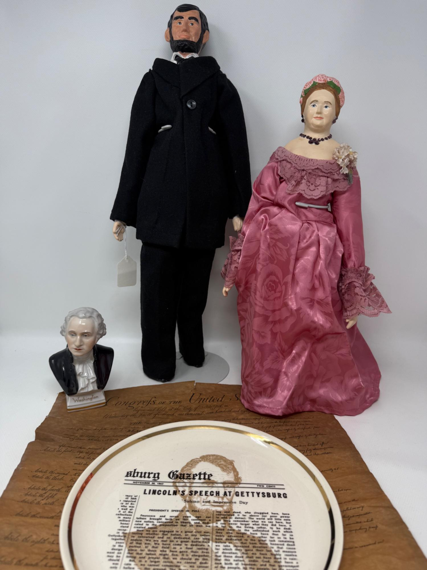 Vintage Dolls of Mary and Abe Lincoln. Large size with stands. Ceramic bust of George Washington made in occupied Japan Parchment paper Gettysburg address. Decorative plate
