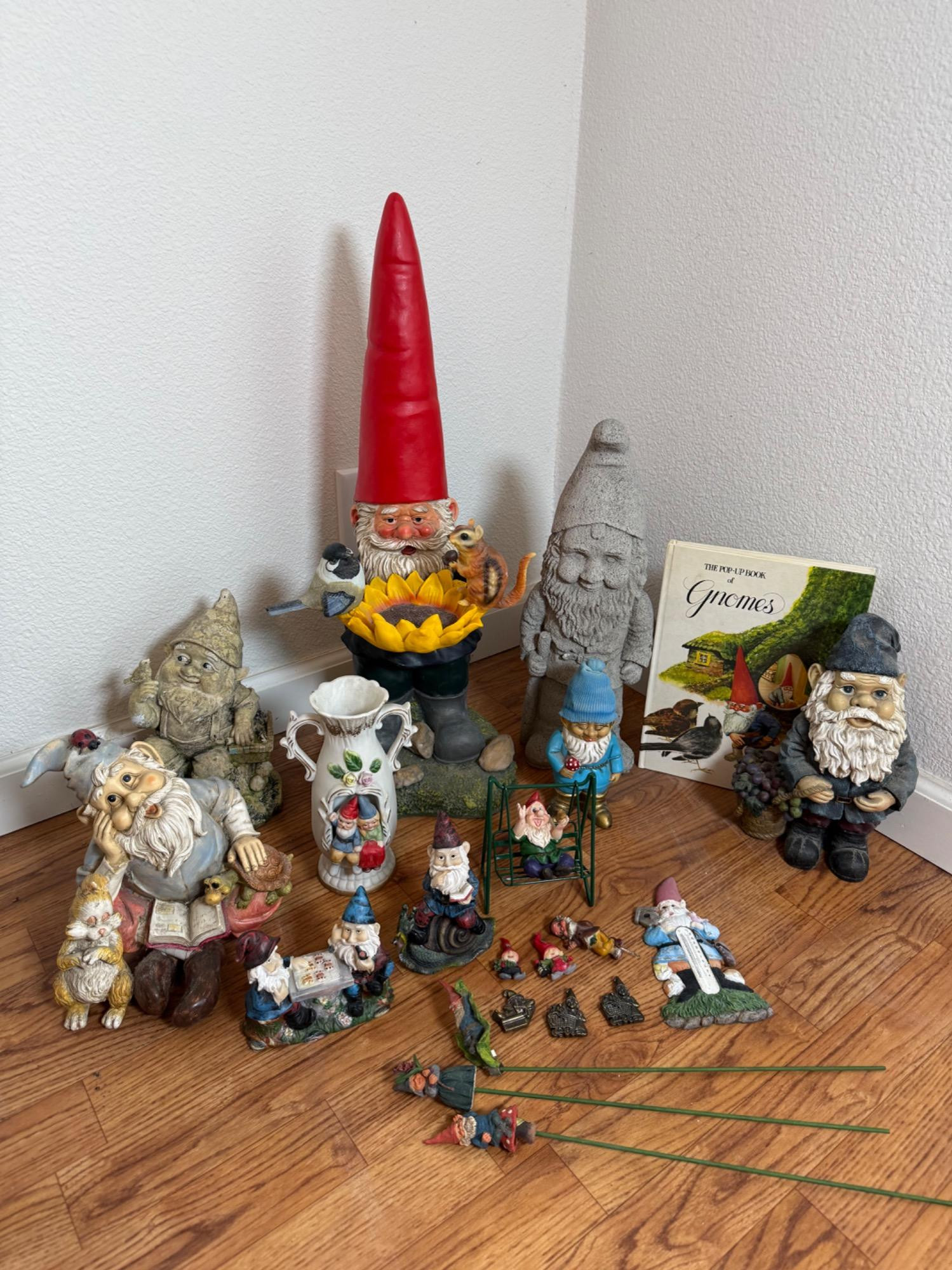 A Gnomely- Vintage Gnome Collection- Lots Here-See Picture Largest gnome is 24" tall. Books, game, figures and lots of fun little gnome items here. Variety of materials, styles and sizes.