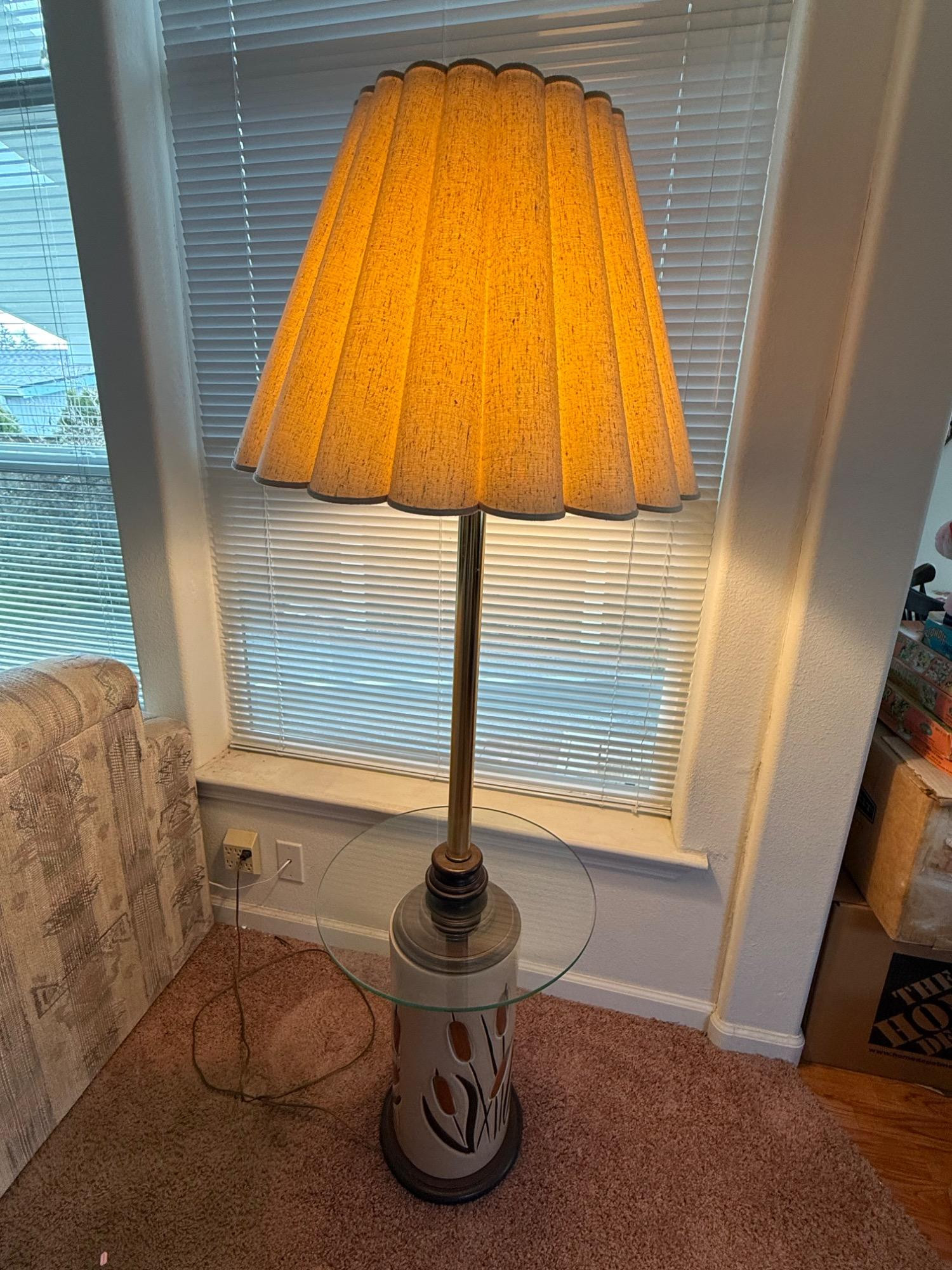 Vintage cattail ceramic lamp with glass table. Fluted shade needs cleaned-very dusty Heavy ceramic base