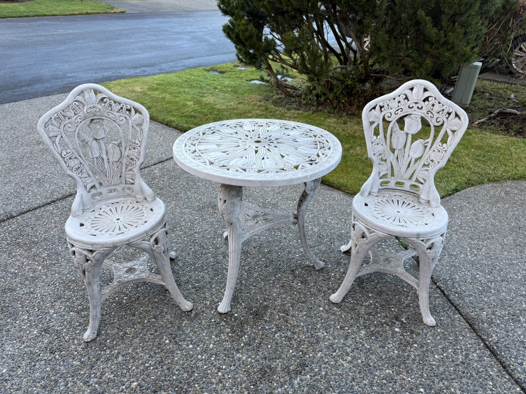 Hard plastic patio cafe set. Table and two chairs. Tulip detail throughout. Needs a little scrub. Chair dimensions are 38in tall, 16in wide, 18in long