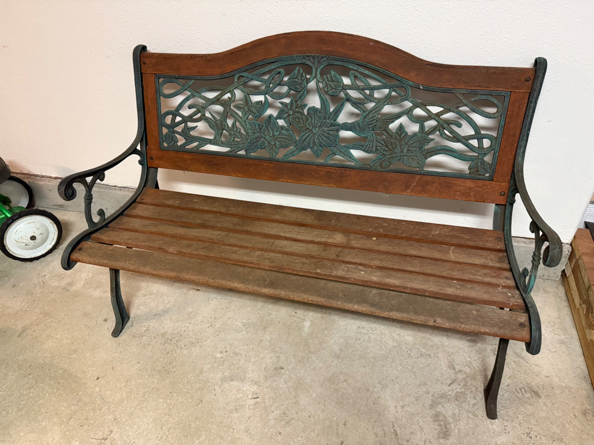 Heavy Iron and wood garden bench. Floral scroll work Bench is heavy, bring help to load.