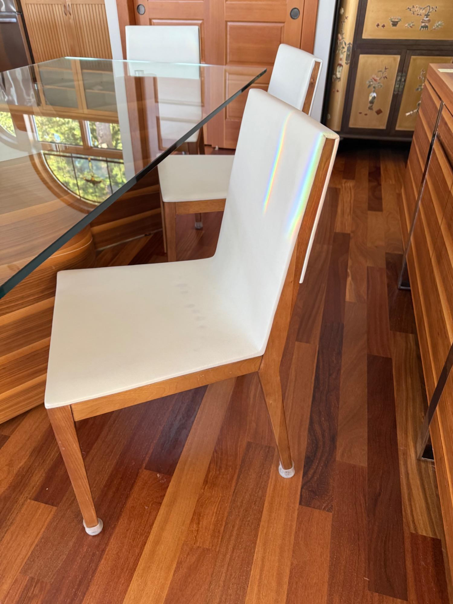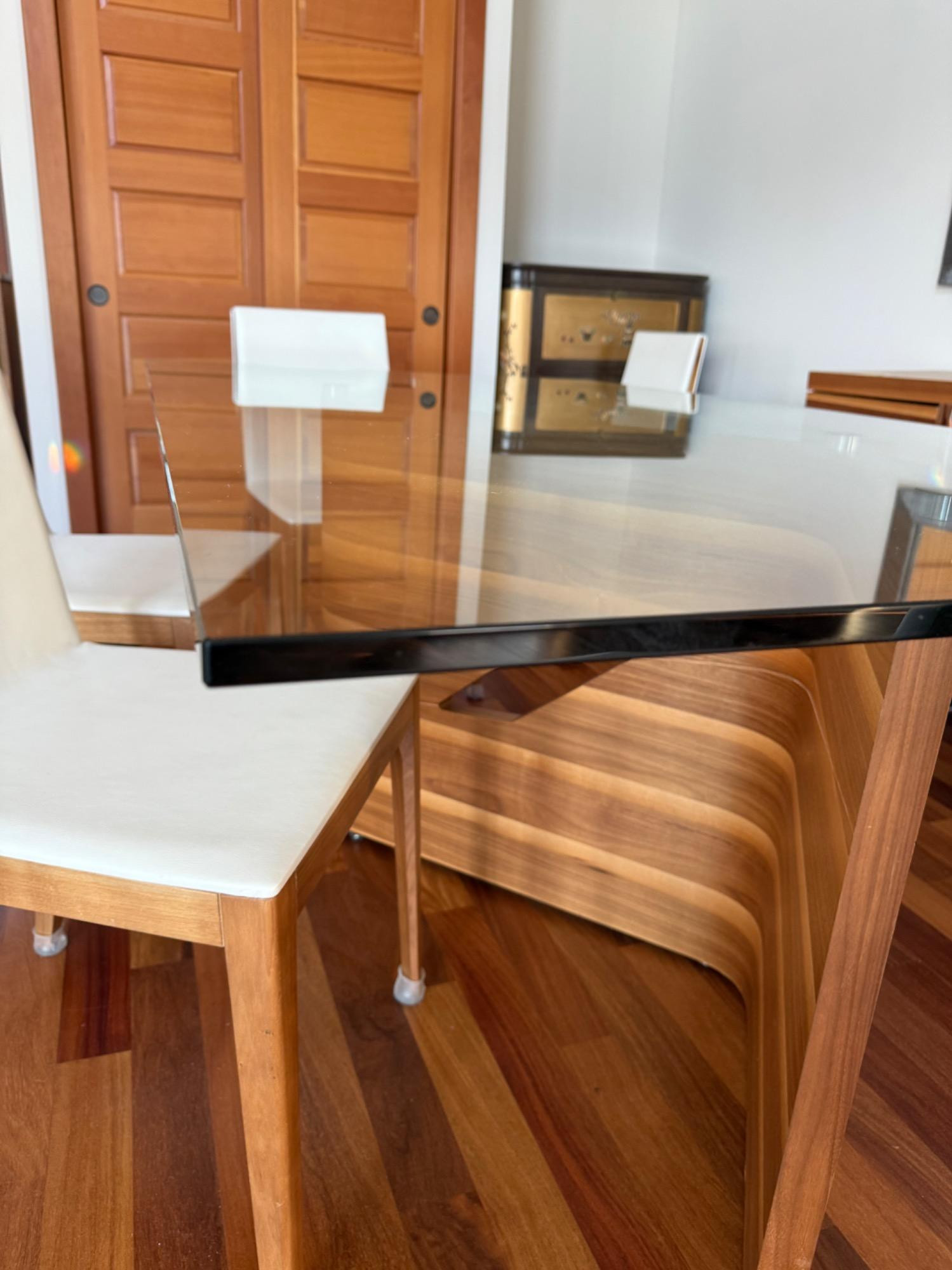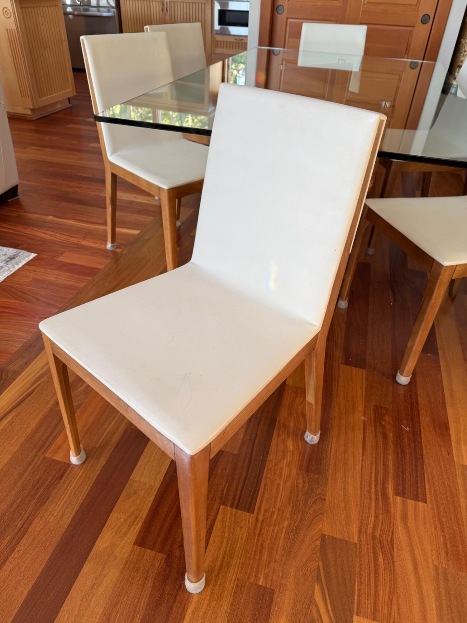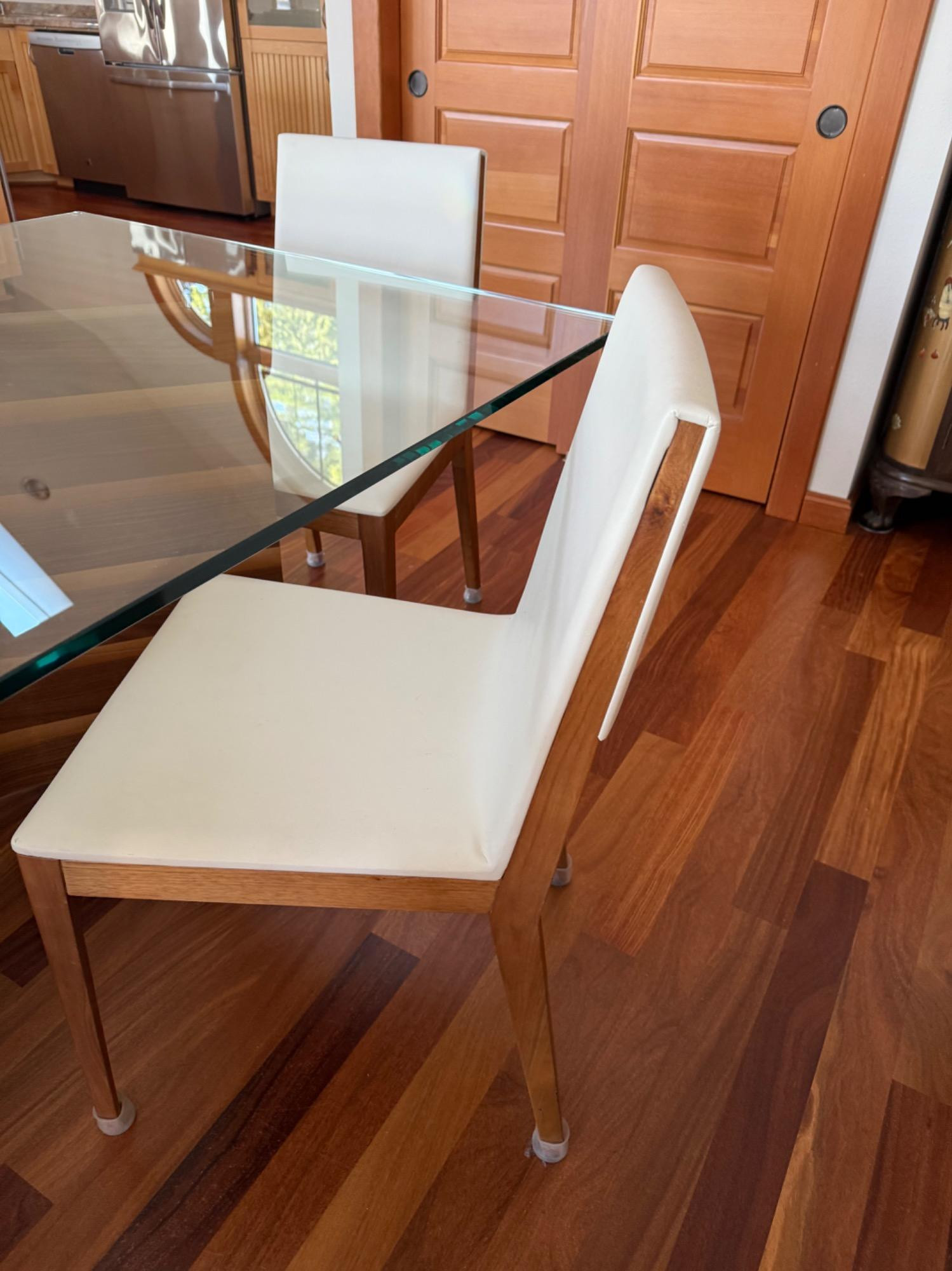 The Dakota Dining Table blends modern aesthetics with natural elements, featuring a light walnut base and tempered glass for a harmonious and stylish centerpiece. Paired with the comfortable and fashionable Adeline chairs, this set is perfect for hosting memorable dinners. Bring sophistication and functionality to your dining room with this versatile, contemporary dining set! Table Features: Shape: Rectangular Size: Seats 6 comfortably Materials: Premium wood base, tempered glass top Color: Sophisticated white Dimensions: 39"D x 71"W x 30"HID: P4025122 Chair Features: Material: Leather-inspired seat with warm wooden accents Color: White and natural wood Versatile and pairs well with other wooden accent tables Dimensions: 22"D x 19"W x 34"H ID: P4035146 Bidding on this lot is an agreement that: (1.) You will have 2 capable, able-bodied persons to lift and load at a minimum. (2.) You will bring a hand truck and/or any other tools needed to remove this item. If these steps are not followed your item will be forfeited and no refund given.