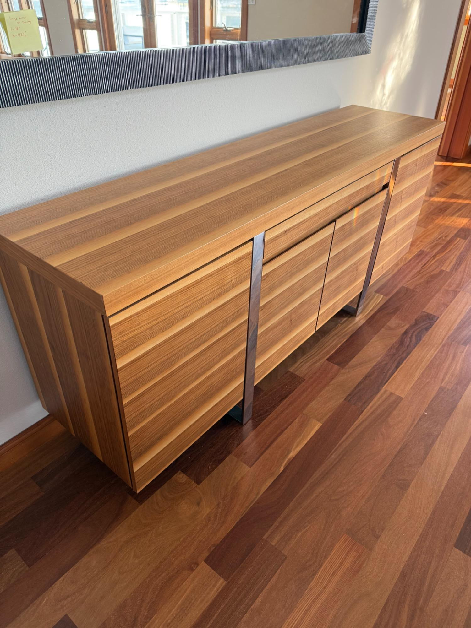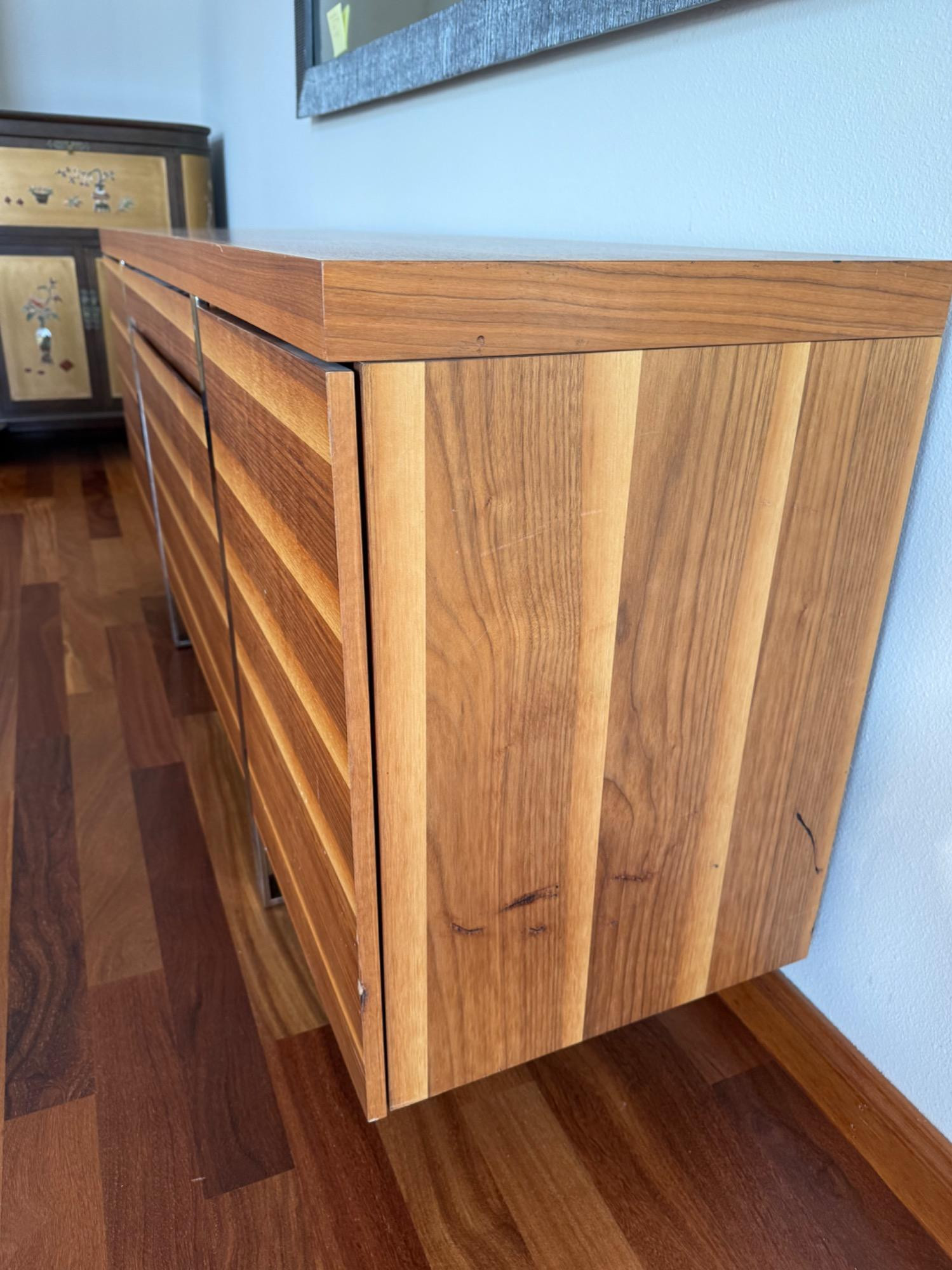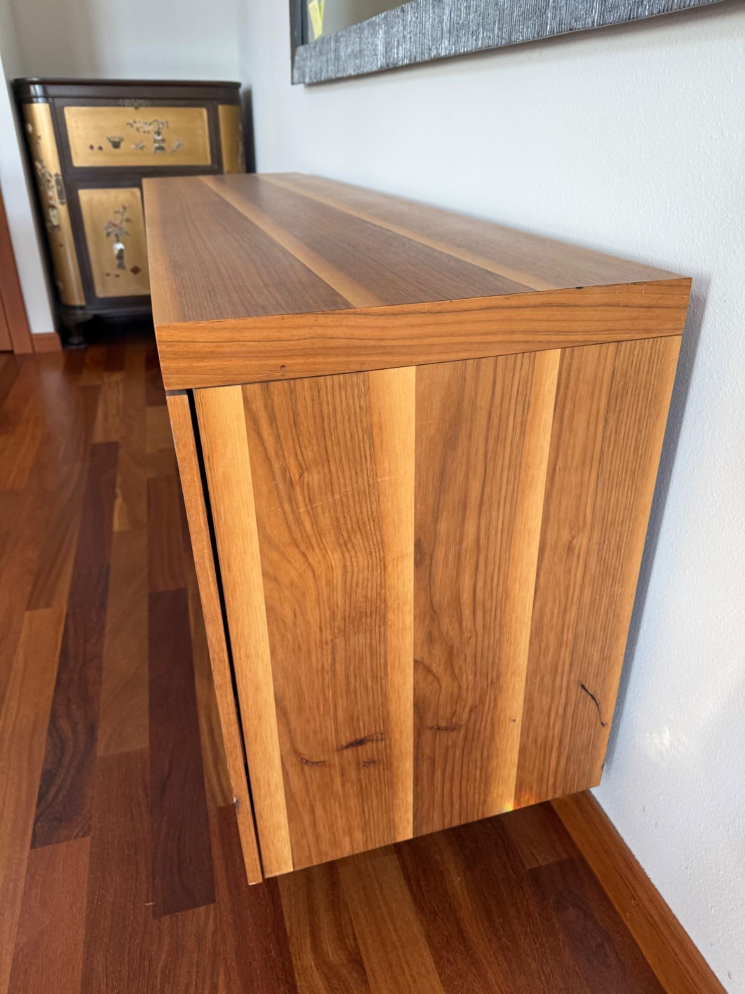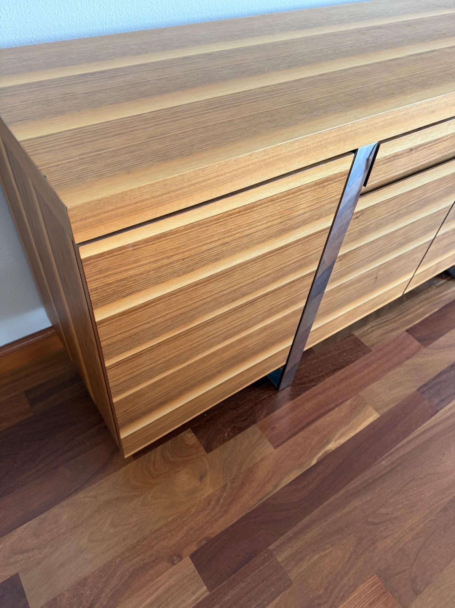 Sierra Walnut Sideboard With Chrome Accents By: Bellini Modern Living Clean, minimalist design and sleek surfaces remarkably enhance the modern feeling of your décor. Four doors and one convenient, spacious drawer suitable for all your crockery storage and extra dinnerware. Light walnut and chrome legs that wrap around the buffet. Please see pictures for any imperfections. Please note: The sideboard matches the dining room table and chairs in lot #1, it comes as a set. Estimated Dimensions: 31” H x 71” W x 18” D Bidding on this lot is an agreement that: (1.) You will have 2 capable, able-bodied persons to lift and load at a minimum. (2.) You will bring a hand truck and/or any other tools needed to remove this item. If these steps are not followed your item will be forfeited and no refund given.
