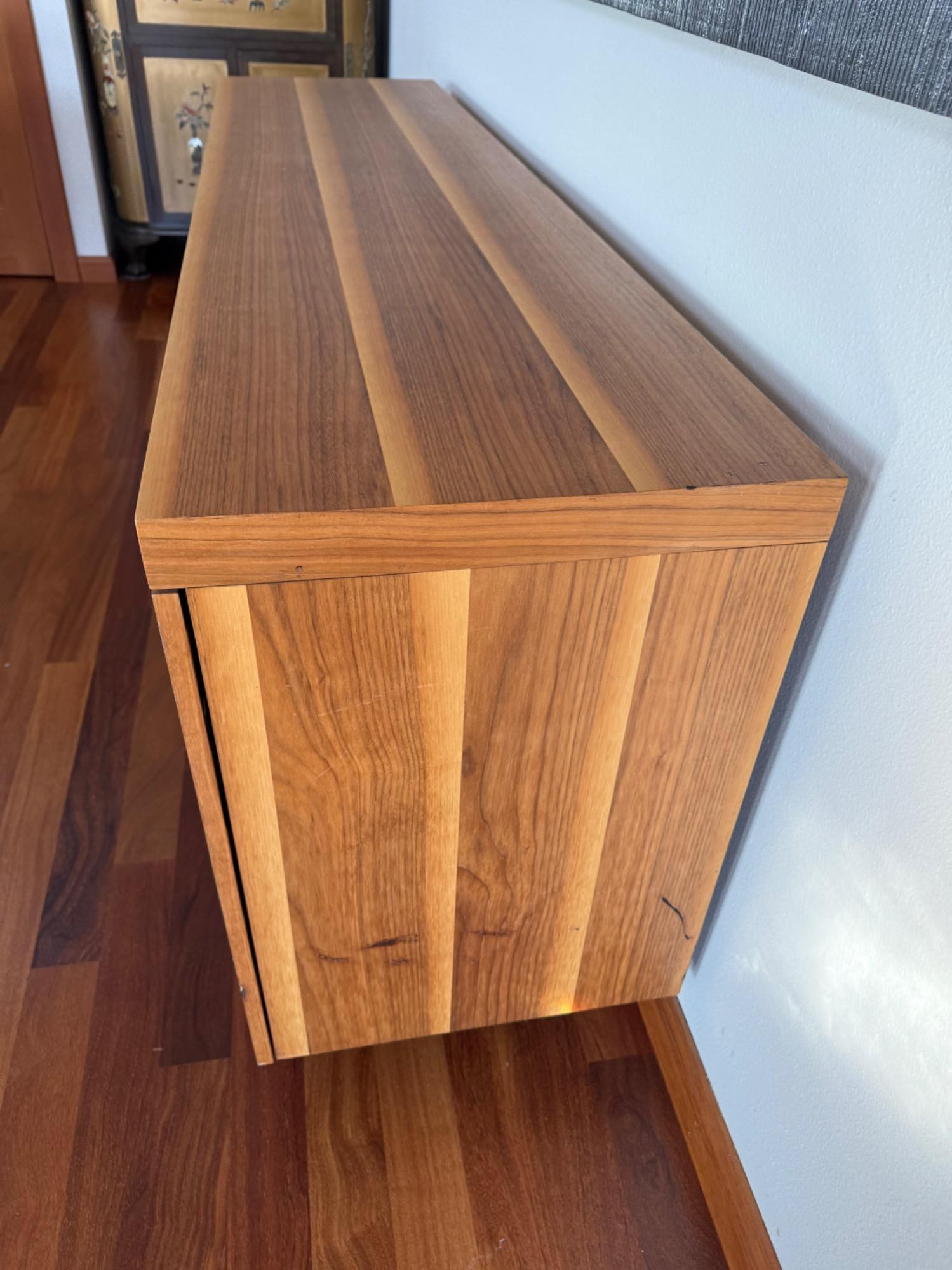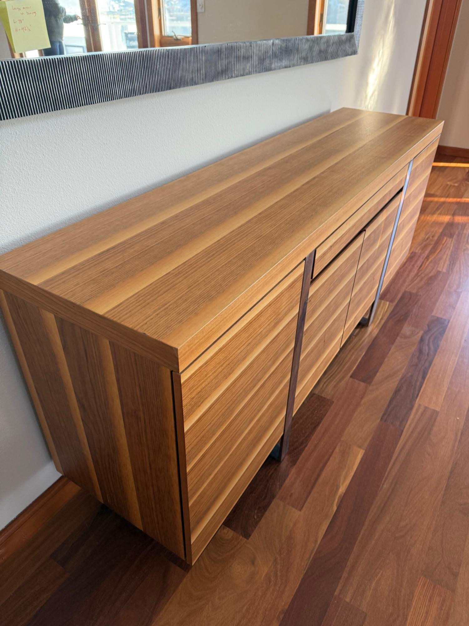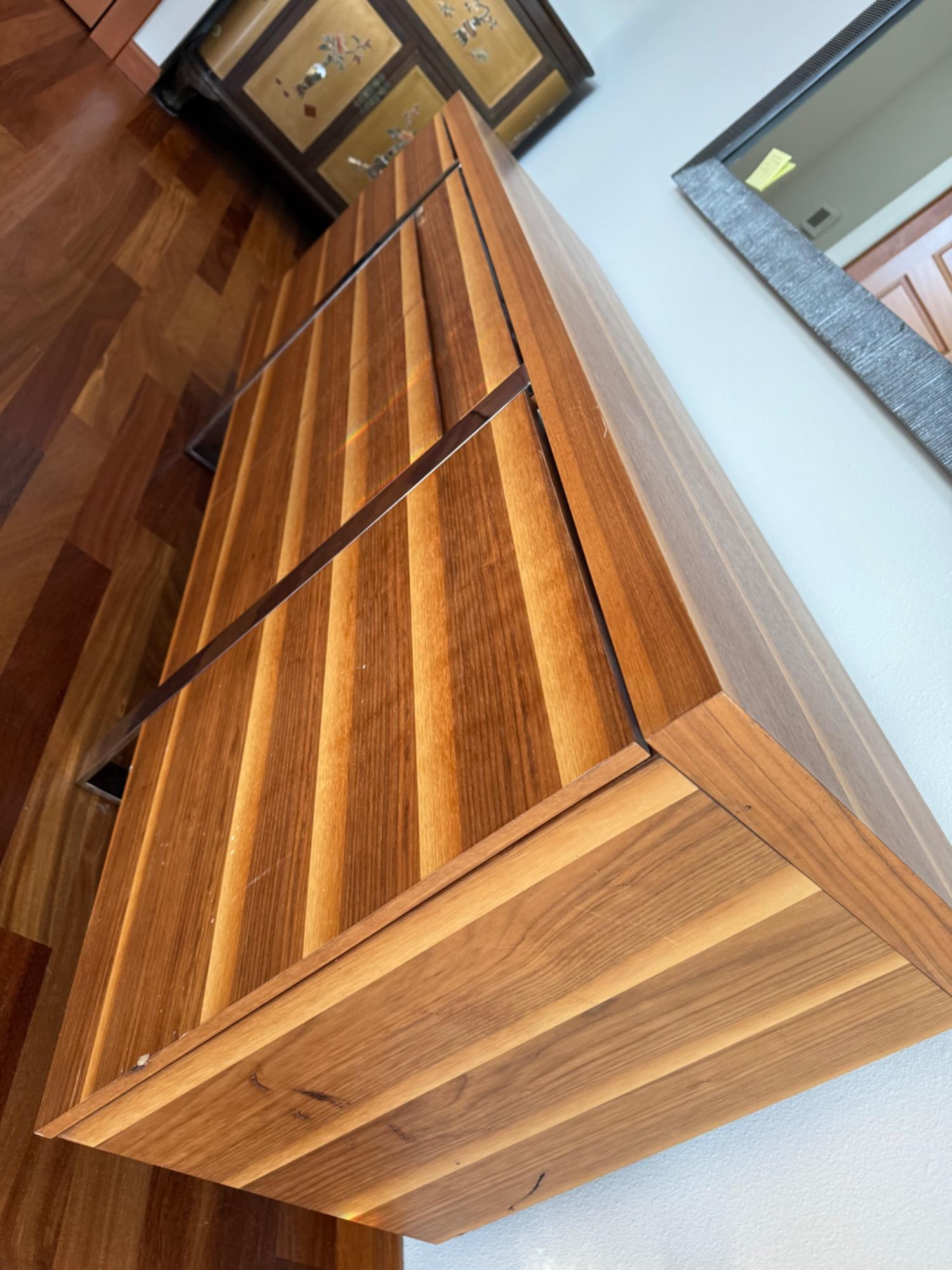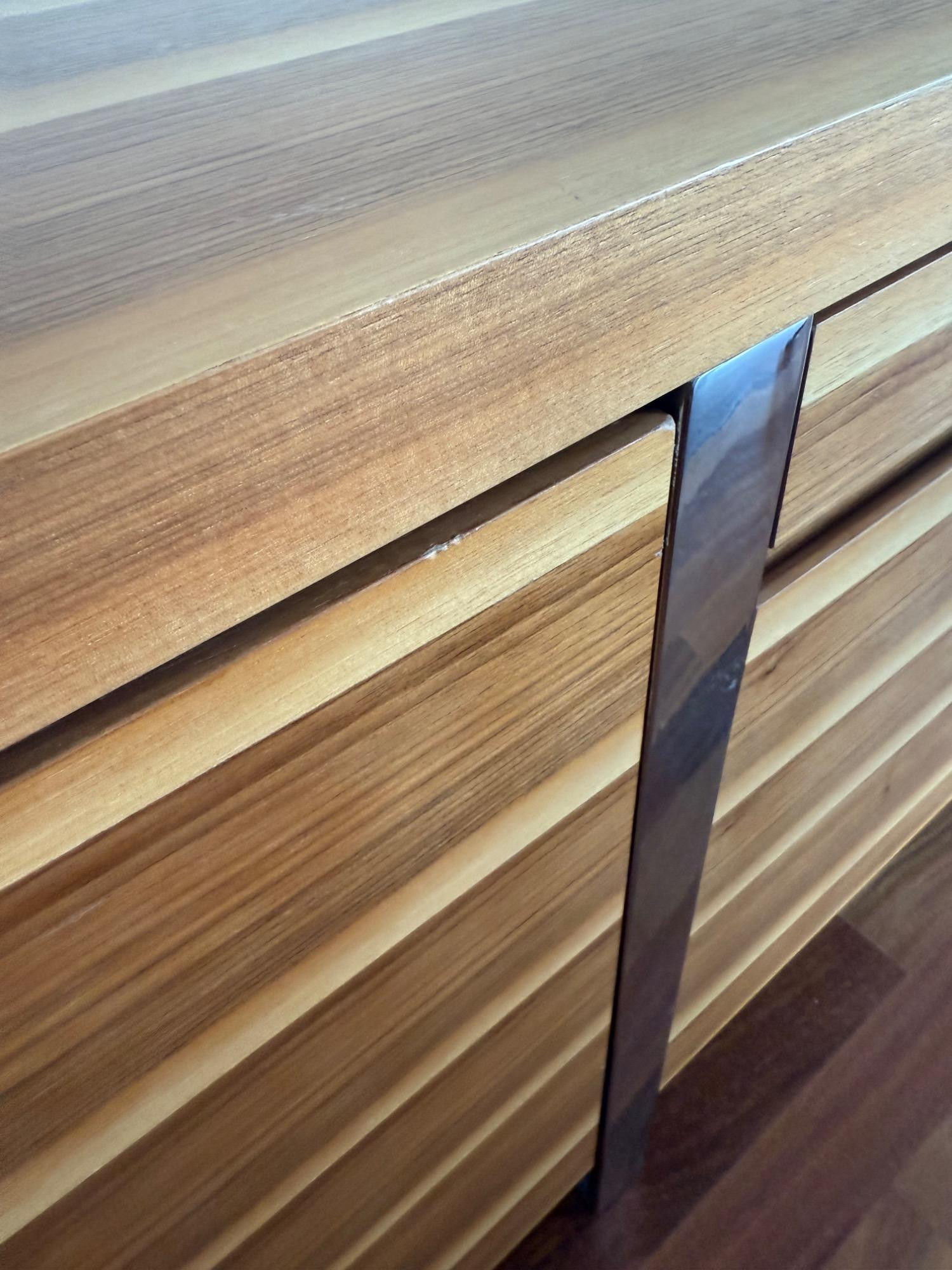 Sierra Walnut Sideboard With Chrome Accents By: Bellini Modern Living Clean, minimalist design and sleek surfaces remarkably enhance the modern feeling of your décor. Four doors and one convenient, spacious drawer suitable for all your crockery storage and extra dinnerware. Light walnut and chrome legs that wrap around the buffet. Please see pictures for any imperfections. Please note: The sideboard matches the dining room table and chairs in lot #1, it comes as a set. Estimated Dimensions: 31” H x 71” W x 18” D Bidding on this lot is an agreement that: (1.) You will have 2 capable, able-bodied persons to lift and load at a minimum. (2.) You will bring a hand truck and/or any other tools needed to remove this item. If these steps are not followed your item will be forfeited and no refund given.