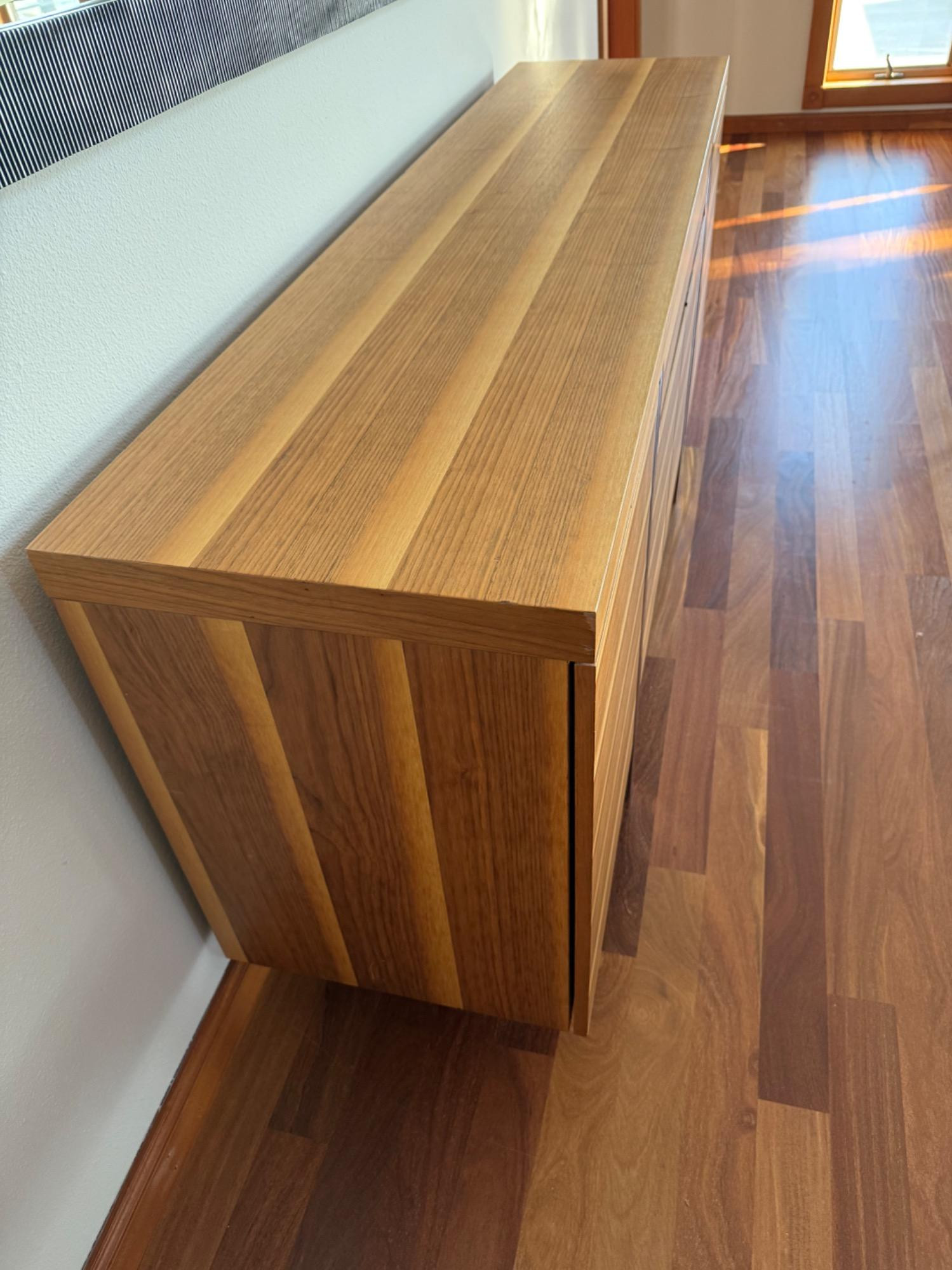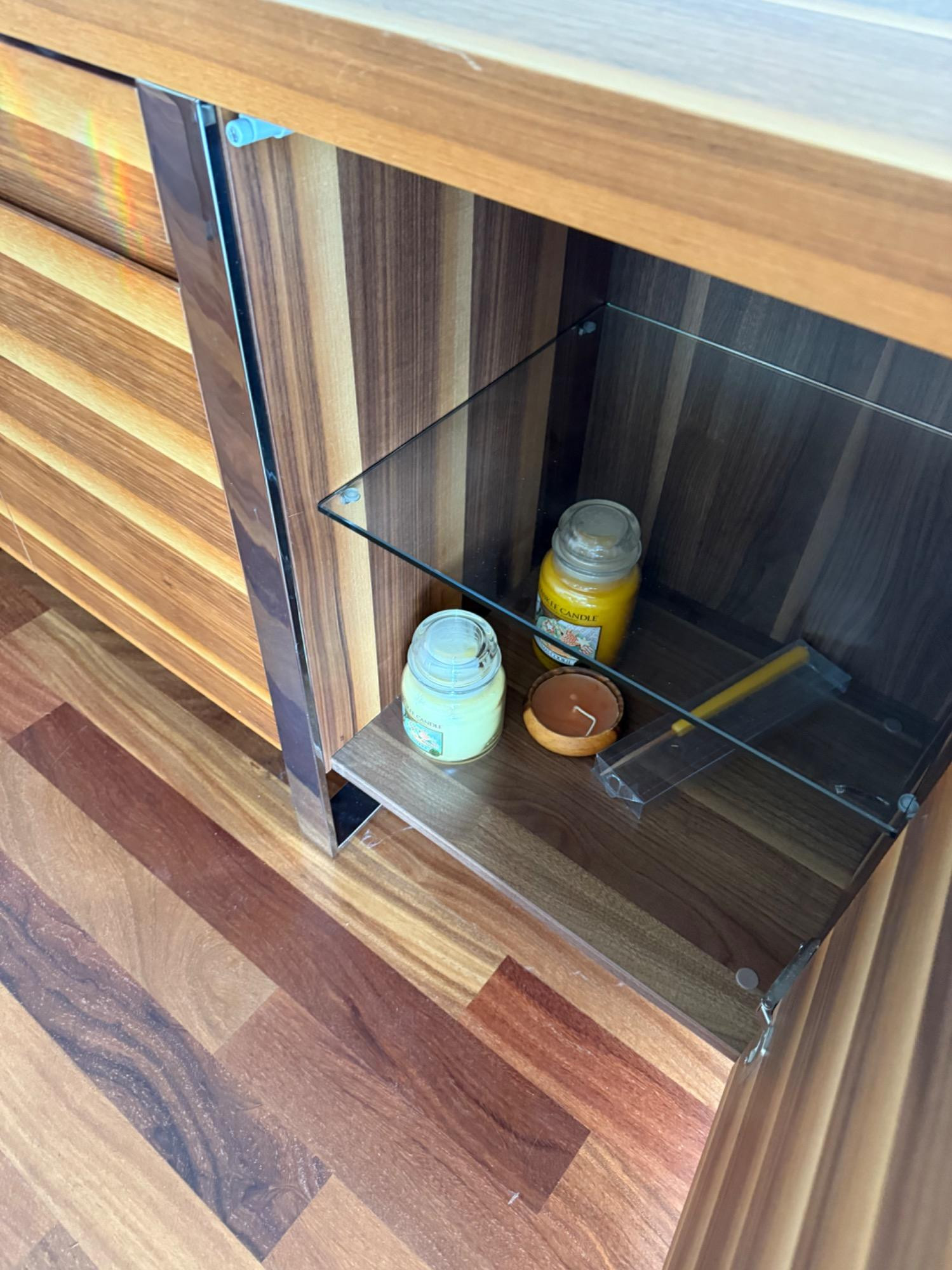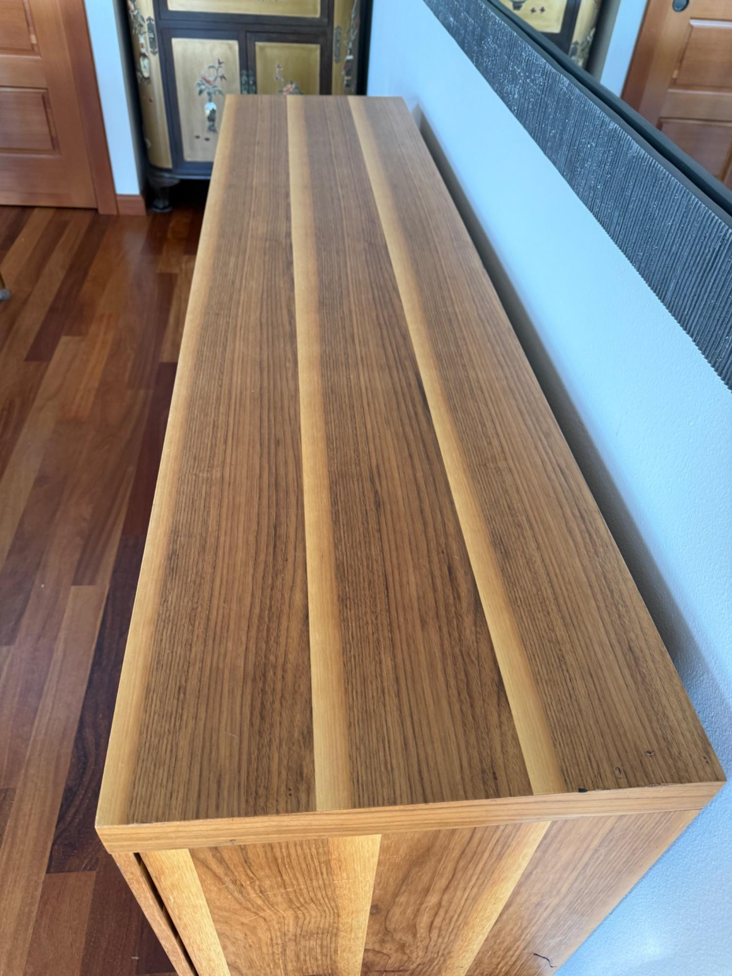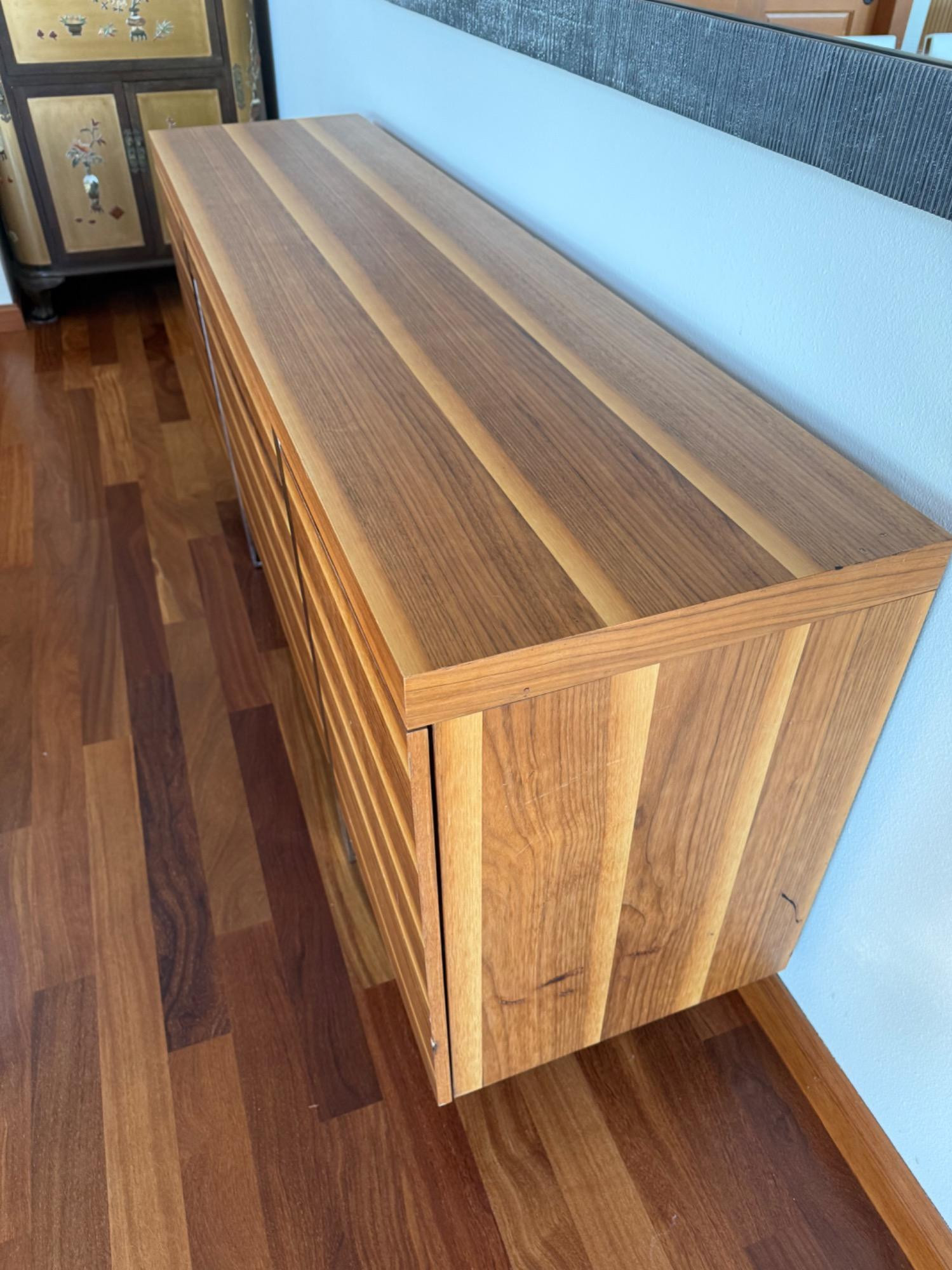 Sierra Walnut Sideboard With Chrome Accents By: Bellini Modern Living Clean, minimalist design and sleek surfaces remarkably enhance the modern feeling of your décor. Four doors and one convenient, spacious drawer suitable for all your crockery storage and extra dinnerware. Light walnut and chrome legs that wrap around the buffet. Please see pictures for any imperfections. Please note: The sideboard matches the dining room table and chairs in lot #1, it comes as a set. Estimated Dimensions: 31” H x 71” W x 18” D Bidding on this lot is an agreement that: (1.) You will have 2 capable, able-bodied persons to lift and load at a minimum. (2.) You will bring a hand truck and/or any other tools needed to remove this item. If these steps are not followed your item will be forfeited and no refund given.