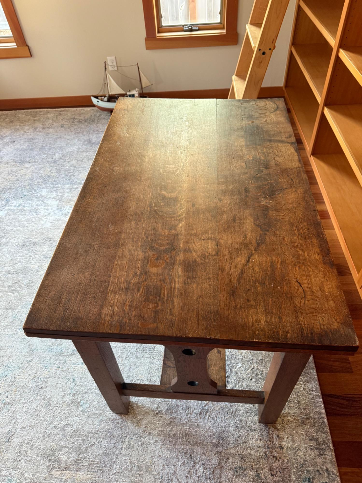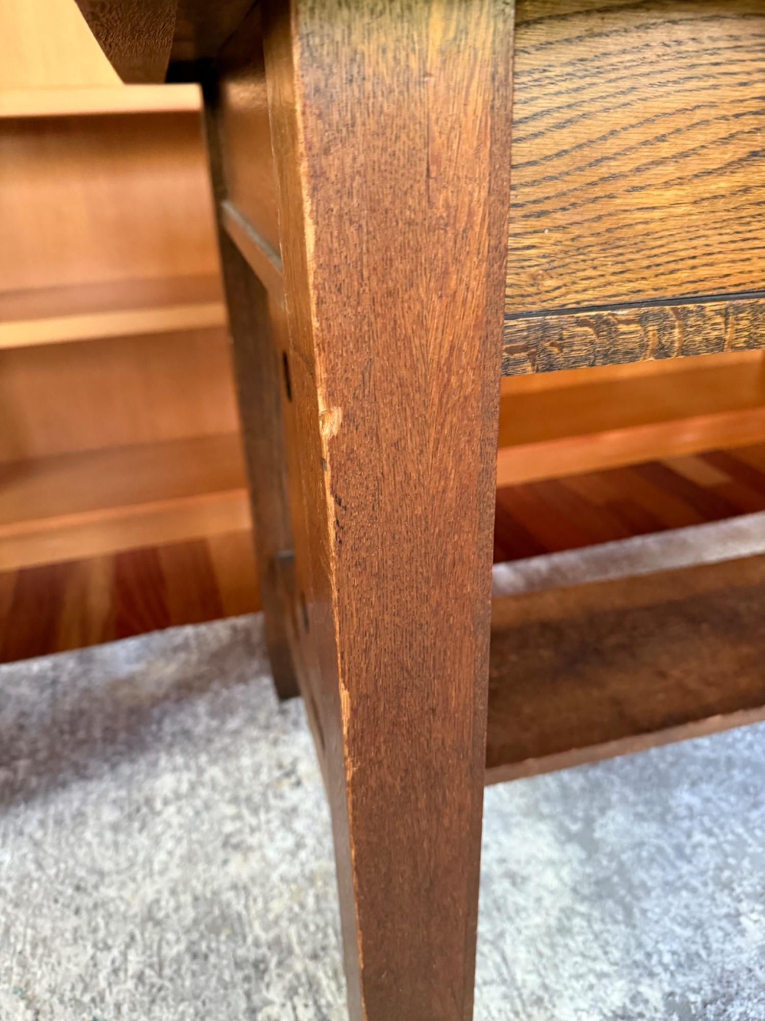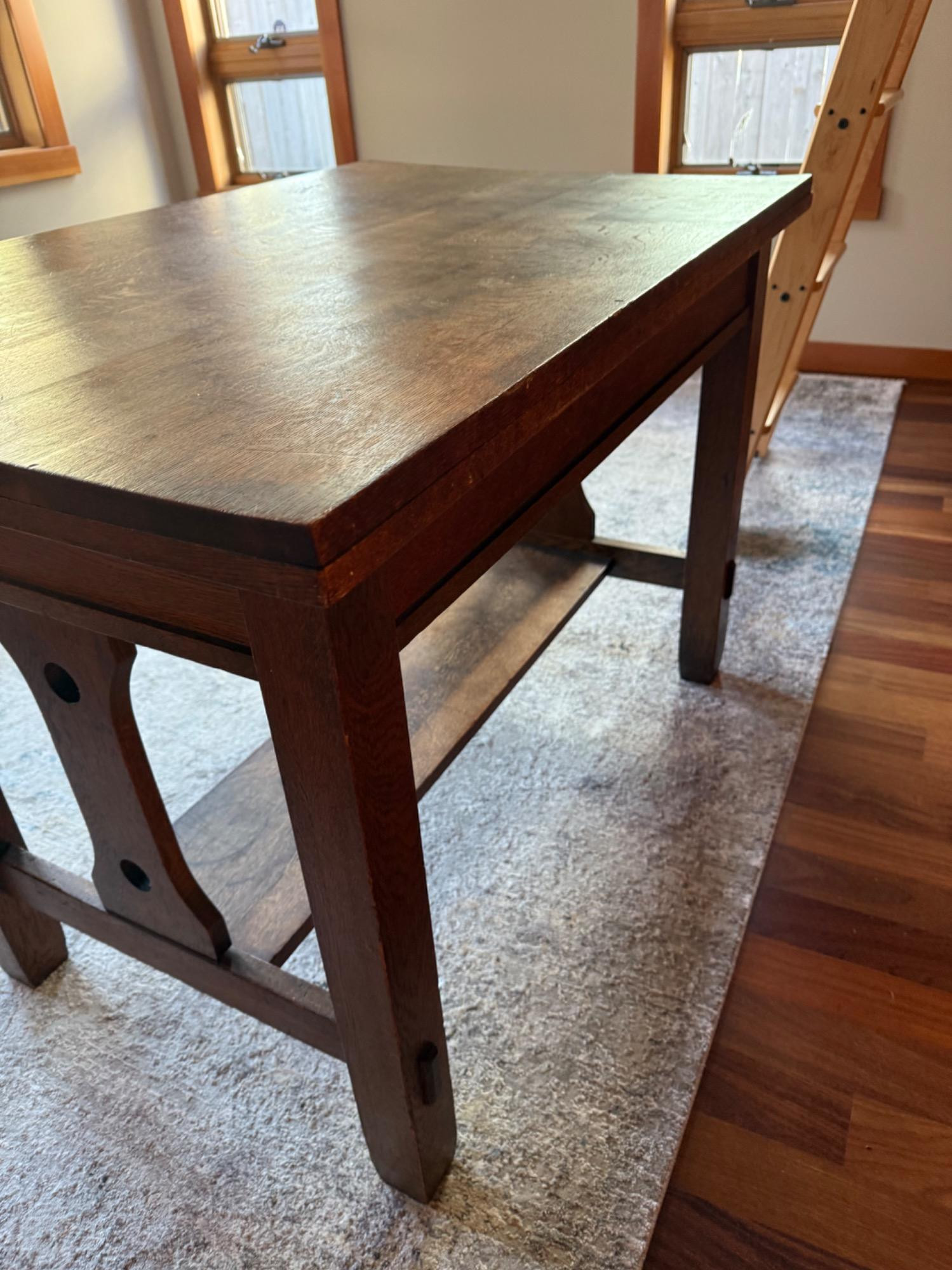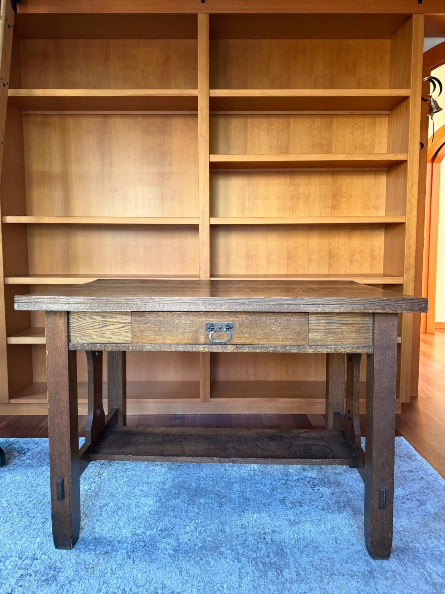 This stunning Craftsman-style desk is crafted from solid wood and showcases a timeless design with sturdy construction. Measuring 43.5 inches wide, 27.5 inches deep, and 30 inches tall, it features a practical drawer with a classic metal pull. Perfect as a writing desk, workspace, or decorative accent, this piece brings vintage charm and functionality to any home or office. Bidding on this lot is an agreement that: (1.) You will have 2 capable, able-bodied persons to lift and load at a minimum. (2.) You will bring a hand truck and/or any other tools needed to remove this item. If these steps are not followed your item will be forfeited and no refund given.