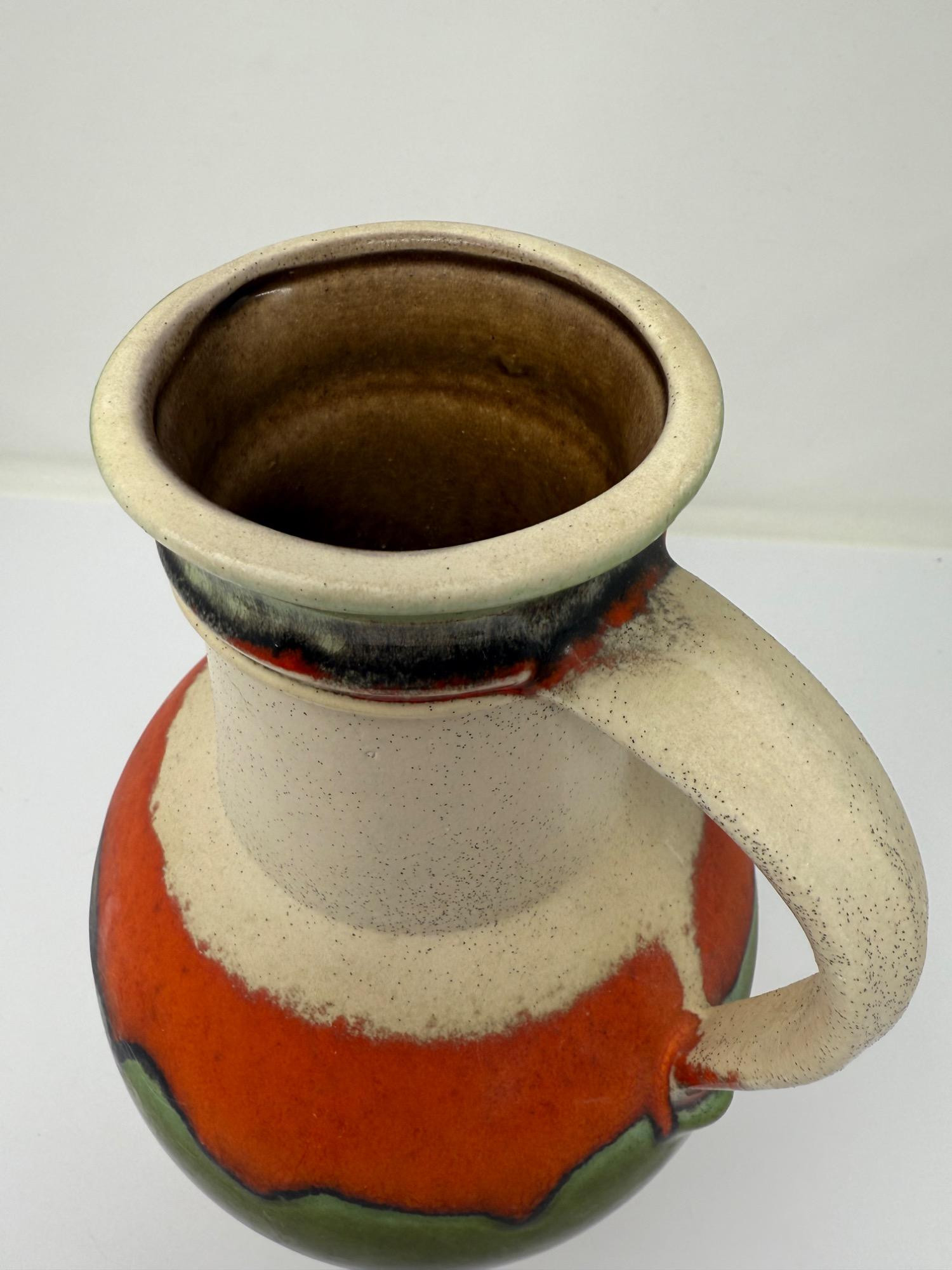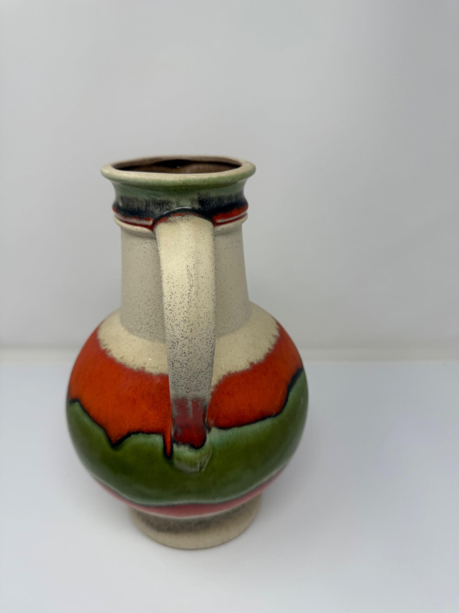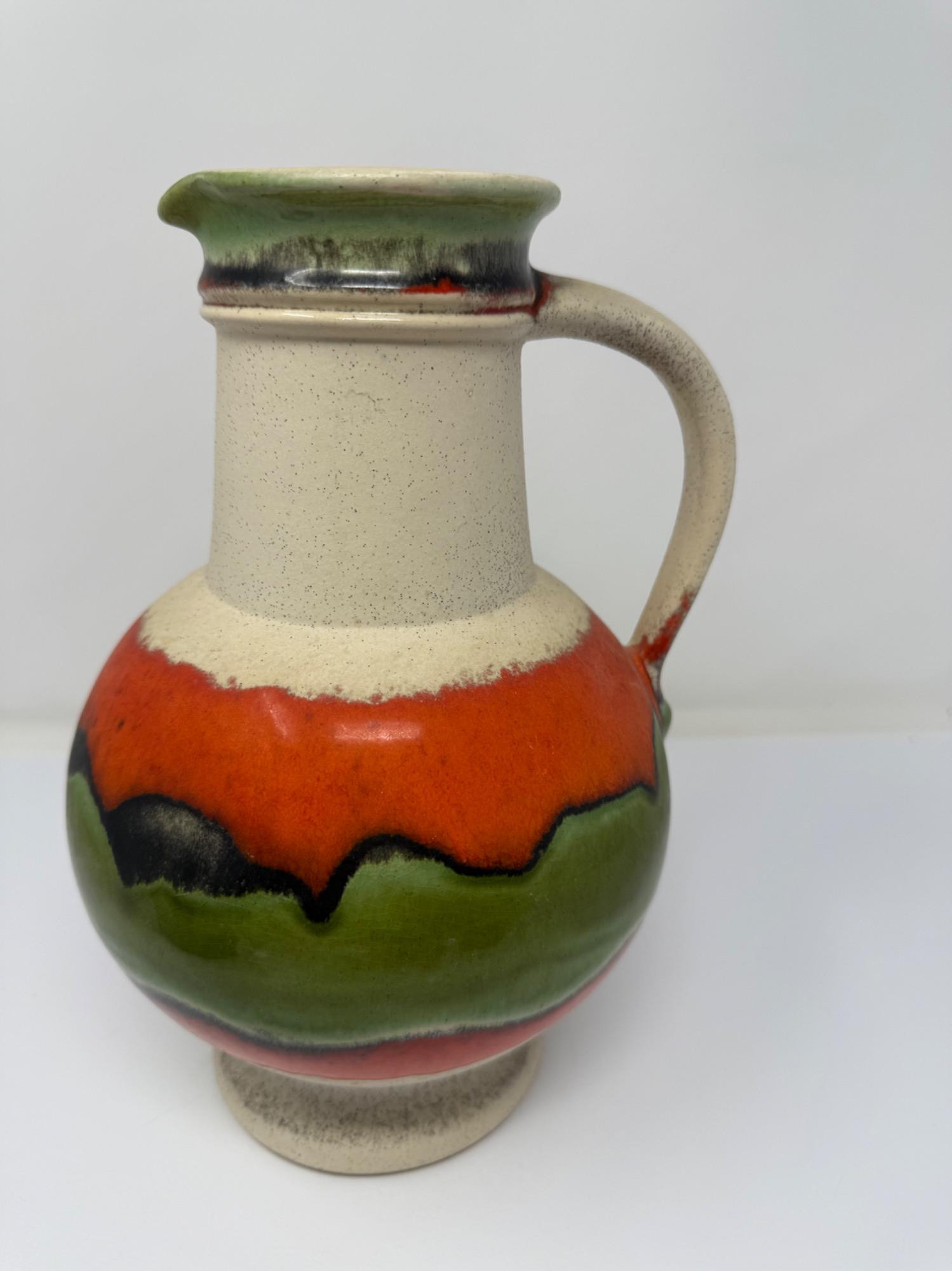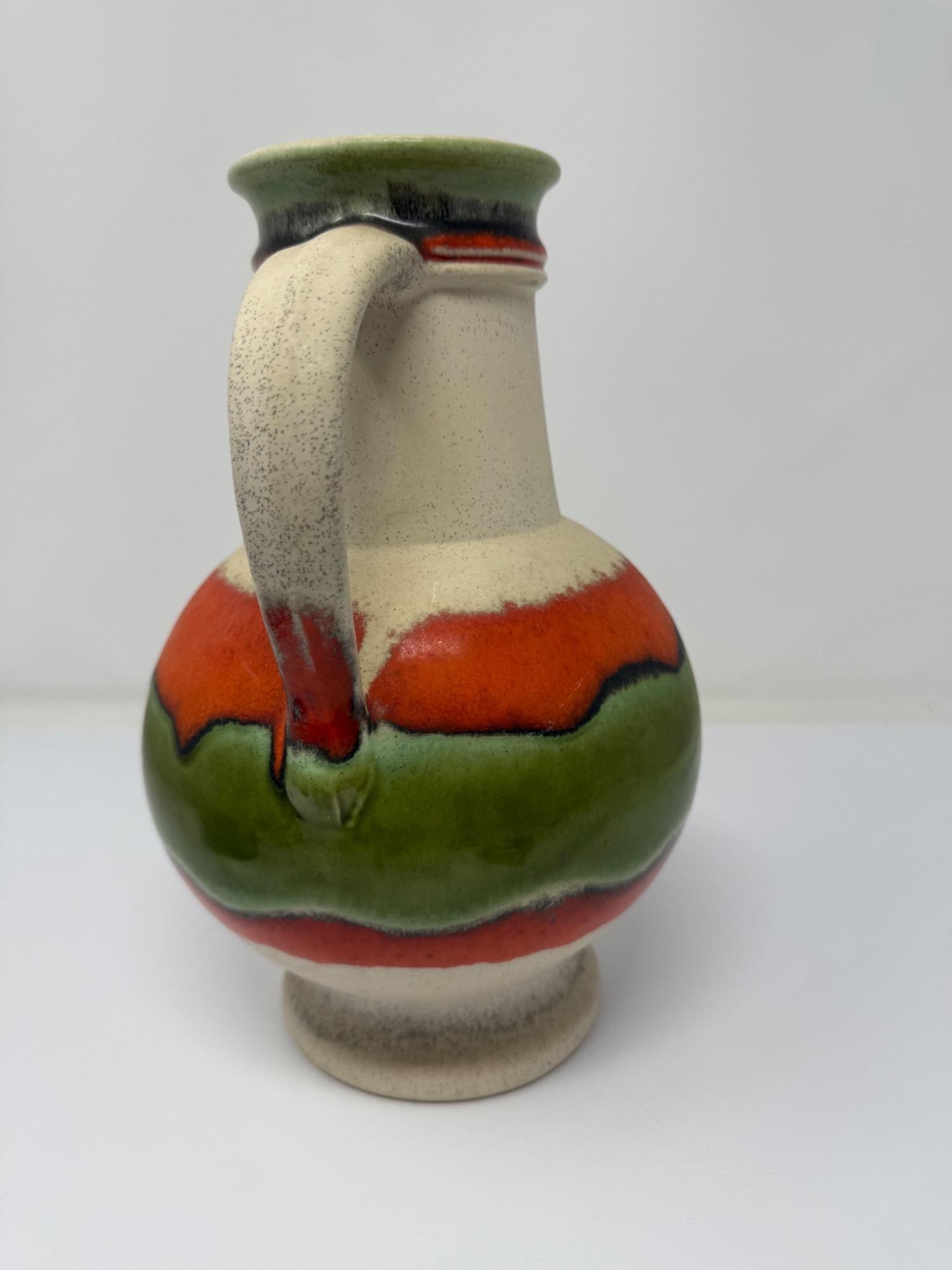 This stunning vintage pottery pitcher by Uebelacker Keramik, measuring 10.5 inches tall and 7 inches wide. Made in West Germany, it features a vibrant hand-glazed design with earthy tones of red, green, and black that beautifully contrast the natural ceramic base. Era-1970