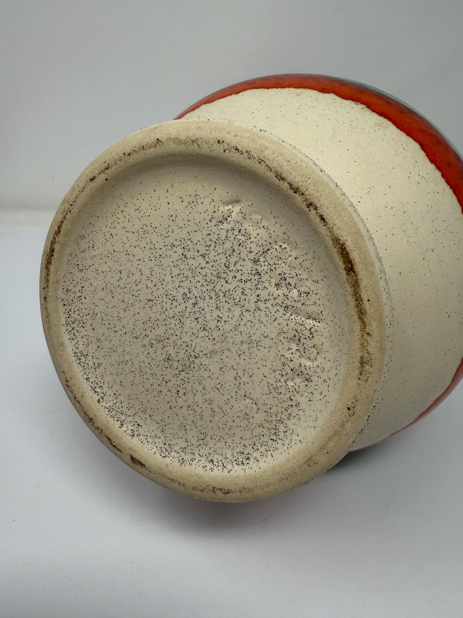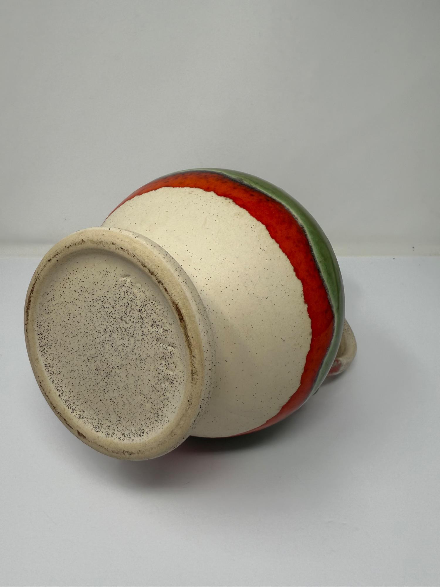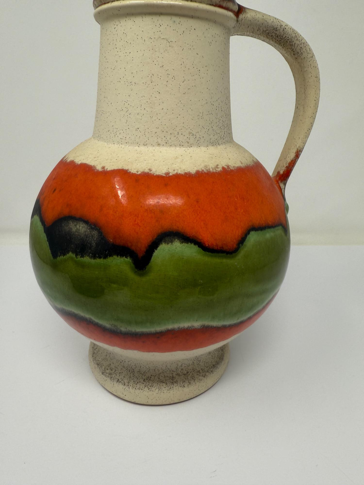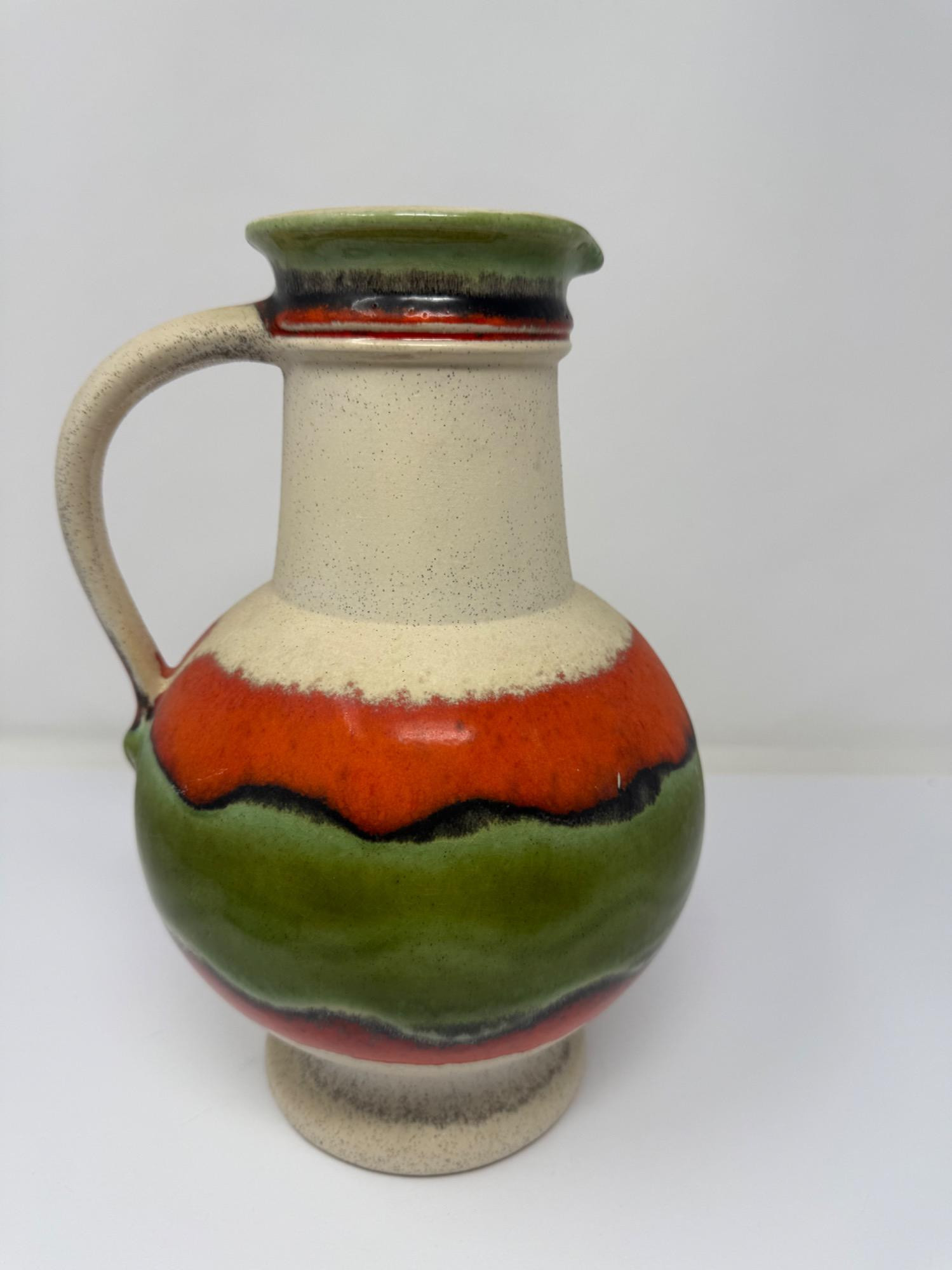 This stunning vintage pottery pitcher by Uebelacker Keramik, measuring 10.5 inches tall and 7 inches wide. Made in West Germany, it features a vibrant hand-glazed design with earthy tones of red, green, and black that beautifully contrast the natural ceramic base. Era-1970