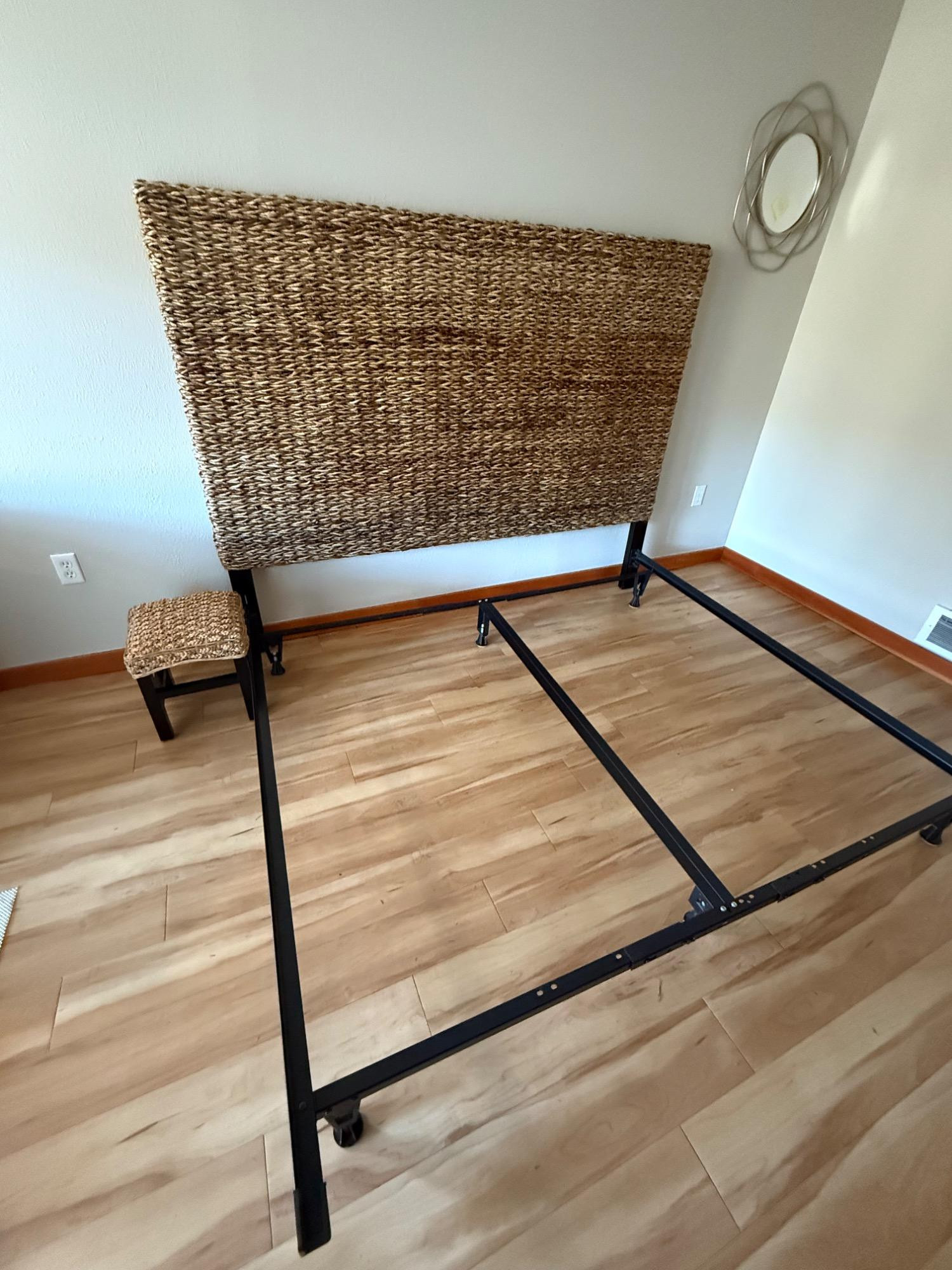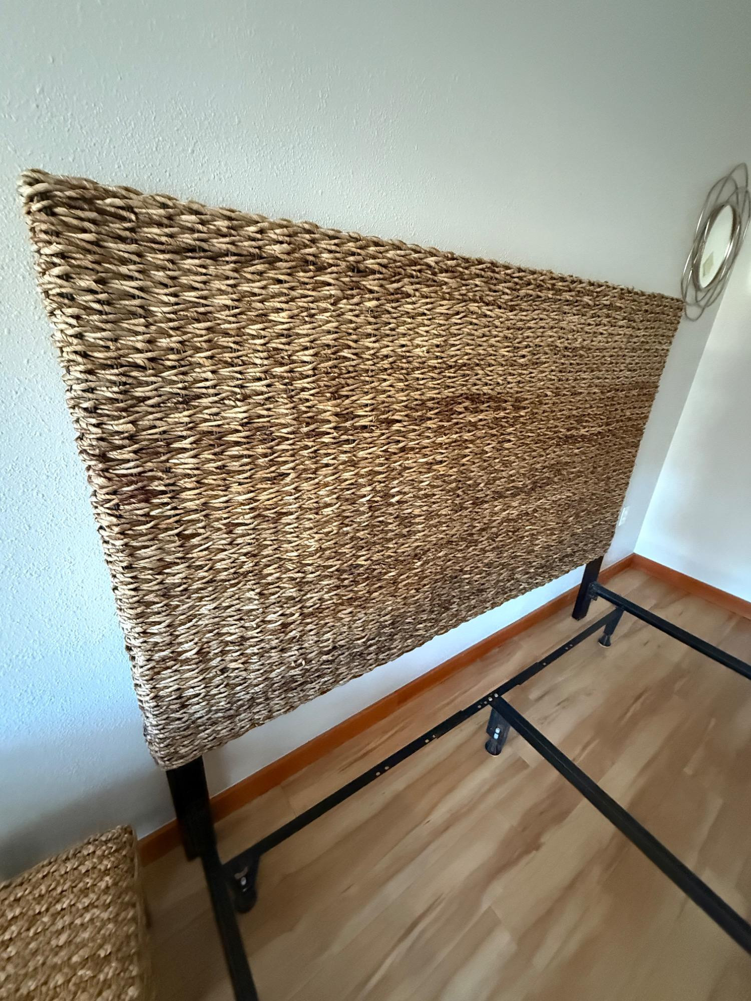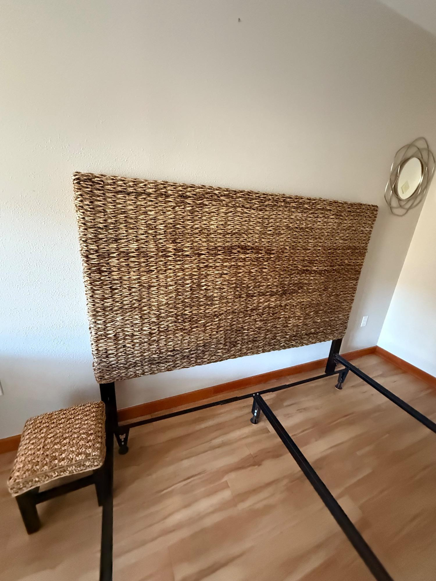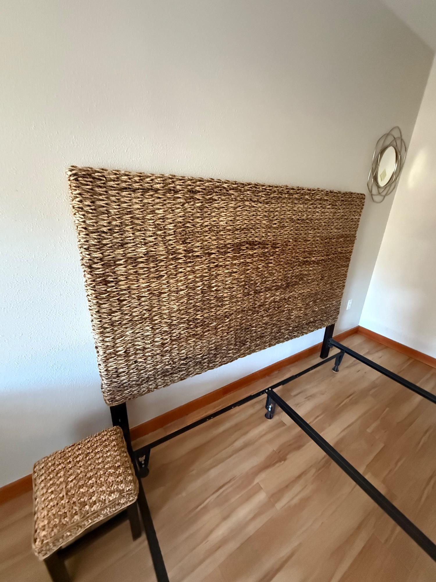 Wicker Headboard (King) & Matching Stool. This beautiful wicker set includes a large headboard and a matching stool, perfect for adding a touch of natural elegance to your bedroom. Headboard Dimensions: 61 inches tall x 80 inches wide, ideal for queen or king-sized beds. Stool Dimensions: 15 inches tall x 14 inches wide and deep, versatile as a seating or accent piece. The intricate woven design and warm tones create a relaxed, coastal-inspired look, making this set both functional and stylish. Bidding on this lot is an agreement that: (1.) You will have 2 capable, able-bodied persons to lift and load at a minimum. (2.) You will bring a hand truck and/or any other tools needed to remove this item. If these steps are not followed your item will be forfeited and no refund given.