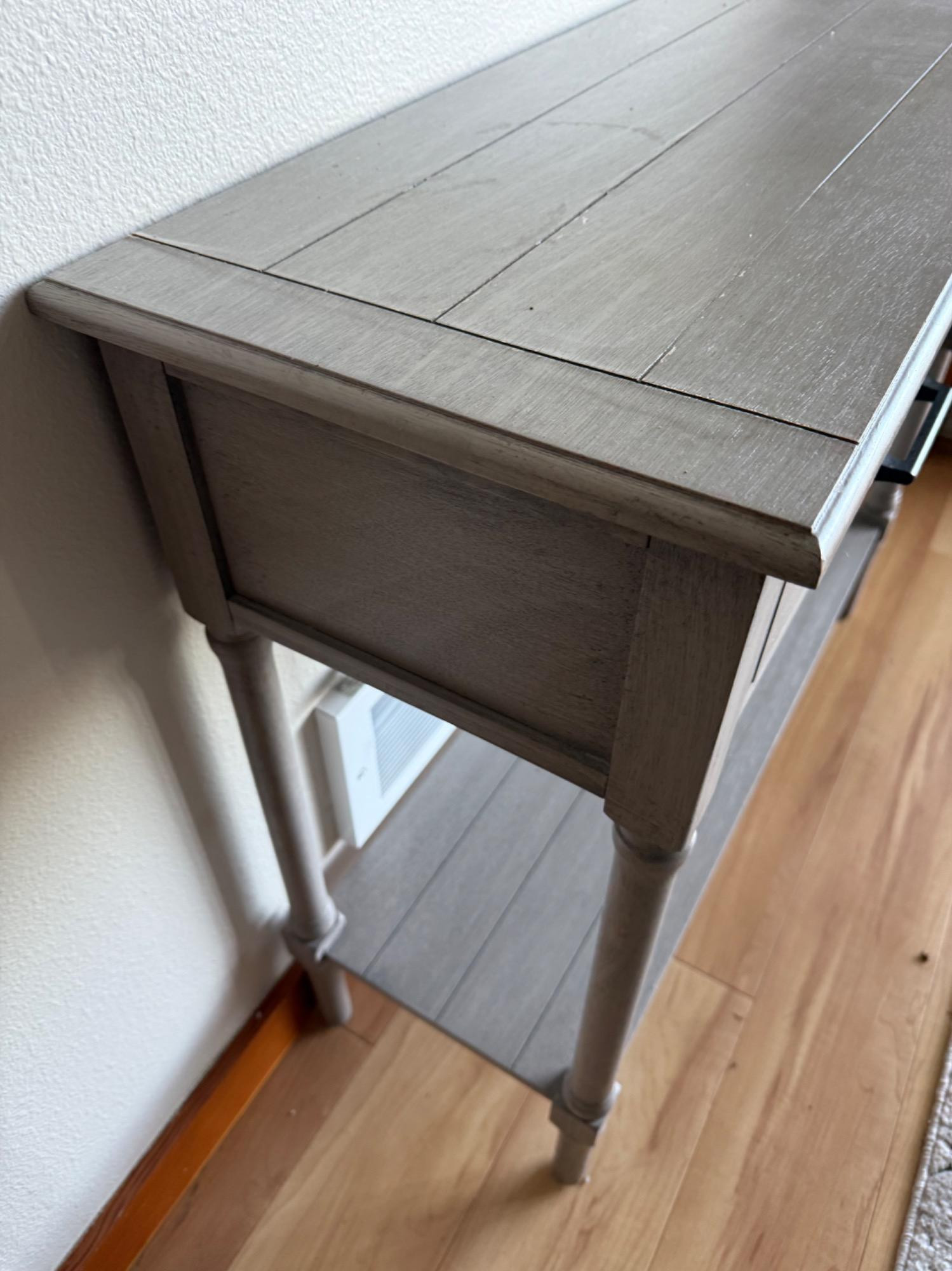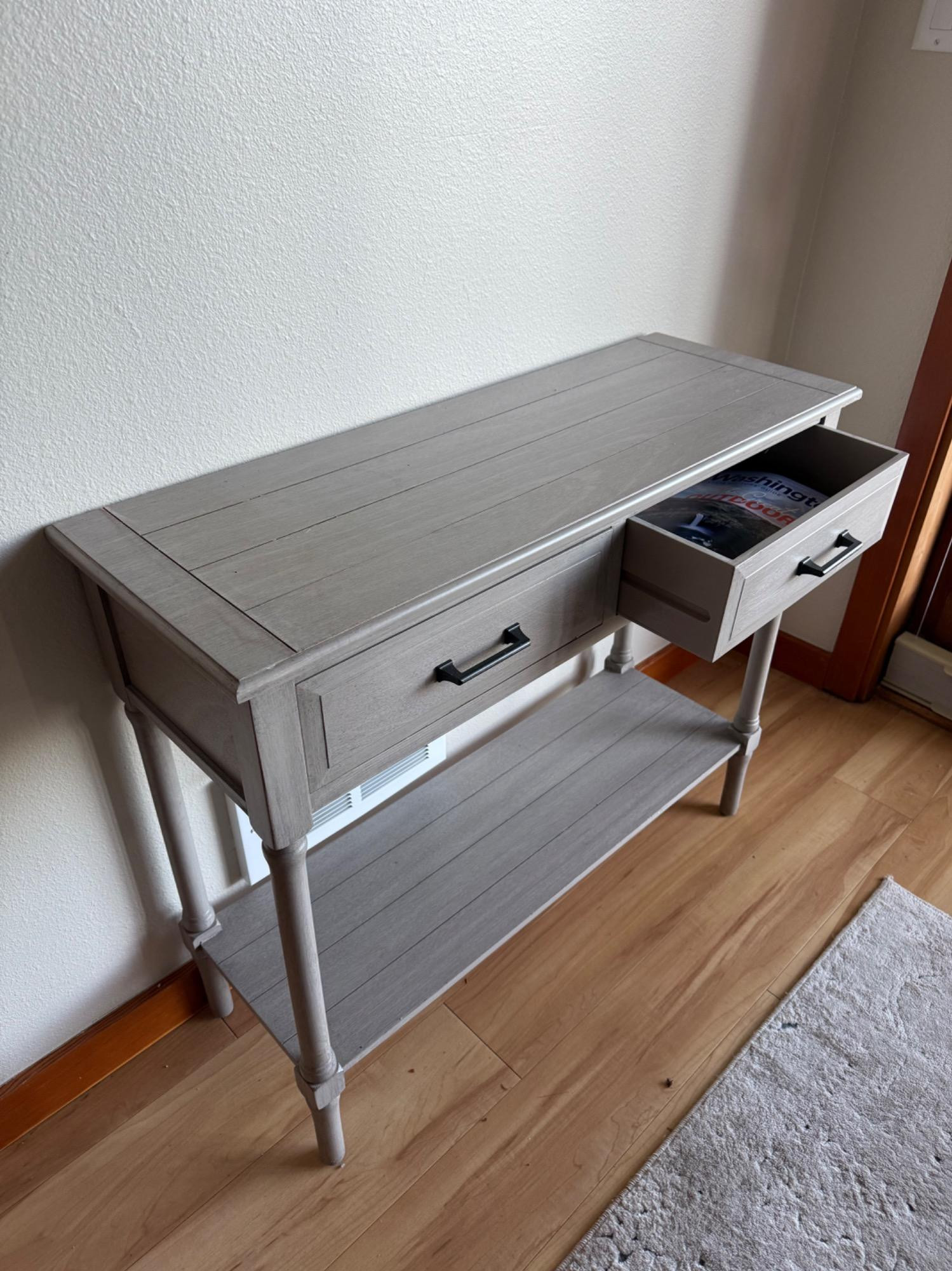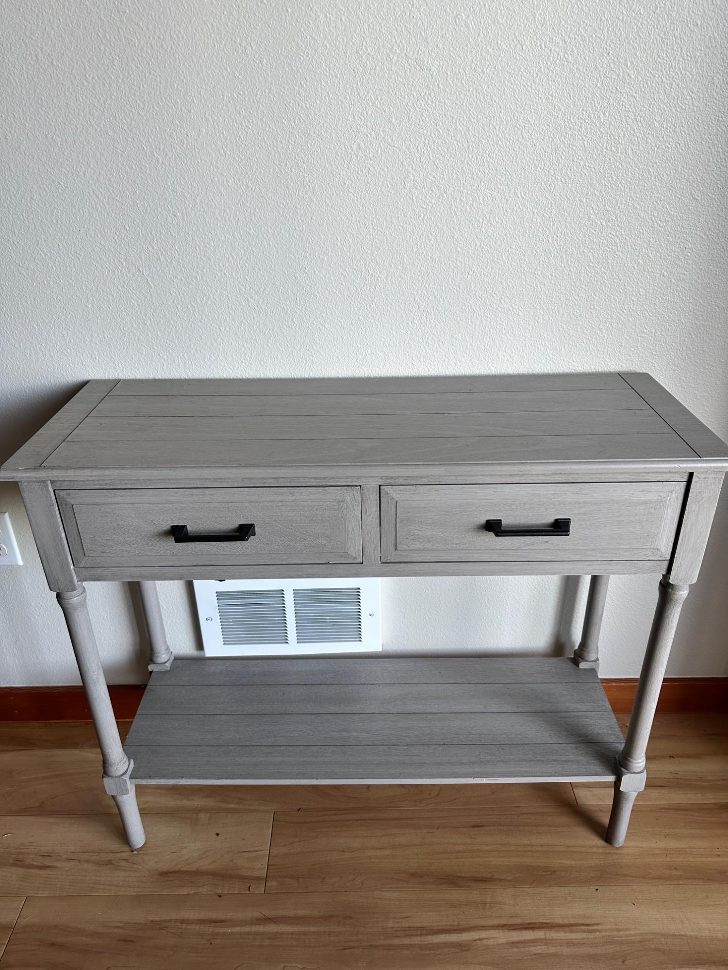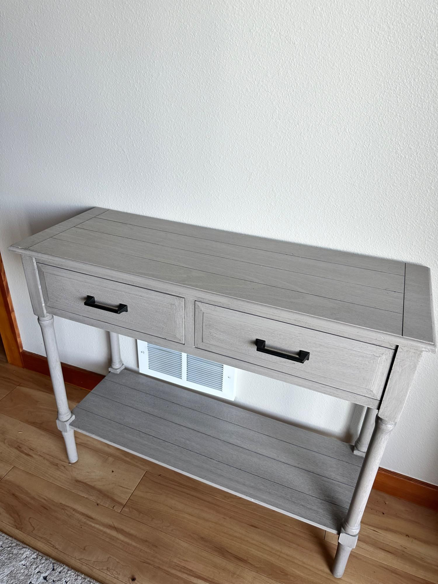Filbert-Style 2-Drawer Console Table – White-Washed Gray. This charming Filbert-style console table features a white-washed gray finish, offering a rustic yet refined look. Measuring 30 inches tall, 36 inches wide, and 13 inches deep, it includes two spacious drawers with black metal handles and a lower open shelf for storage or display. Bidding on this lot is an agreement that: (1.) You will have 2 capable, able-bodied persons to lift and load at a minimum. (2.) You will bring a hand truck and/or any other tools needed to remove this item. If these steps are not followed your item will be forfeited and no refund given.