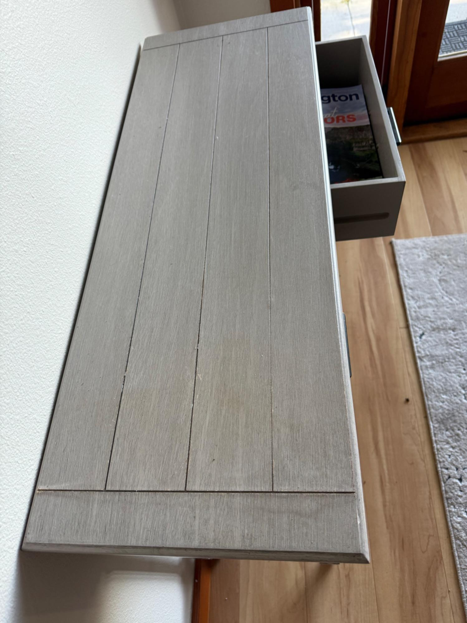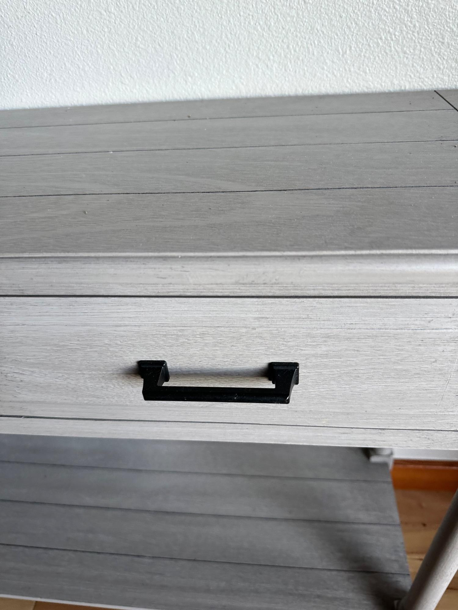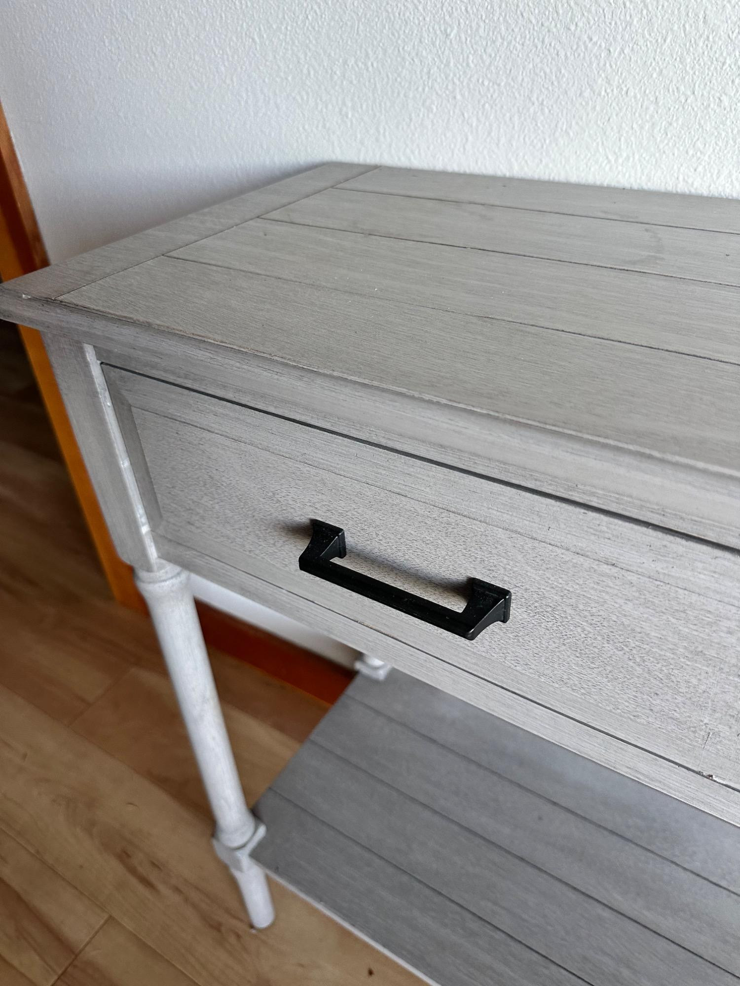 Filbert-Style 2-Drawer Console Table – White-Washed Gray. This charming Filbert-style console table features a white-washed gray finish, offering a rustic yet refined look. Measuring 30 inches tall, 36 inches wide, and 13 inches deep, it includes two spacious drawers with black metal handles and a lower open shelf for storage or display. Bidding on this lot is an agreement that: (1.) You will have 2 capable, able-bodied persons to lift and load at a minimum. (2.) You will bring a hand truck and/or any other tools needed to remove this item. If these steps are not followed your item will be forfeited and no refund given.