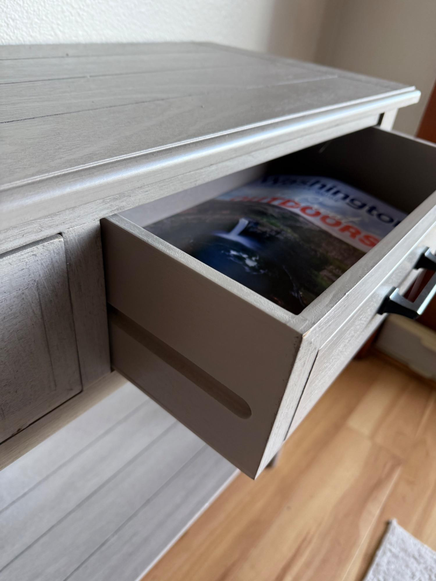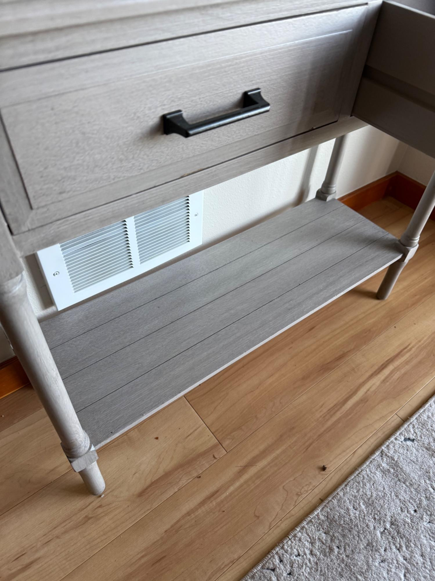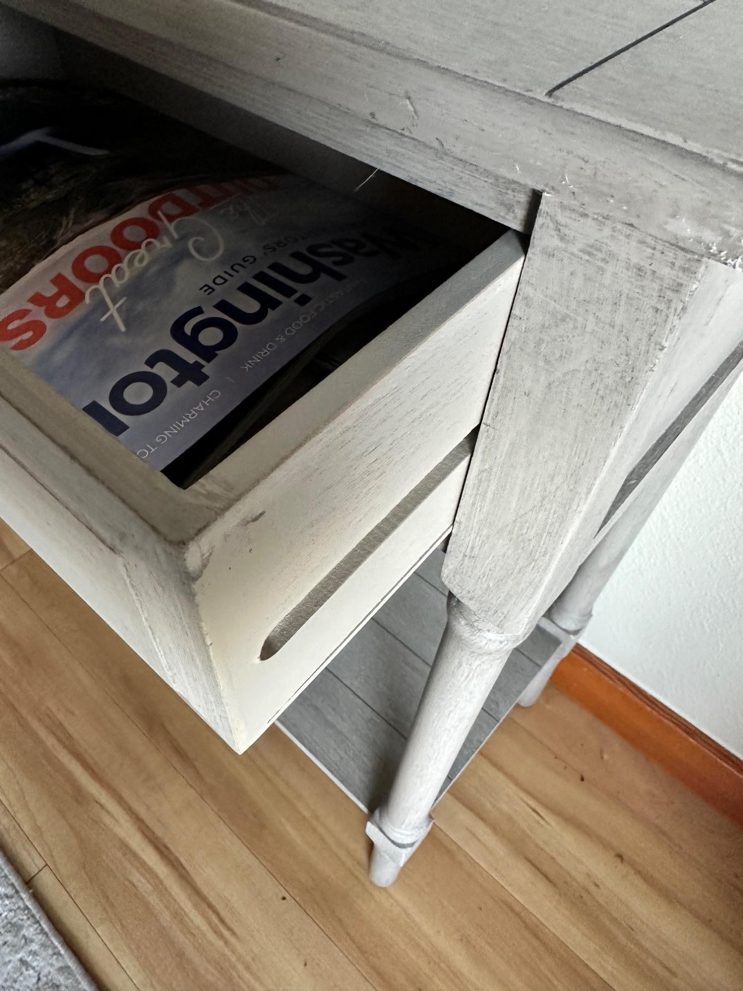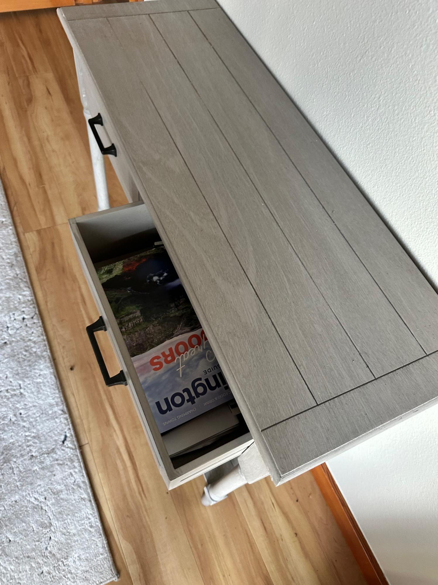 Filbert-Style 2-Drawer Console Table – White-Washed Gray. This charming Filbert-style console table features a white-washed gray finish, offering a rustic yet refined look. Measuring 30 inches tall, 36 inches wide, and 13 inches deep, it includes two spacious drawers with black metal handles and a lower open shelf for storage or display. Bidding on this lot is an agreement that: (1.) You will have 2 capable, able-bodied persons to lift and load at a minimum. (2.) You will bring a hand truck and/or any other tools needed to remove this item. If these steps are not followed your item will be forfeited and no refund given.