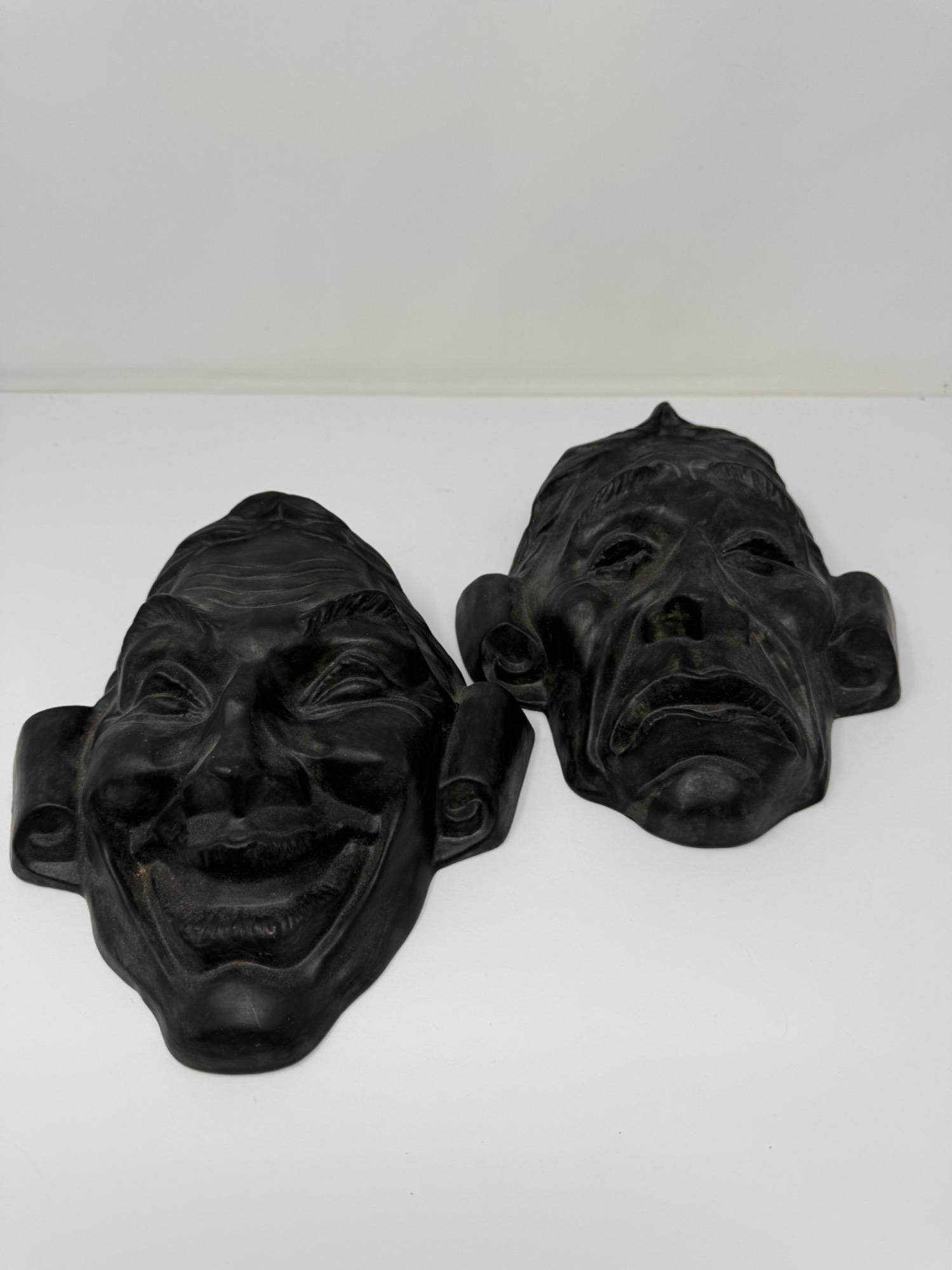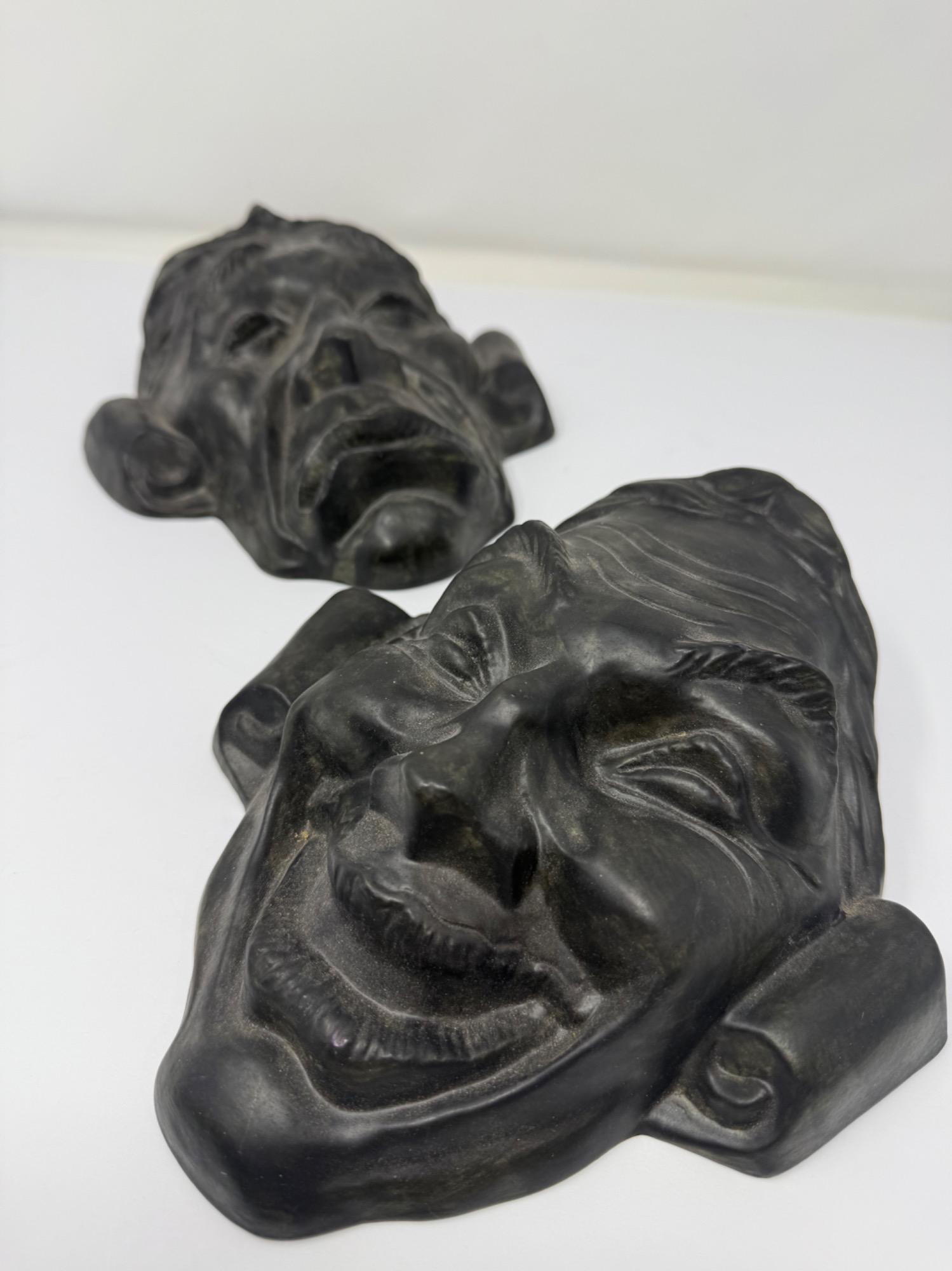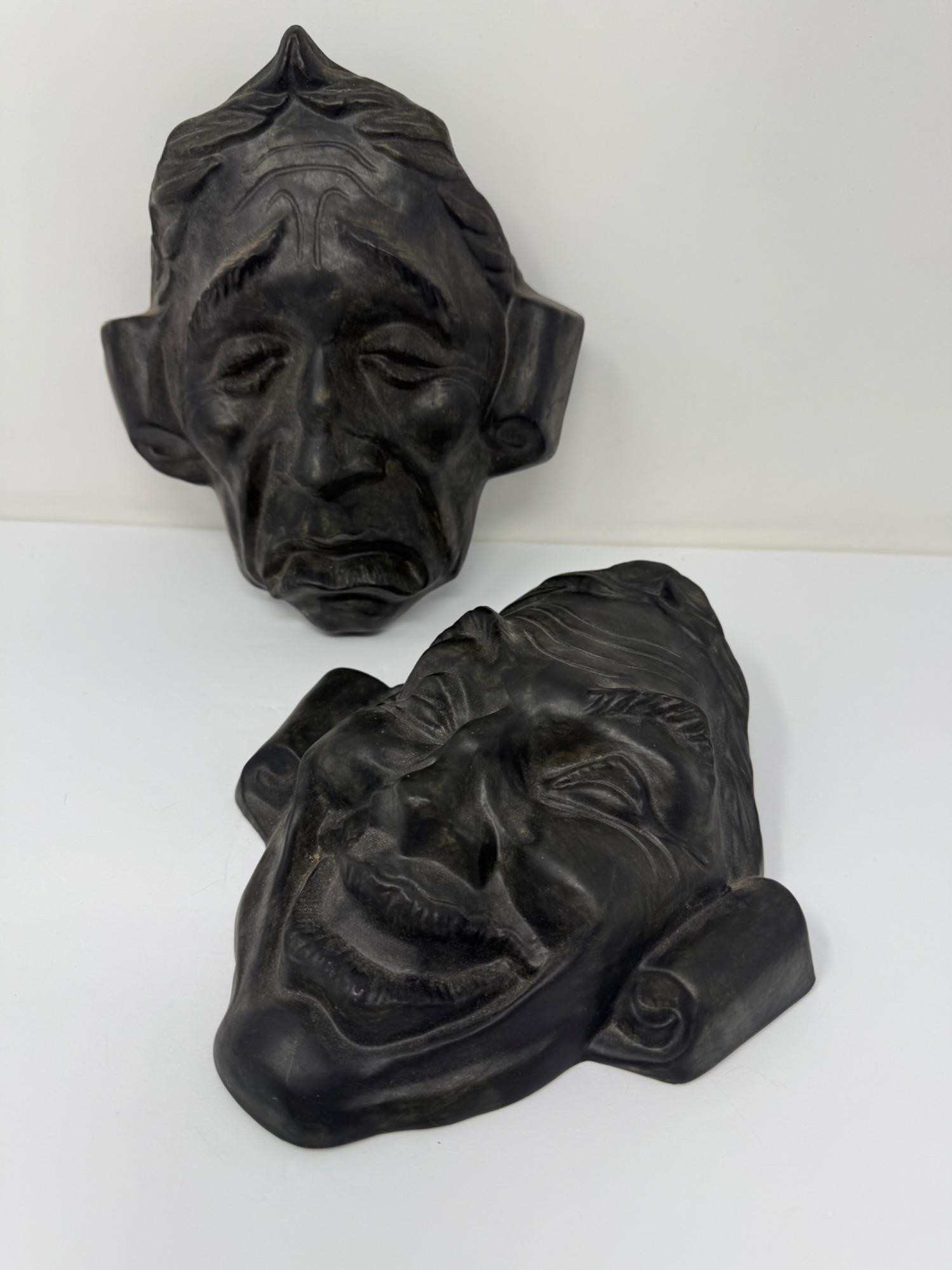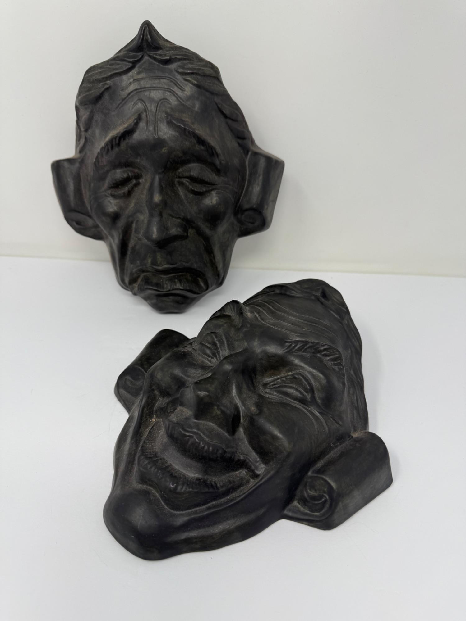 Set of Two Expressionist Face Flower Wall Pockets – 9.5" x 8" This unique set of two face wall hangings captures contrasting emotions with intricate craftsmanship. Each piece measures 9.5 inches tall by 8 inches wide and showcases striking details that evoke both laughter and sorrow. Made from a durable material with a rich, dark finish, these artistic wall hangings are perfect for adding character and drama to any space. Ideal for collectors or those looking for statement pieces to enhance their décor.