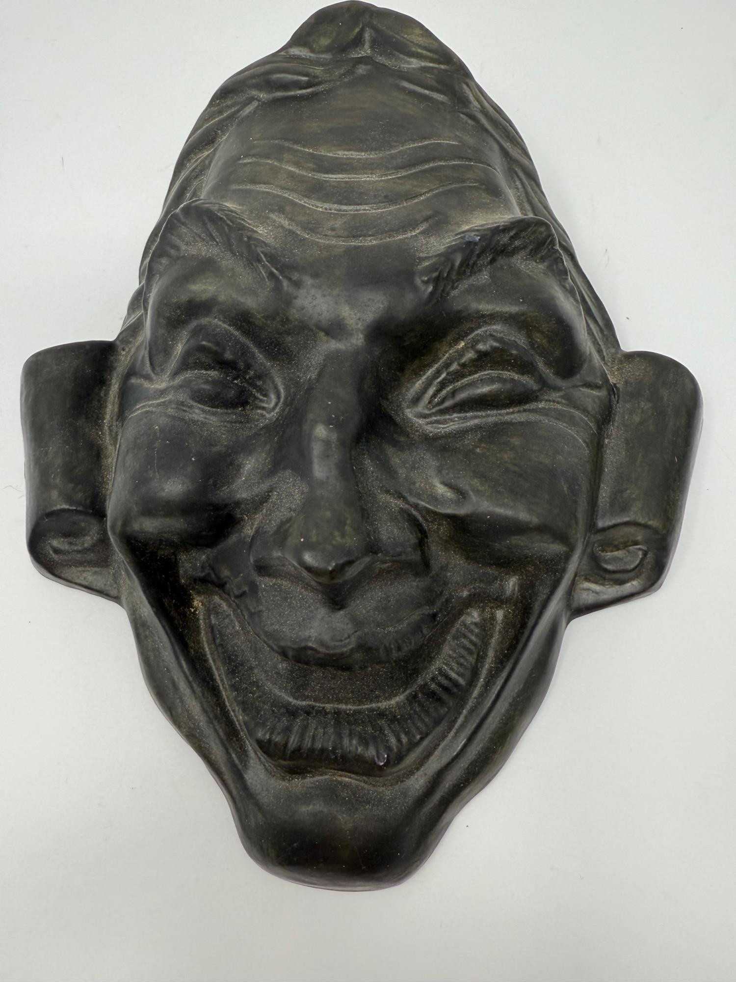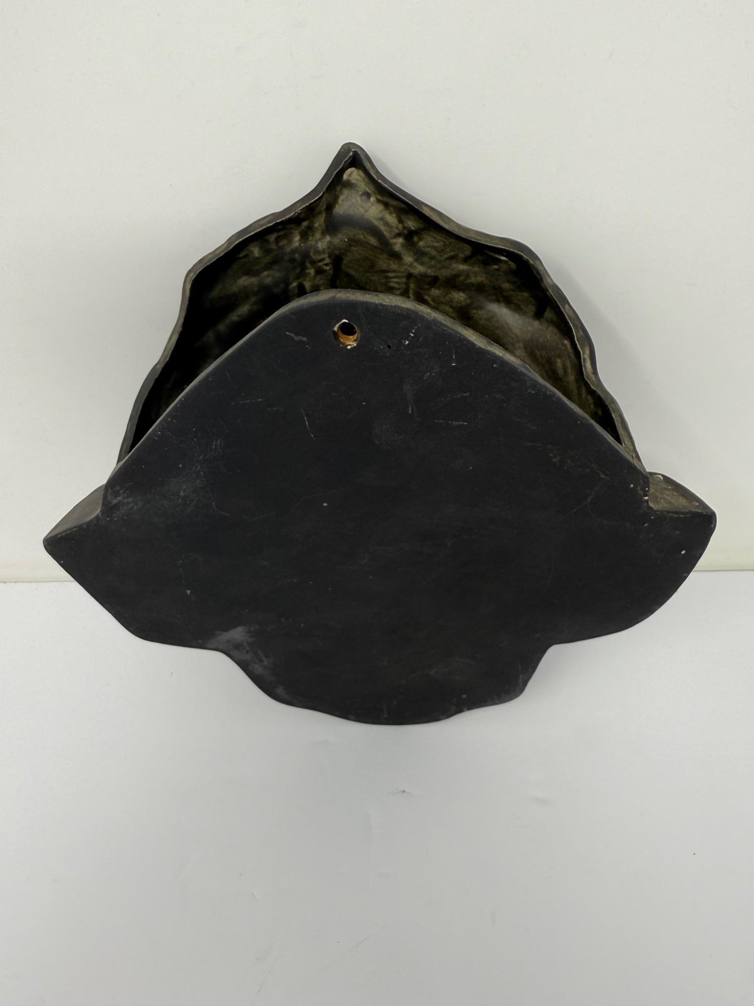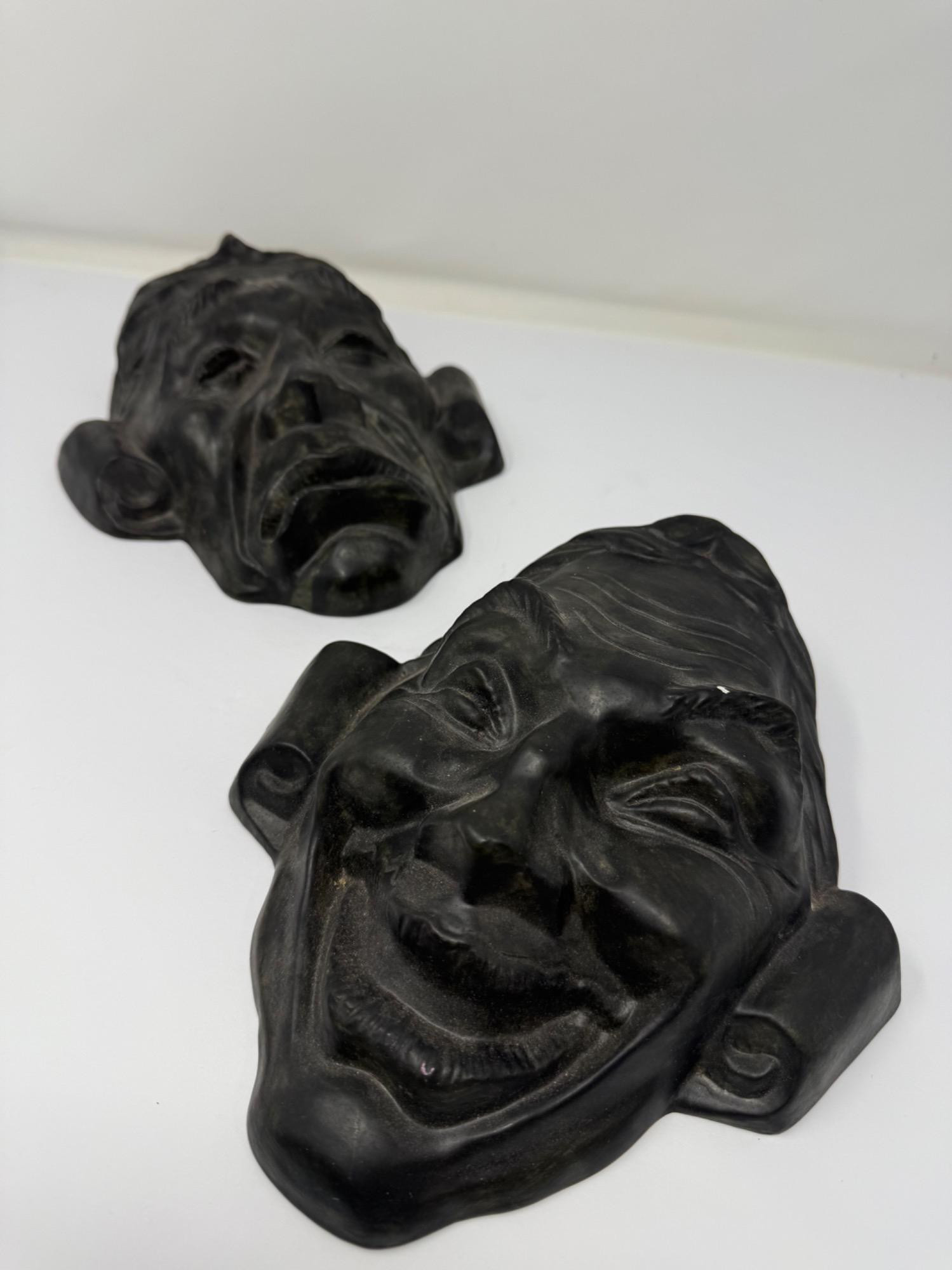 Set of Two Expressionist Face Flower Wall Pockets – 9.5" x 8" This unique set of two face wall hangings captures contrasting emotions with intricate craftsmanship. Each piece measures 9.5 inches tall by 8 inches wide and showcases striking details that evoke both laughter and sorrow. Made from a durable material with a rich, dark finish, these artistic wall hangings are perfect for adding character and drama to any space. Ideal for collectors or those looking for statement pieces to enhance their décor.