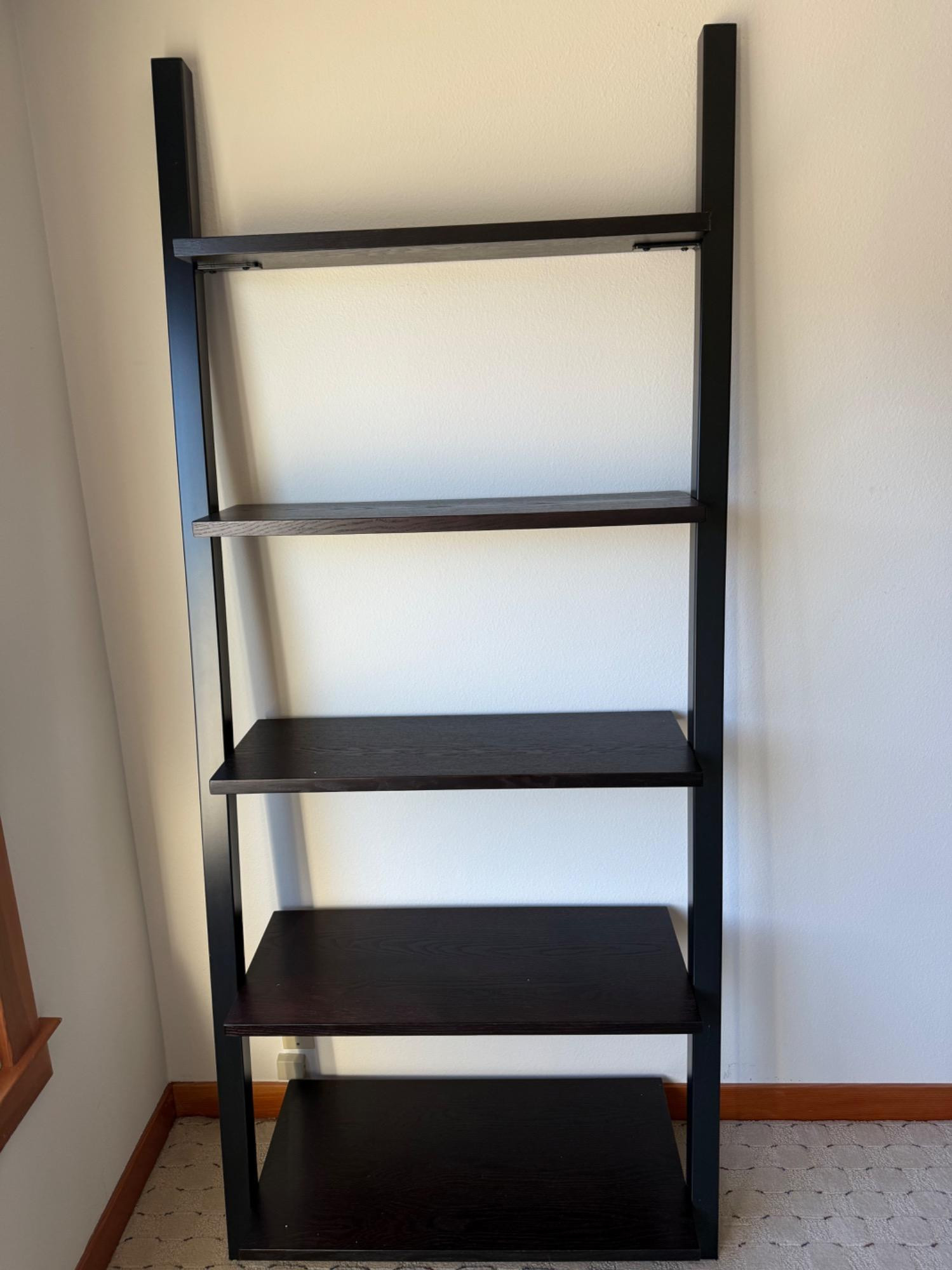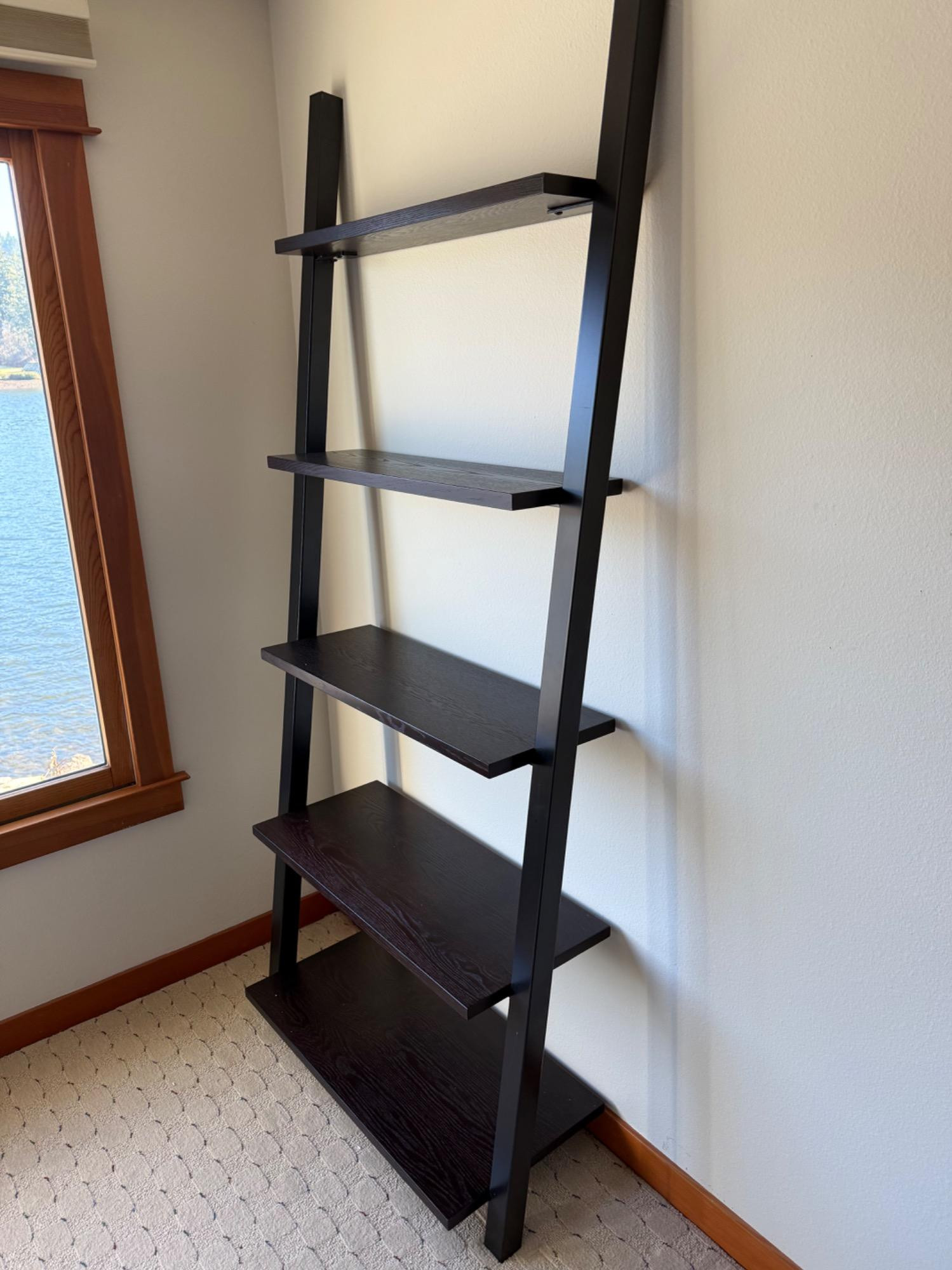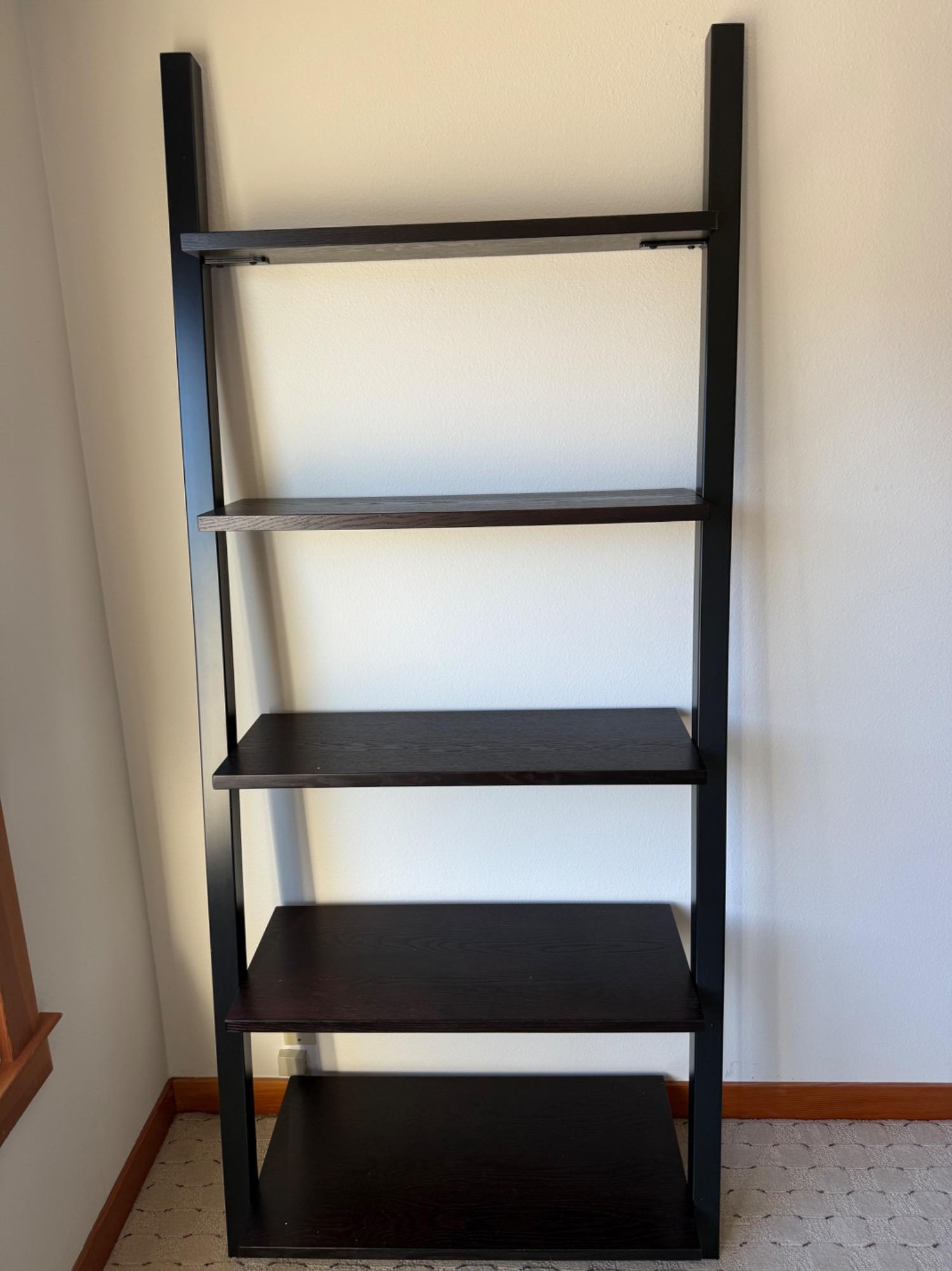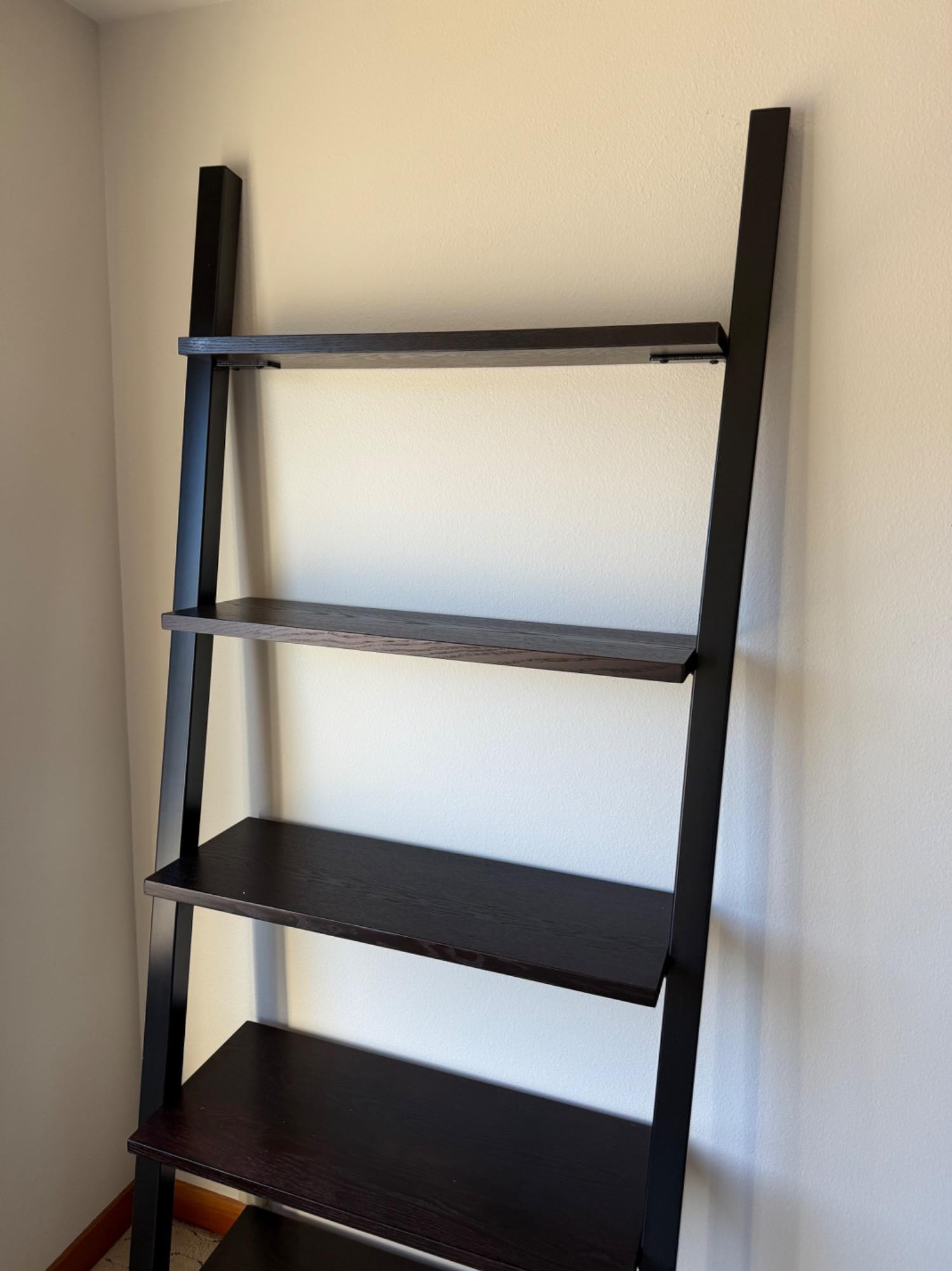This sleek and modern ladder bookshelf offers a stylish and functional storage solution. Measuring 81 inches tall, 35.75 inches wide, and 16 inches deep, it provides ample space across multiple shelves for books, décor, or collectibles. The contemporary design features clean lines and a sturdy frame, making it a perfect addition to any living room, office, or bedroom. Its minimalist style easily complements a variety of interior designs while maximizing vertical space. A versatile and chic piece for any home! Bidding on this lot is an agreement that: (1.) You will have 2 capable, able-bodied persons to lift and load at a minimum. (2.) You will bring a hand truck and/or any other tools needed to remove this item. If these steps are not followed your item will be forfeited and no refund given.