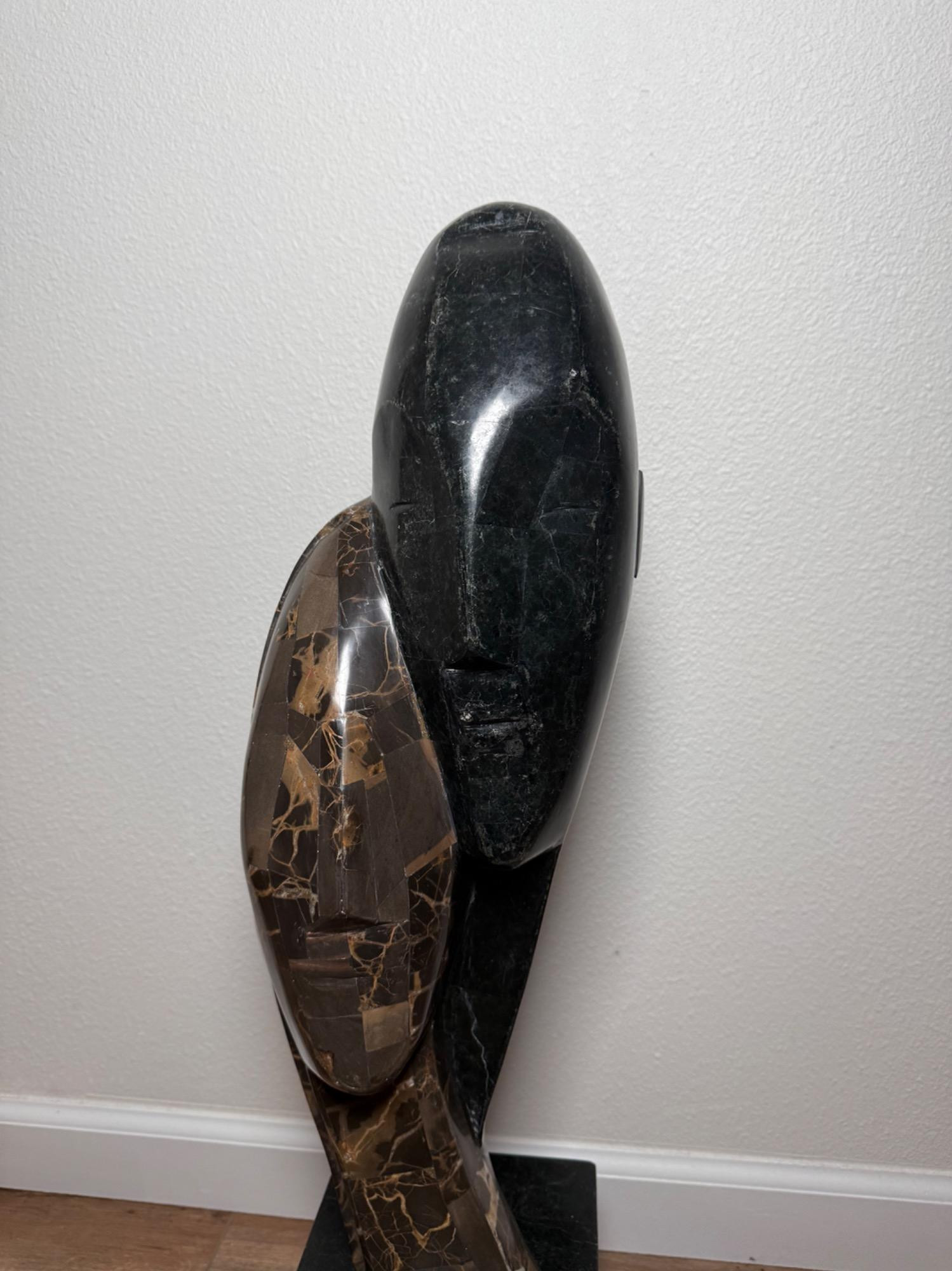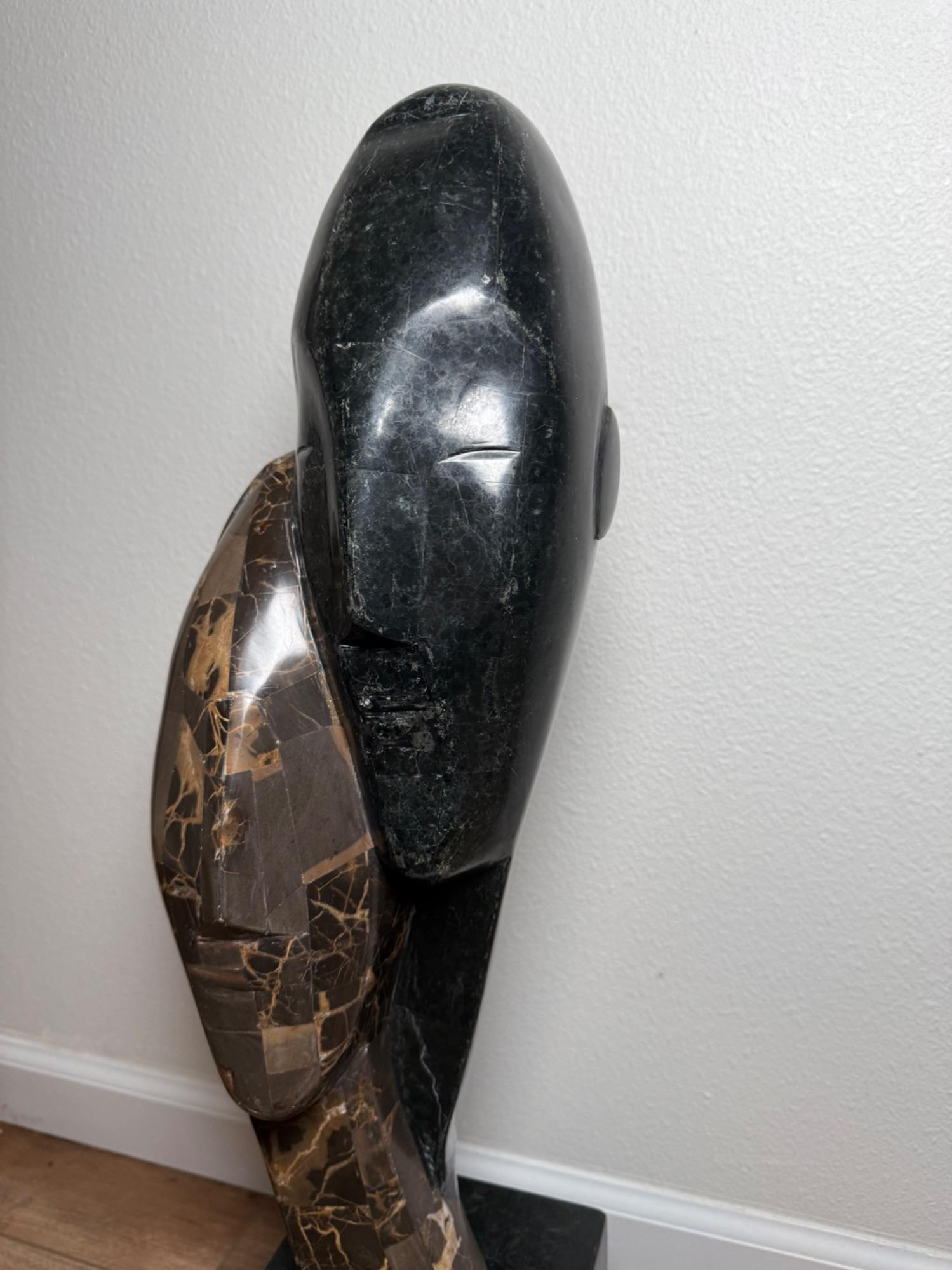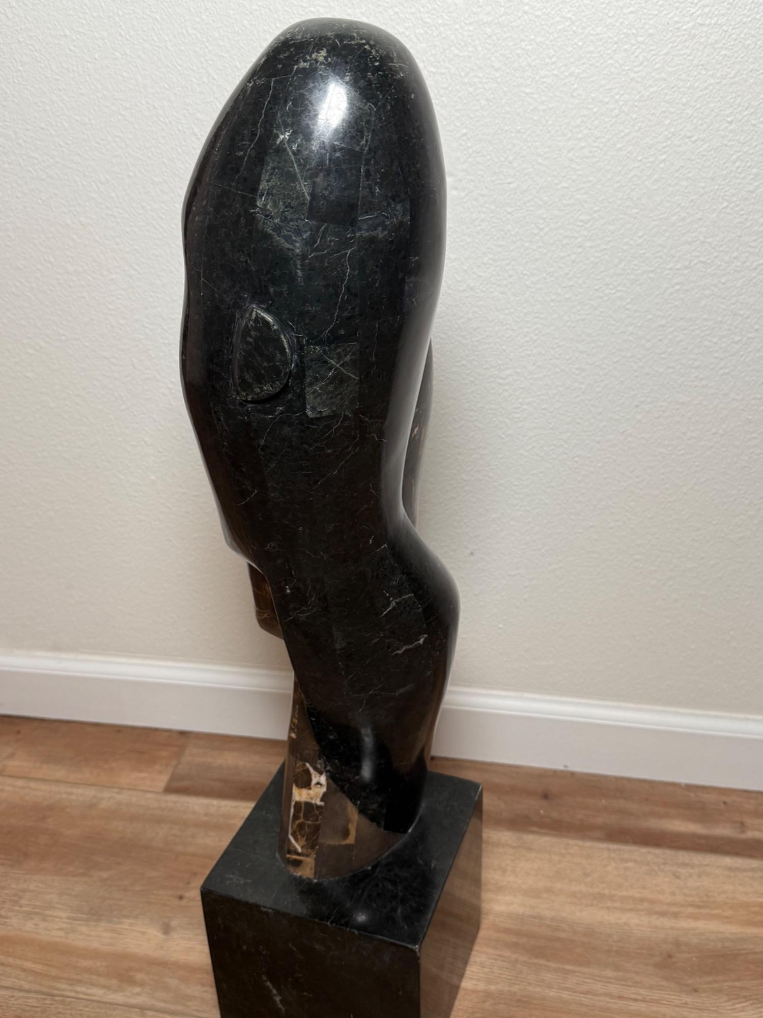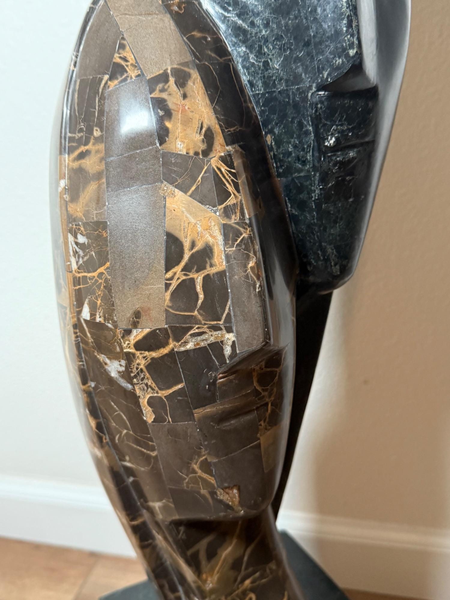 Stunning African-inspired abstract sculpture measuring 28” tall and 6” wide. Crafted from a blend of polished stone materials, this piece adds a touch of sophistication and cultural depth to any space. Perfect for art enthusiasts or collectors seeking a unique statement piece.
