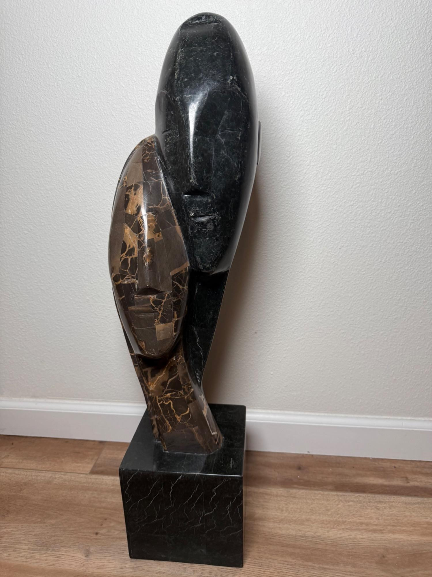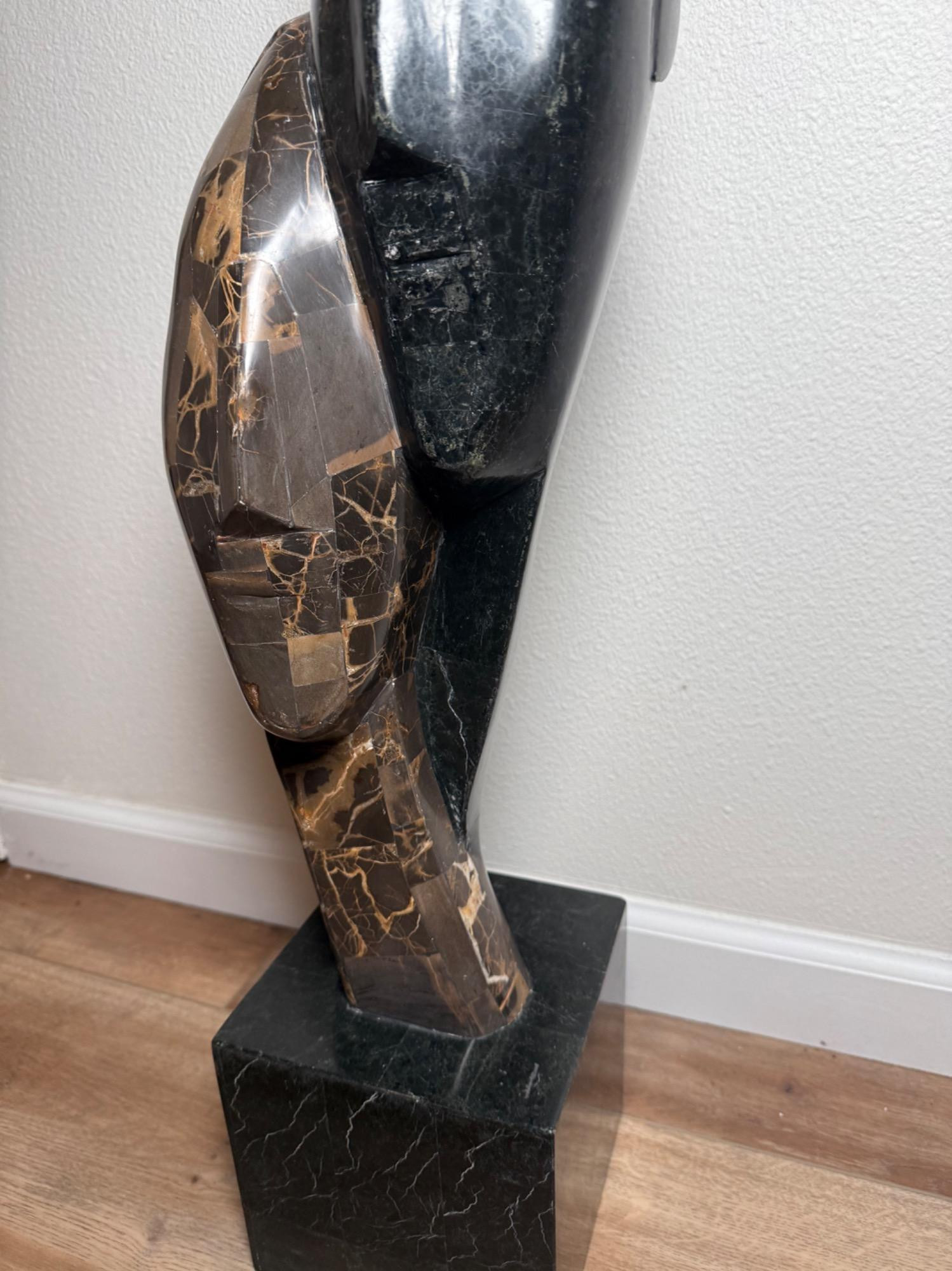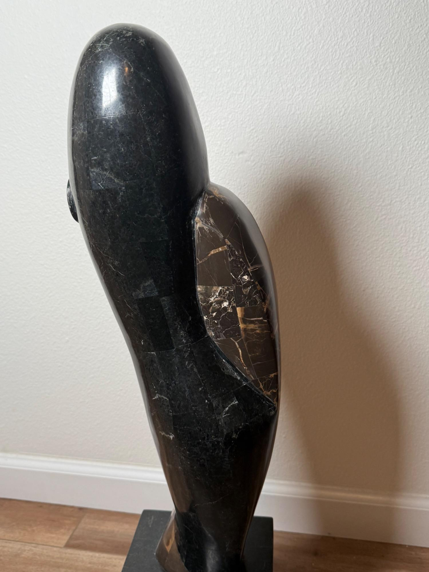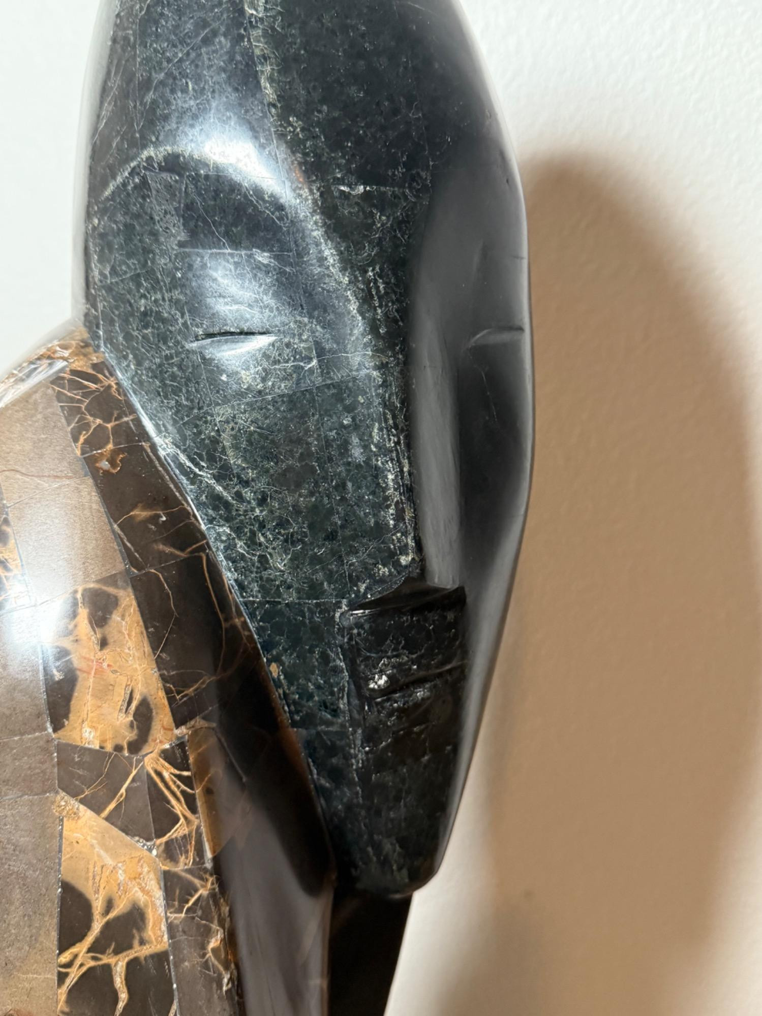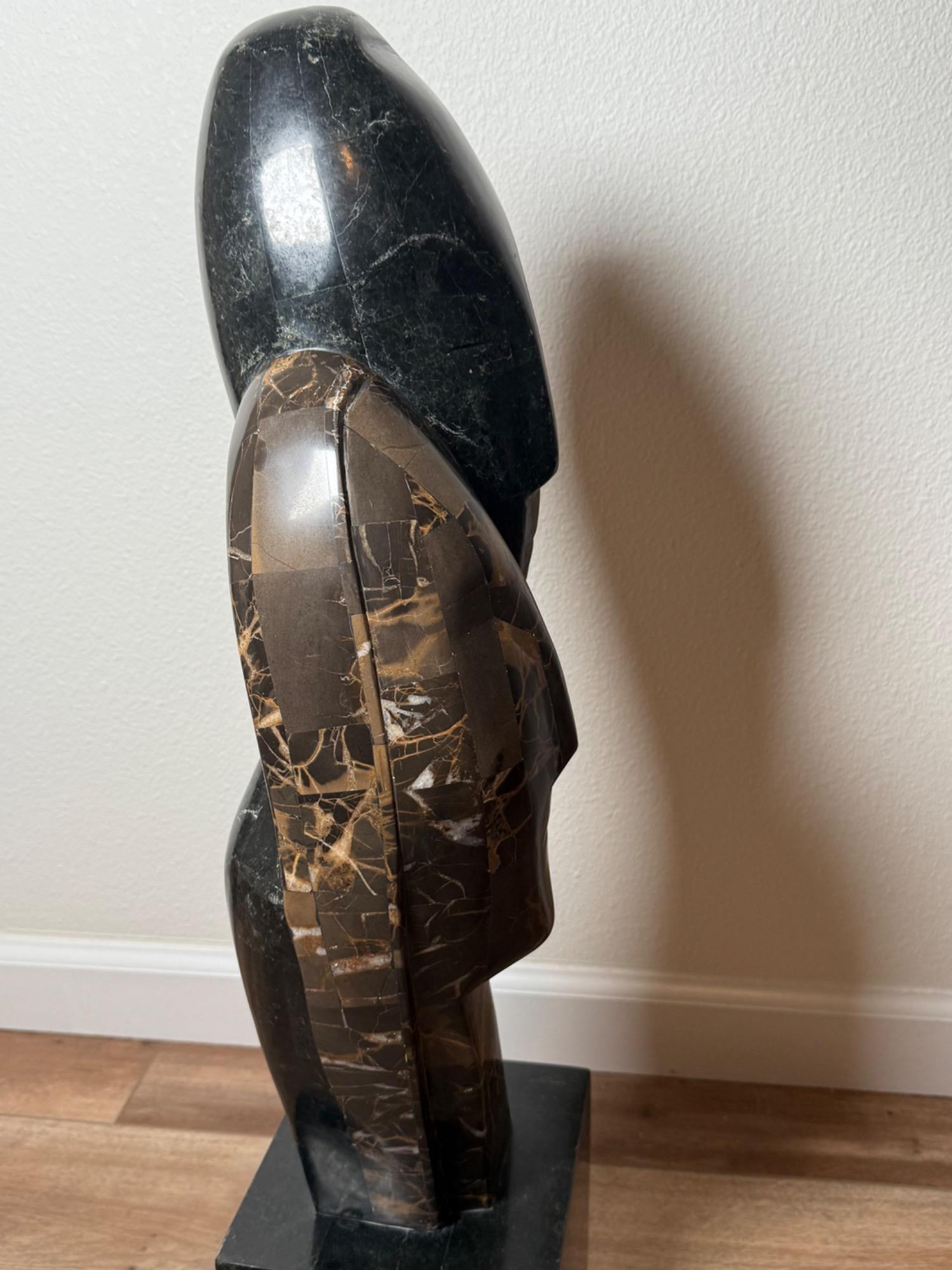 Stunning African-inspired abstract sculpture measuring 28” tall and 6” wide. Crafted from a blend of polished stone materials, this piece adds a touch of sophistication and cultural depth to any space. Perfect for art enthusiasts or collectors seeking a unique statement piece.