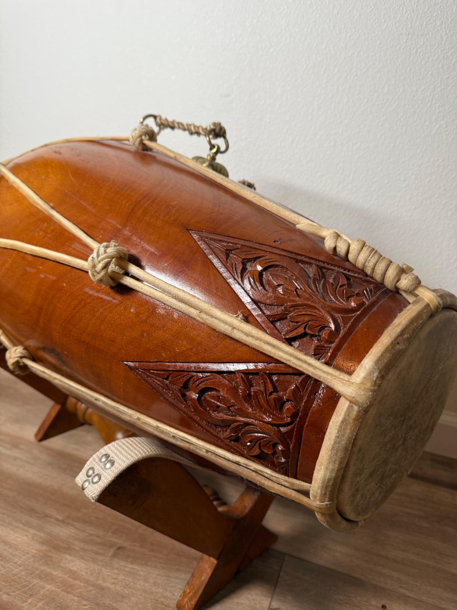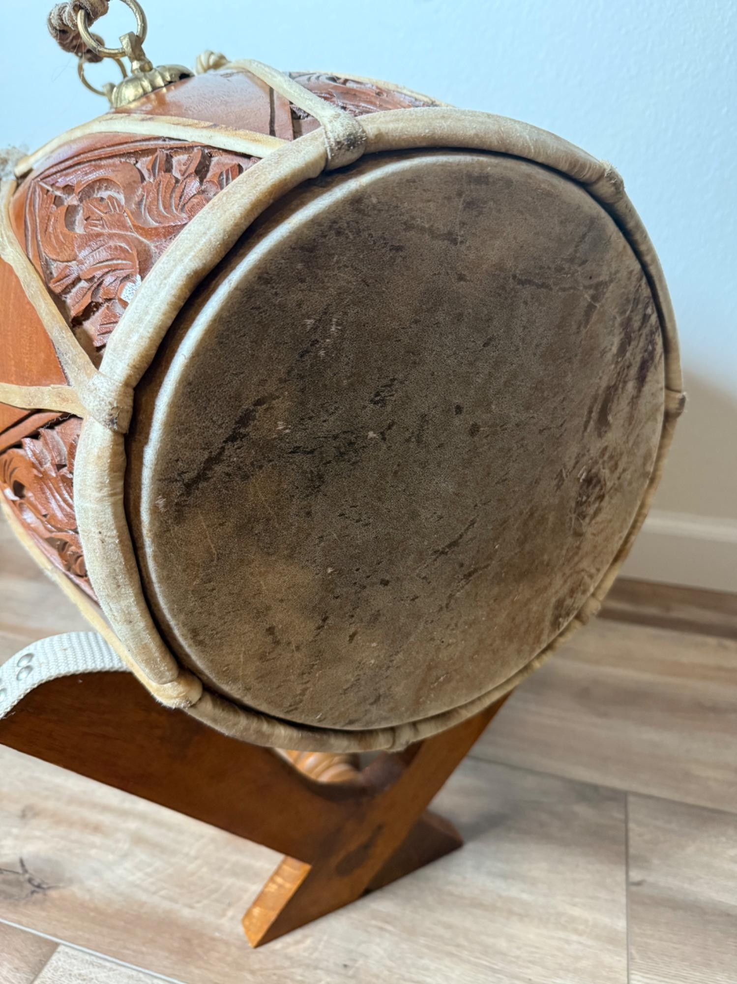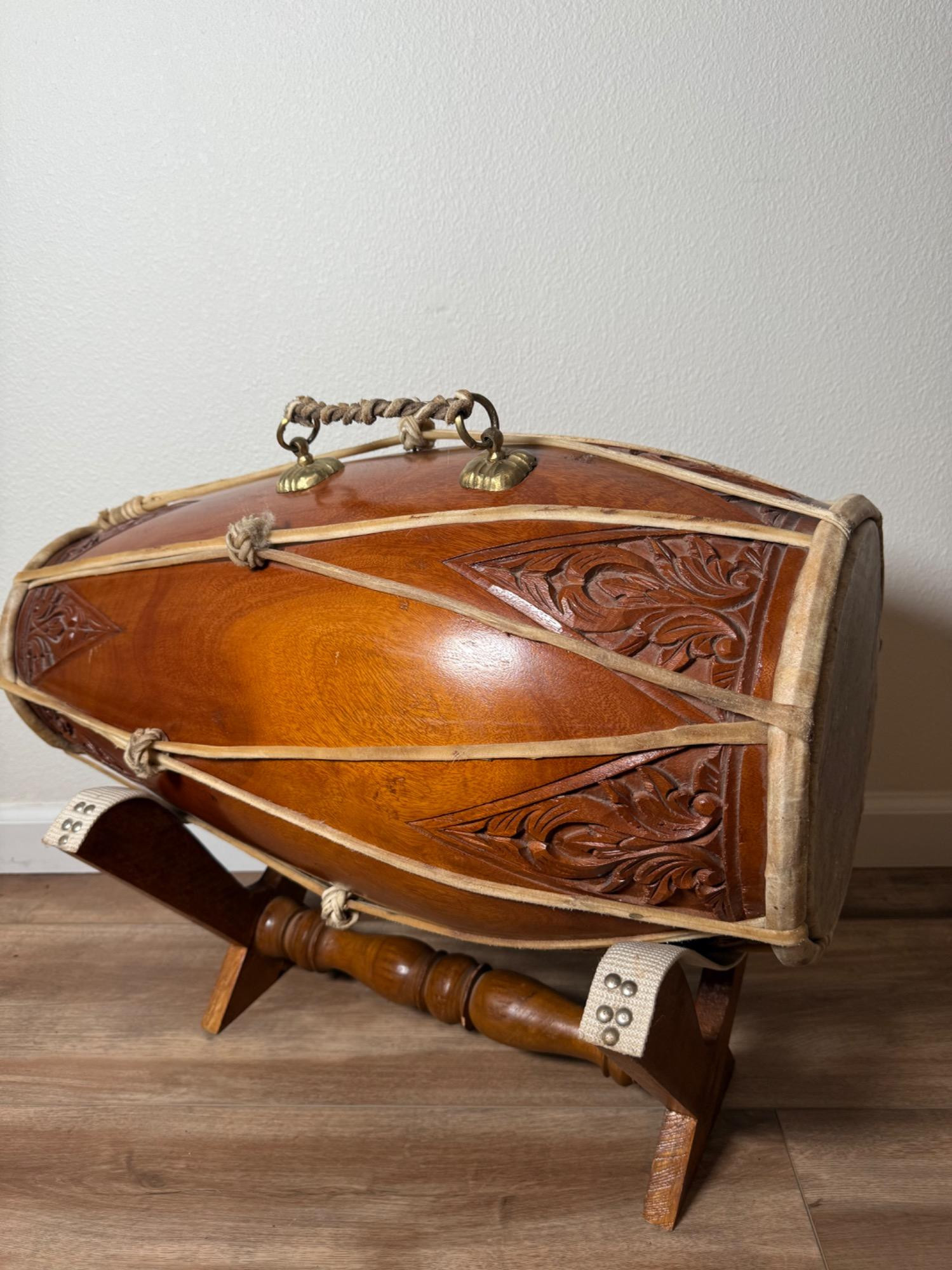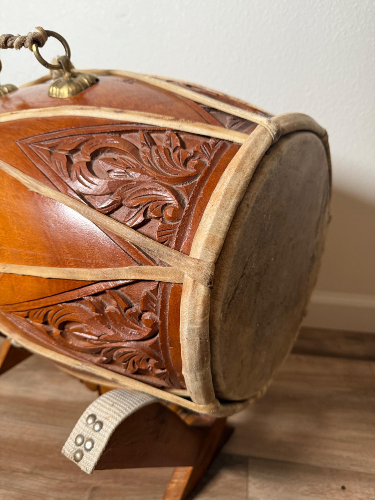 Beautiful vintage Japanese drum measuring 26” tall and 10” wide, featuring intricate hand-carved details and traditional caned construction. Comes with a sturdy wooden stand for display or performance use. A stunning piece for collectors, musicians, or those seeking a unique decorative item with cultural significance.