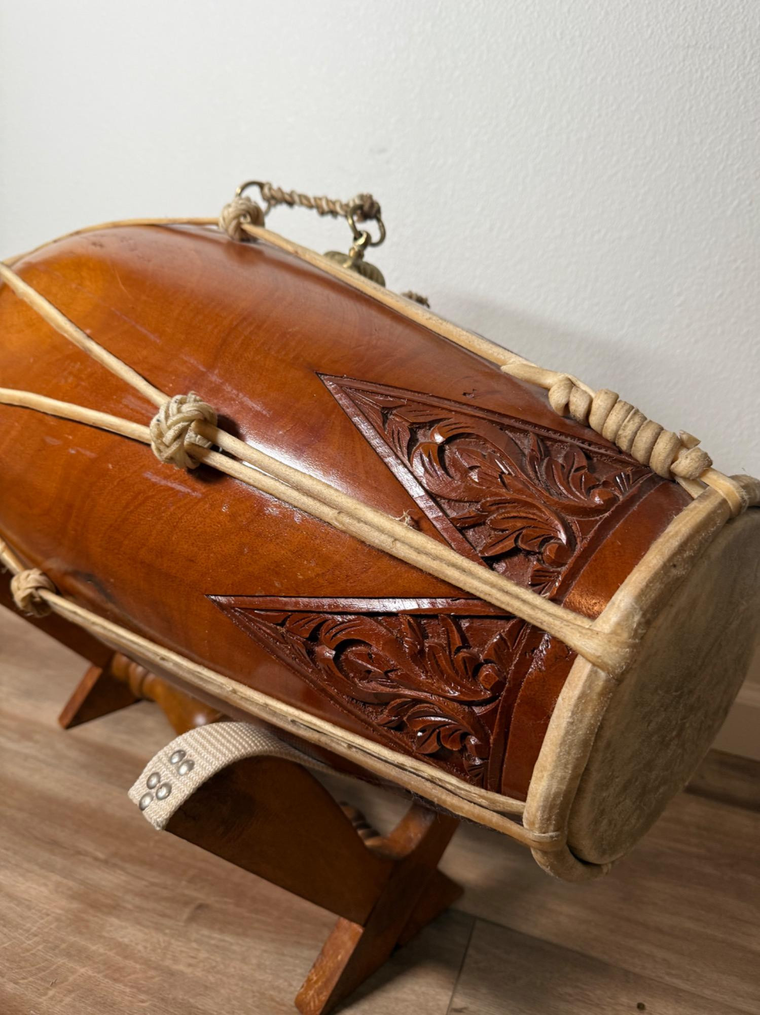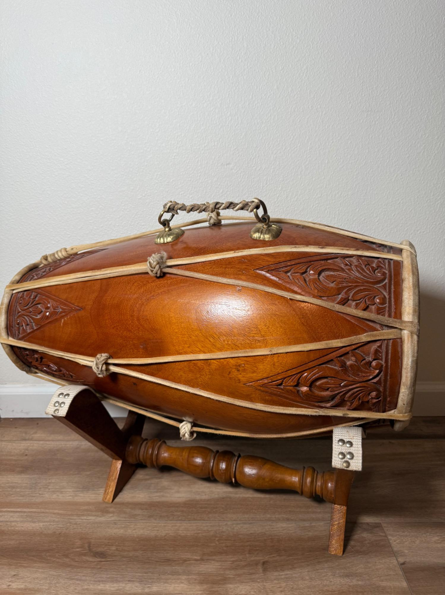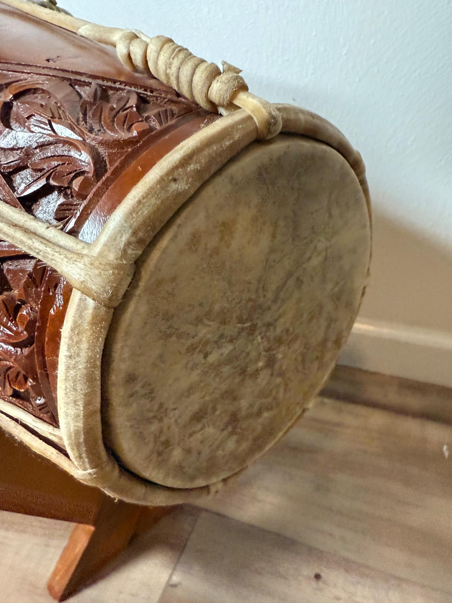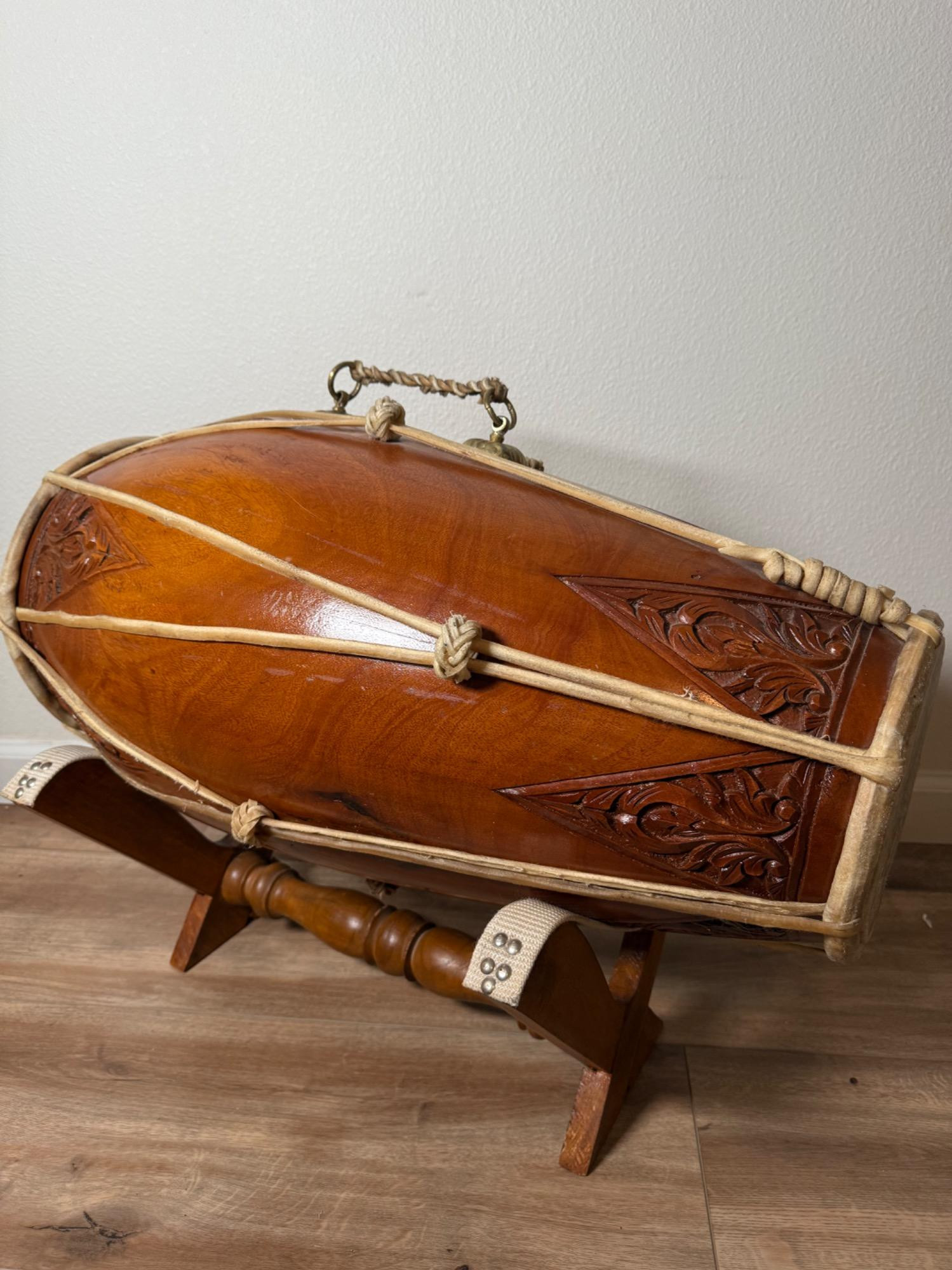 Beautiful vintage Japanese drum measuring 26” tall and 10” wide, featuring intricate hand-carved details and traditional caned construction. Comes with a sturdy wooden stand for display or performance use. A stunning piece for collectors, musicians, or those seeking a unique decorative item with cultural significance.
