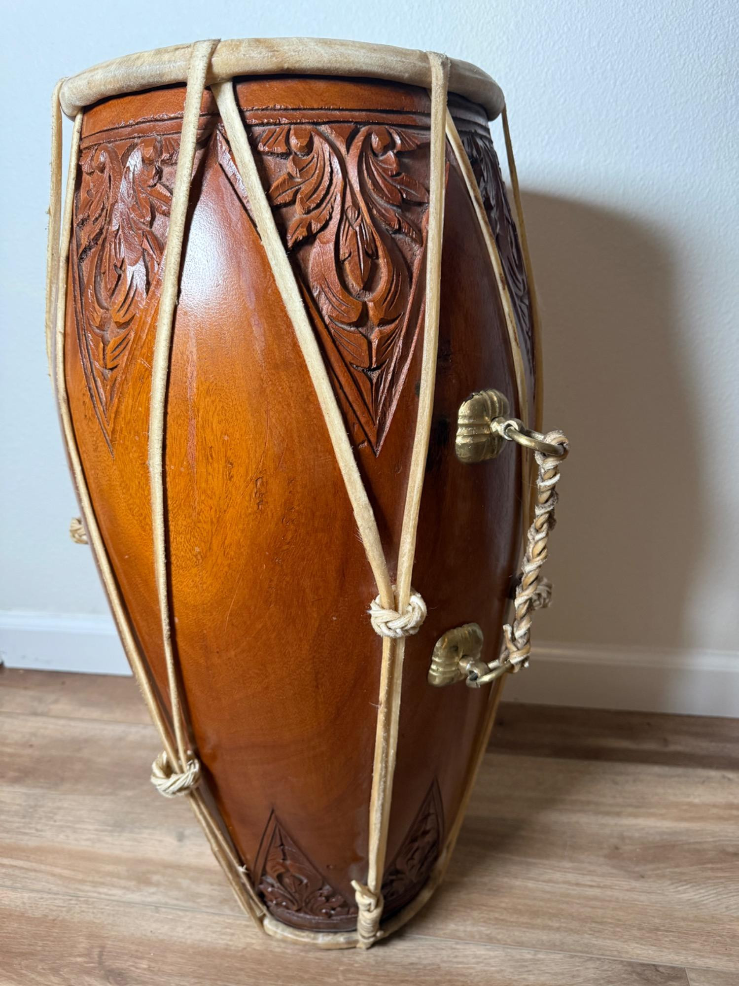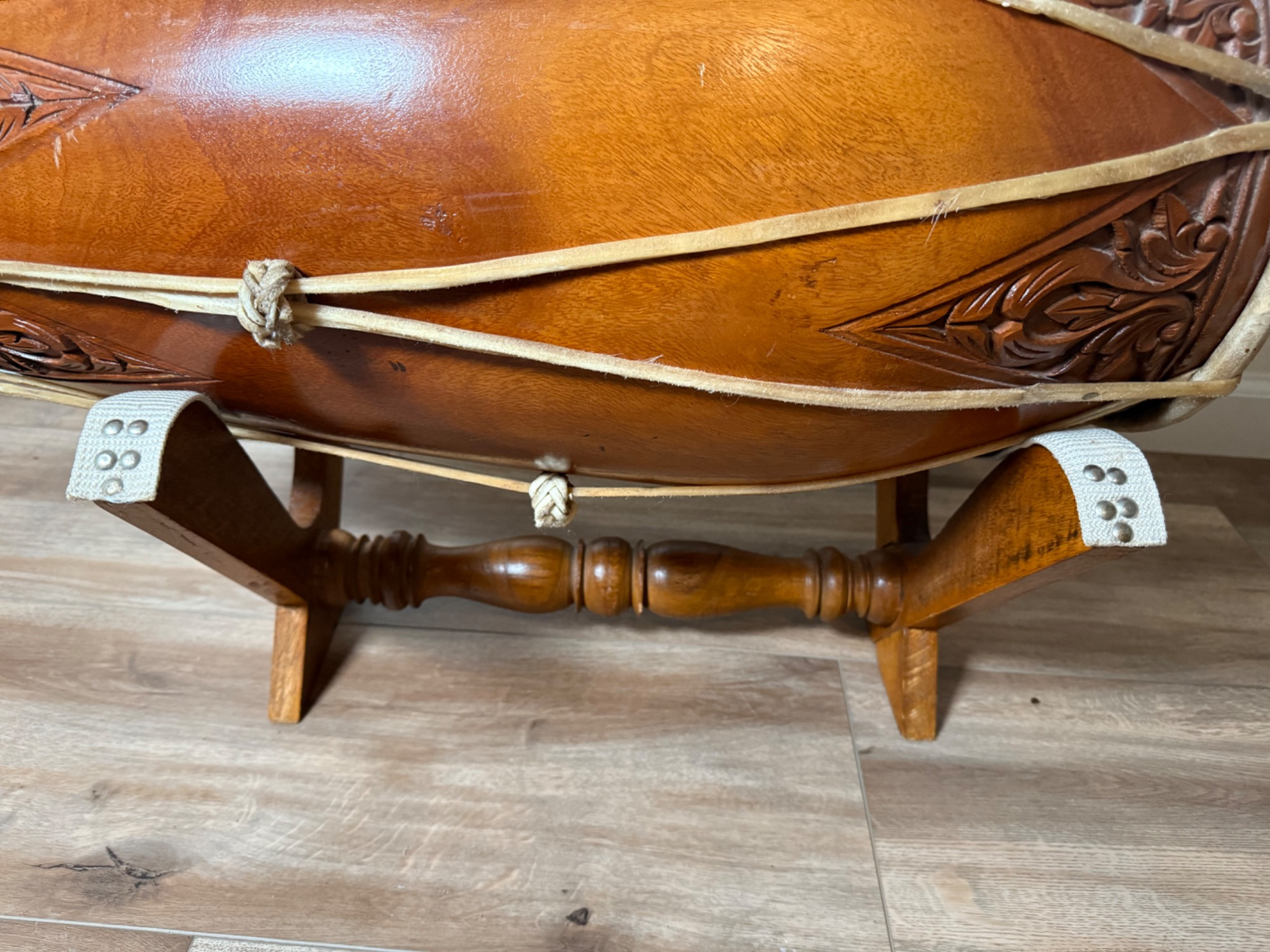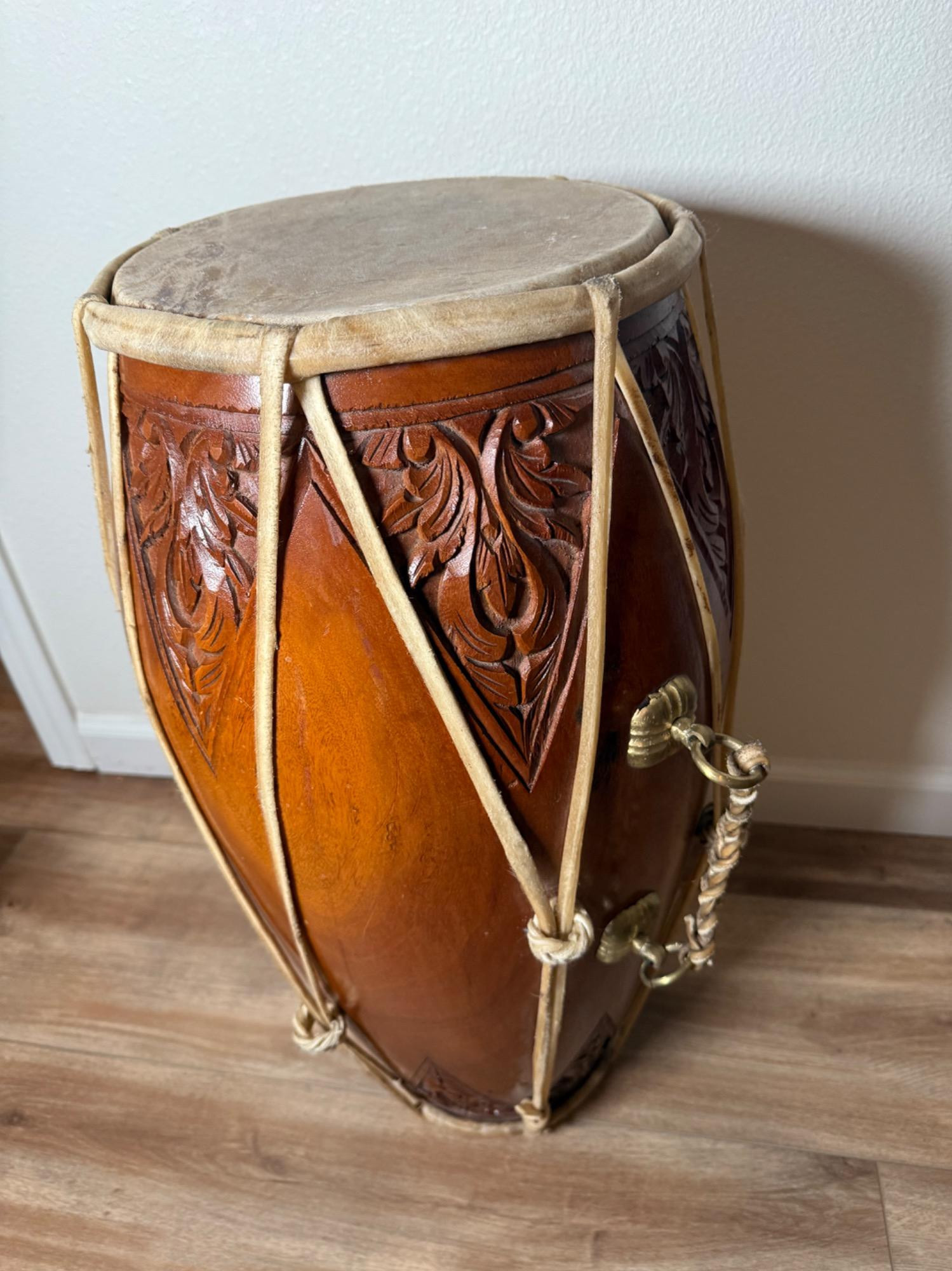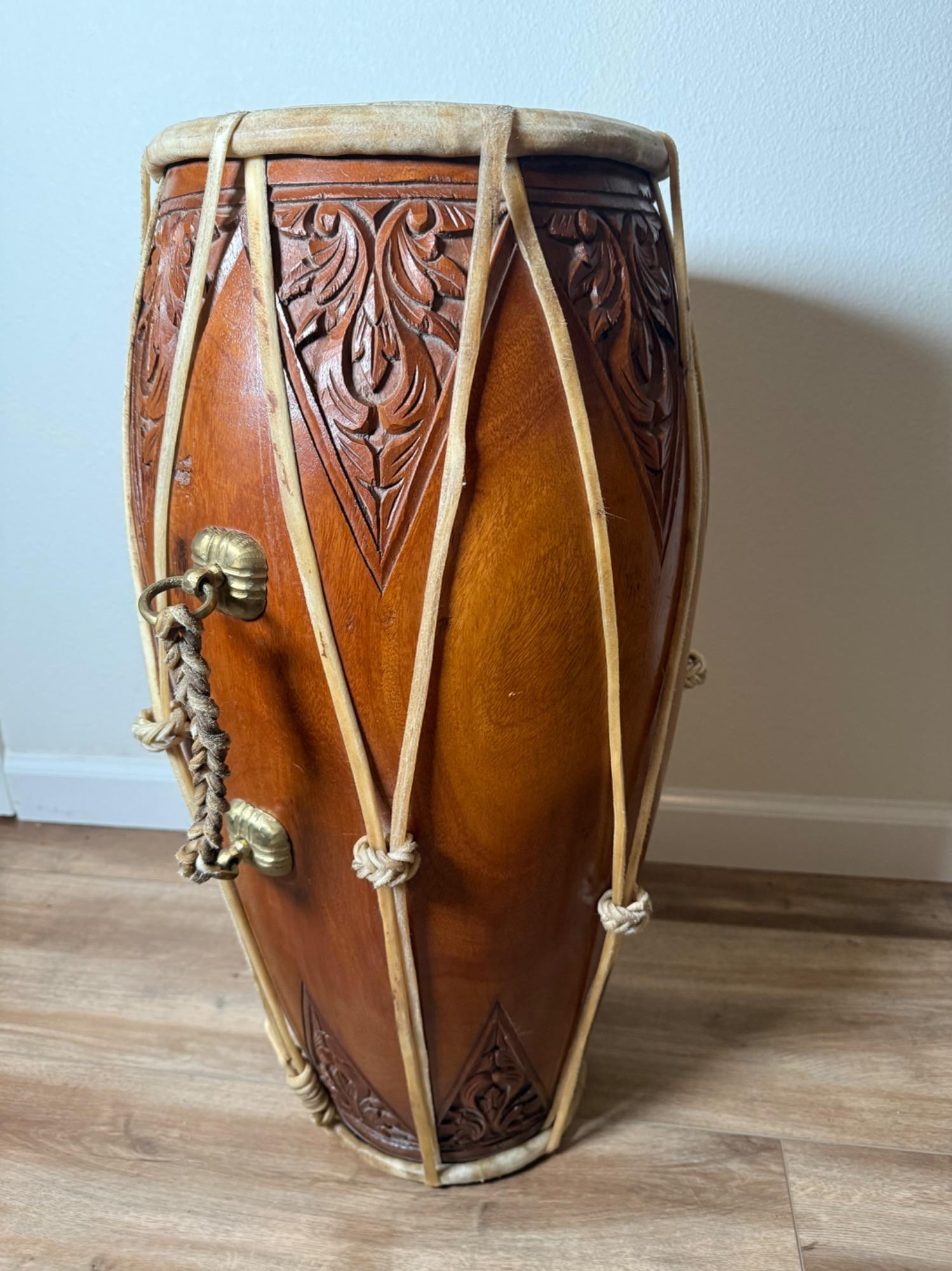 Beautiful vintage Japanese drum measuring 26” tall and 10” wide, featuring intricate hand-carved details and traditional caned construction. Comes with a sturdy wooden stand for display or performance use. A stunning piece for collectors, musicians, or those seeking a unique decorative item with cultural significance.