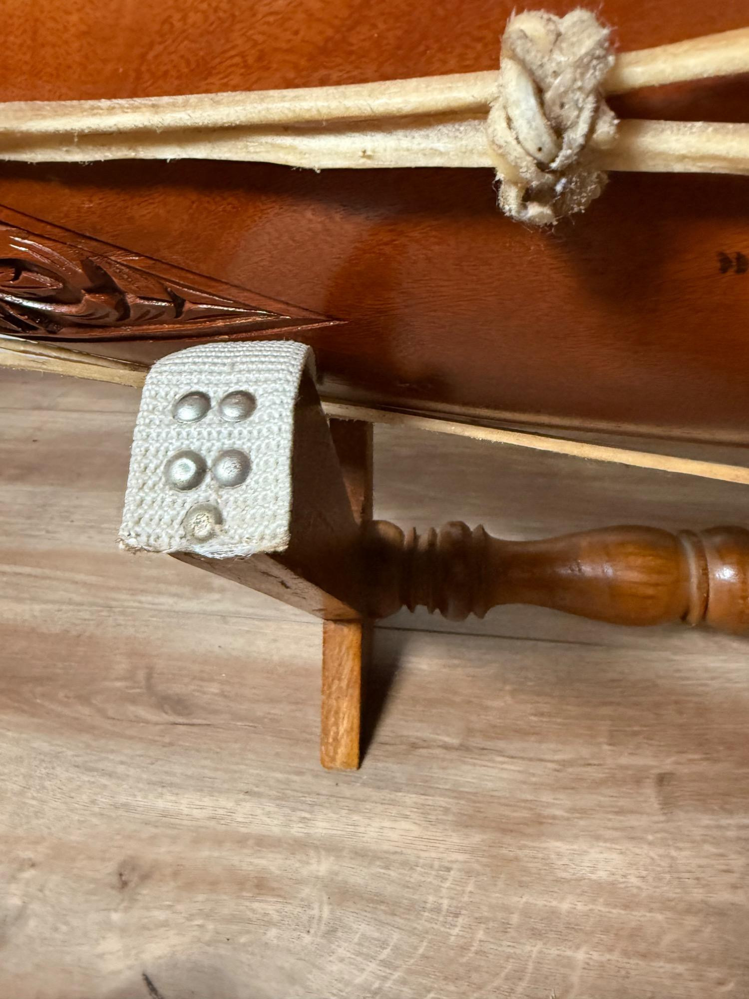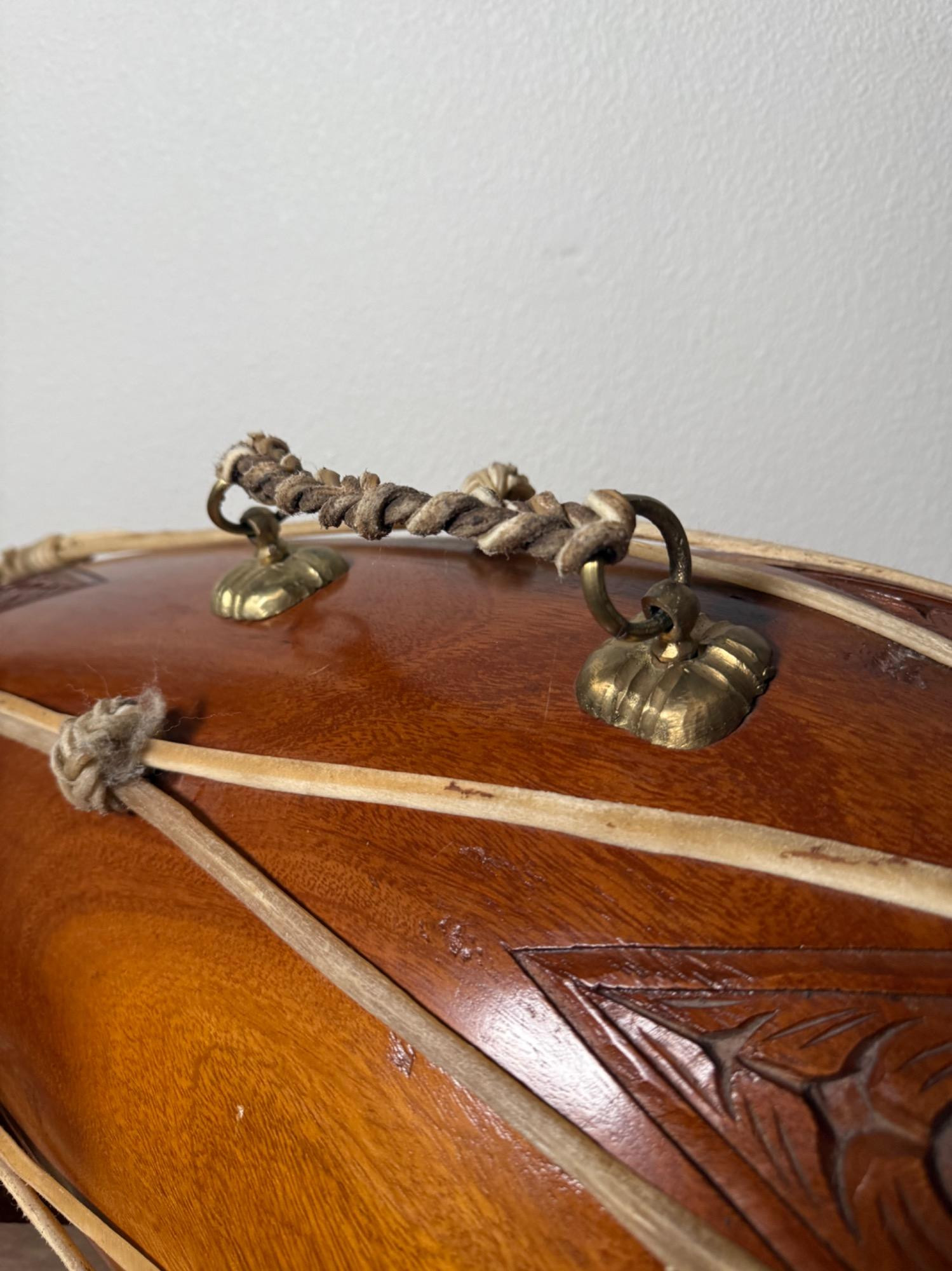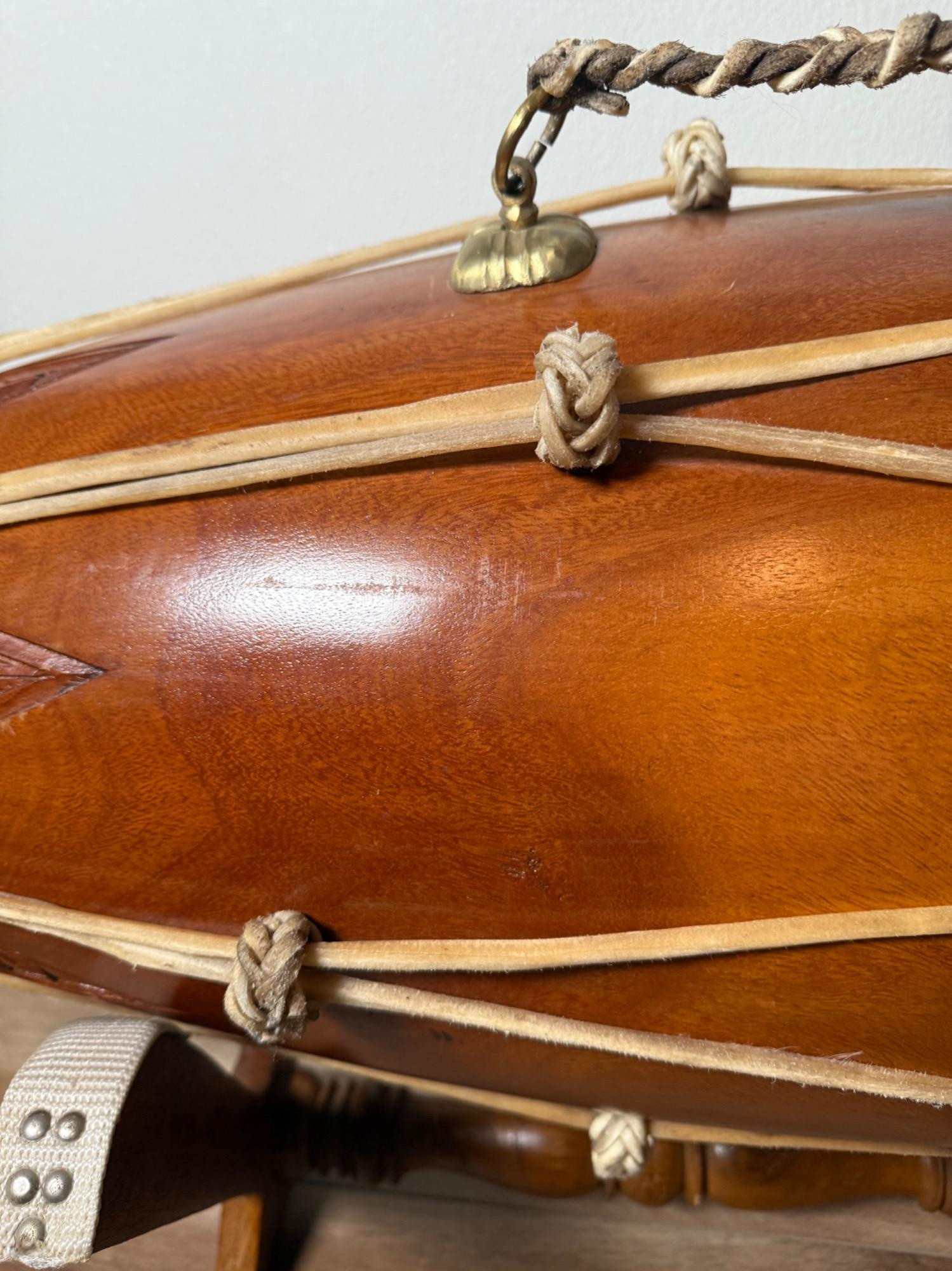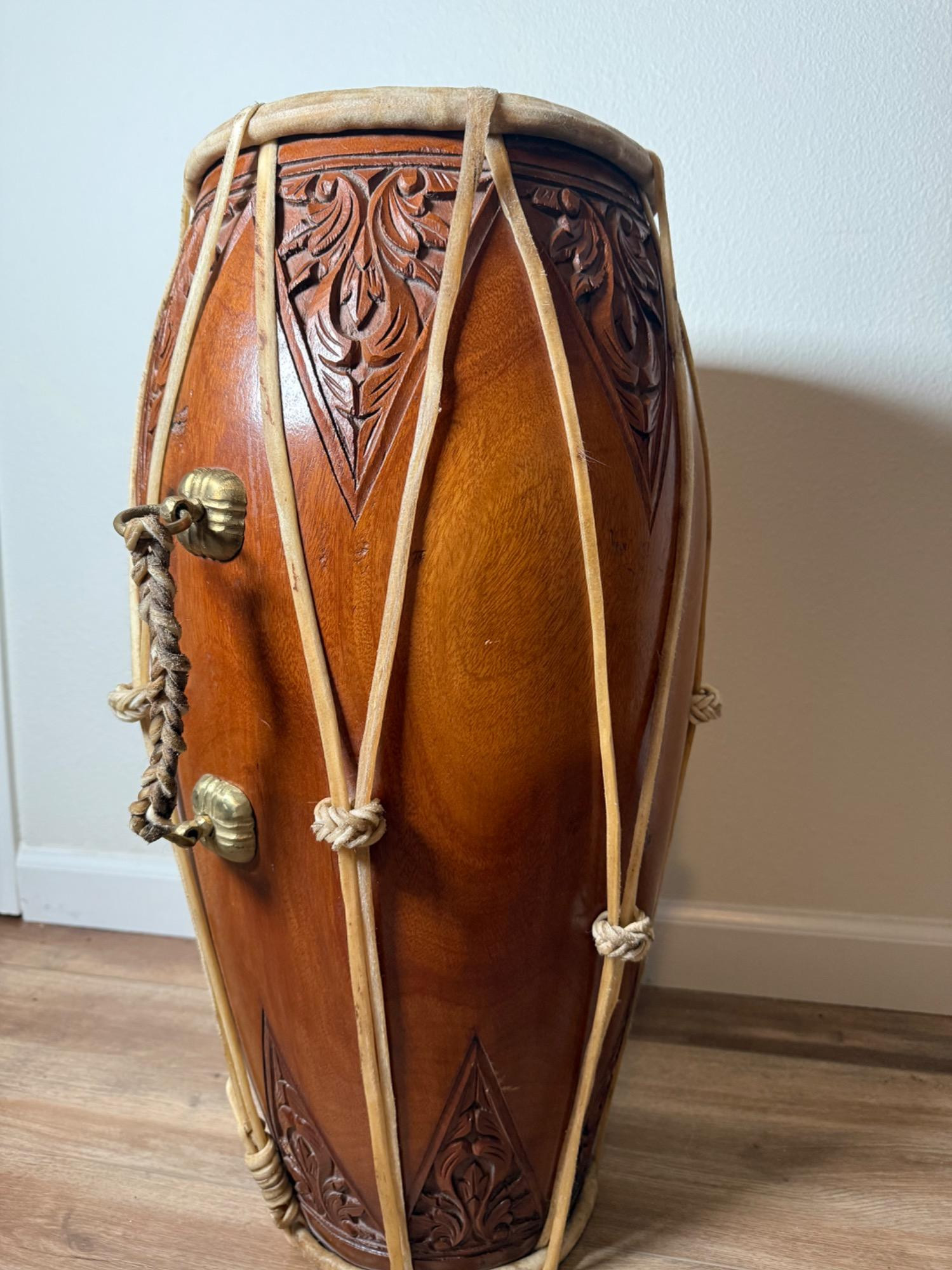 Beautiful vintage Japanese drum measuring 26” tall and 10” wide, featuring intricate hand-carved details and traditional caned construction. Comes with a sturdy wooden stand for display or performance use. A stunning piece for collectors, musicians, or those seeking a unique decorative item with cultural significance.