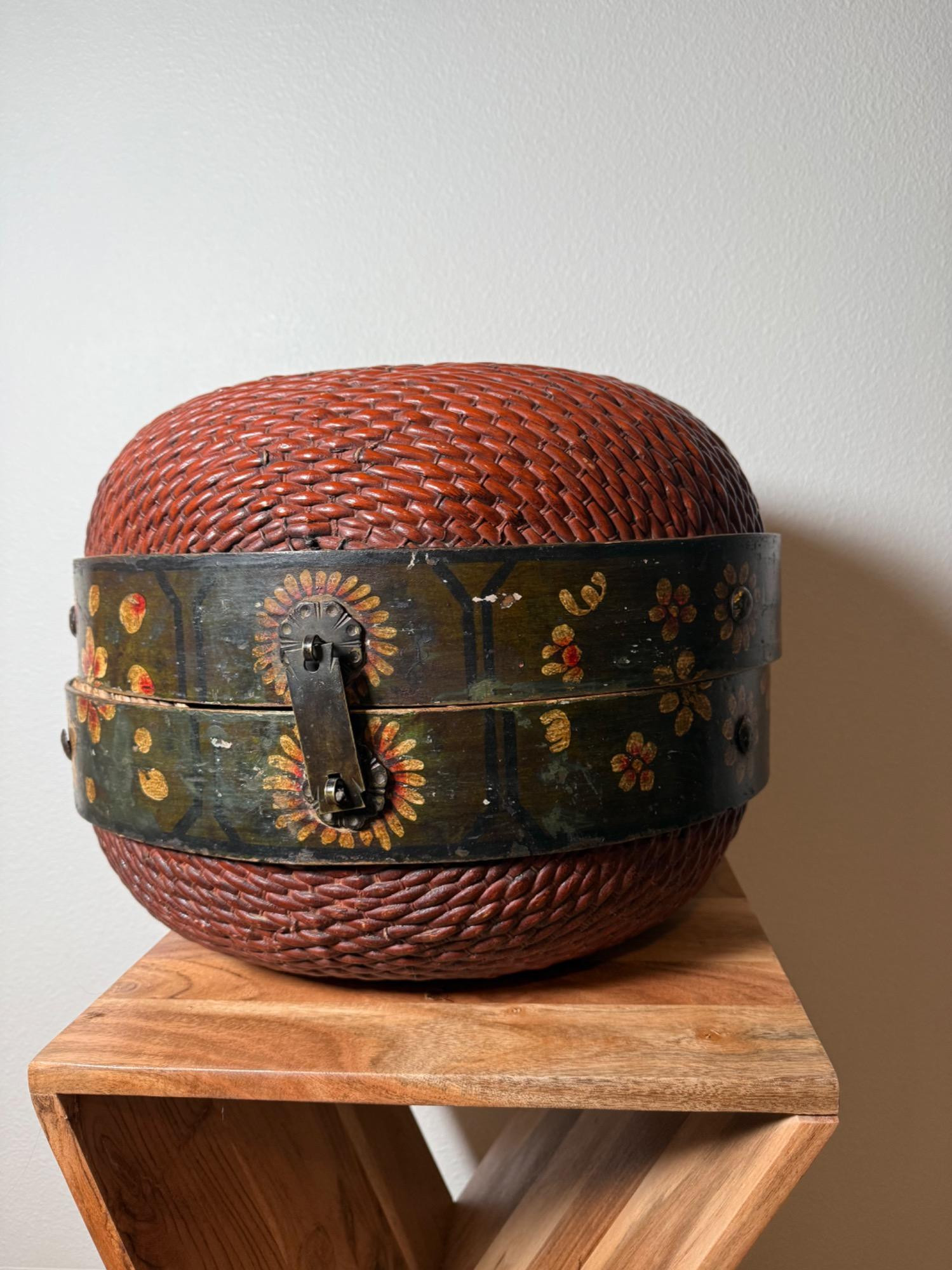 Beautifully crafted antique Chinese dowry basket measuring 16” wide and 13” tall. Features intricate woven details and ornate hand-painted accents with metal hardware.