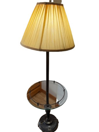 Classic vintage Stiffel floor lamp measuring 58” tall and 19” wide. Features a built-in glass table for added functionality and a timeless pleated shade for a warm, inviting glow. Perfect for adding both style and practicality to your living space!