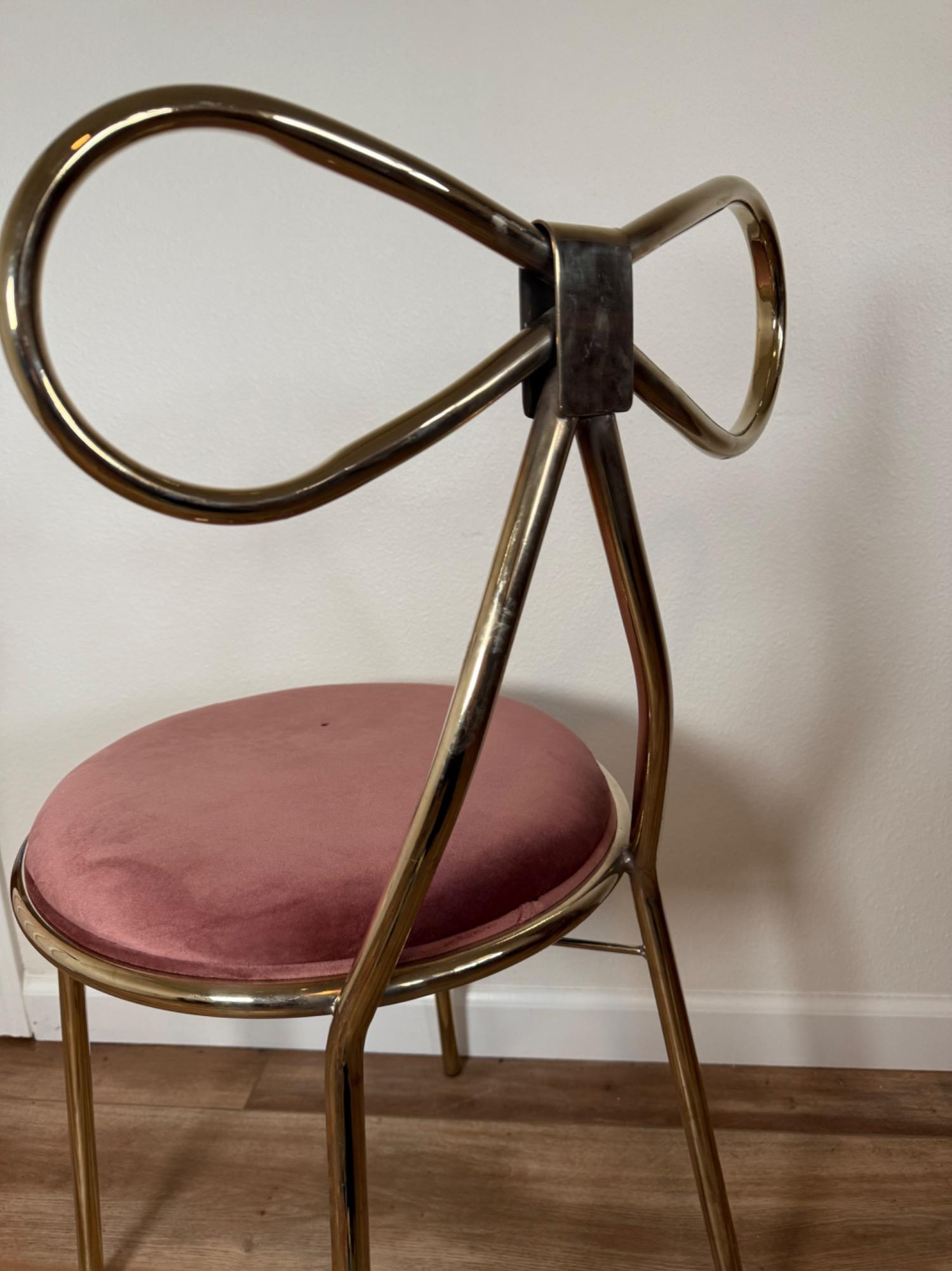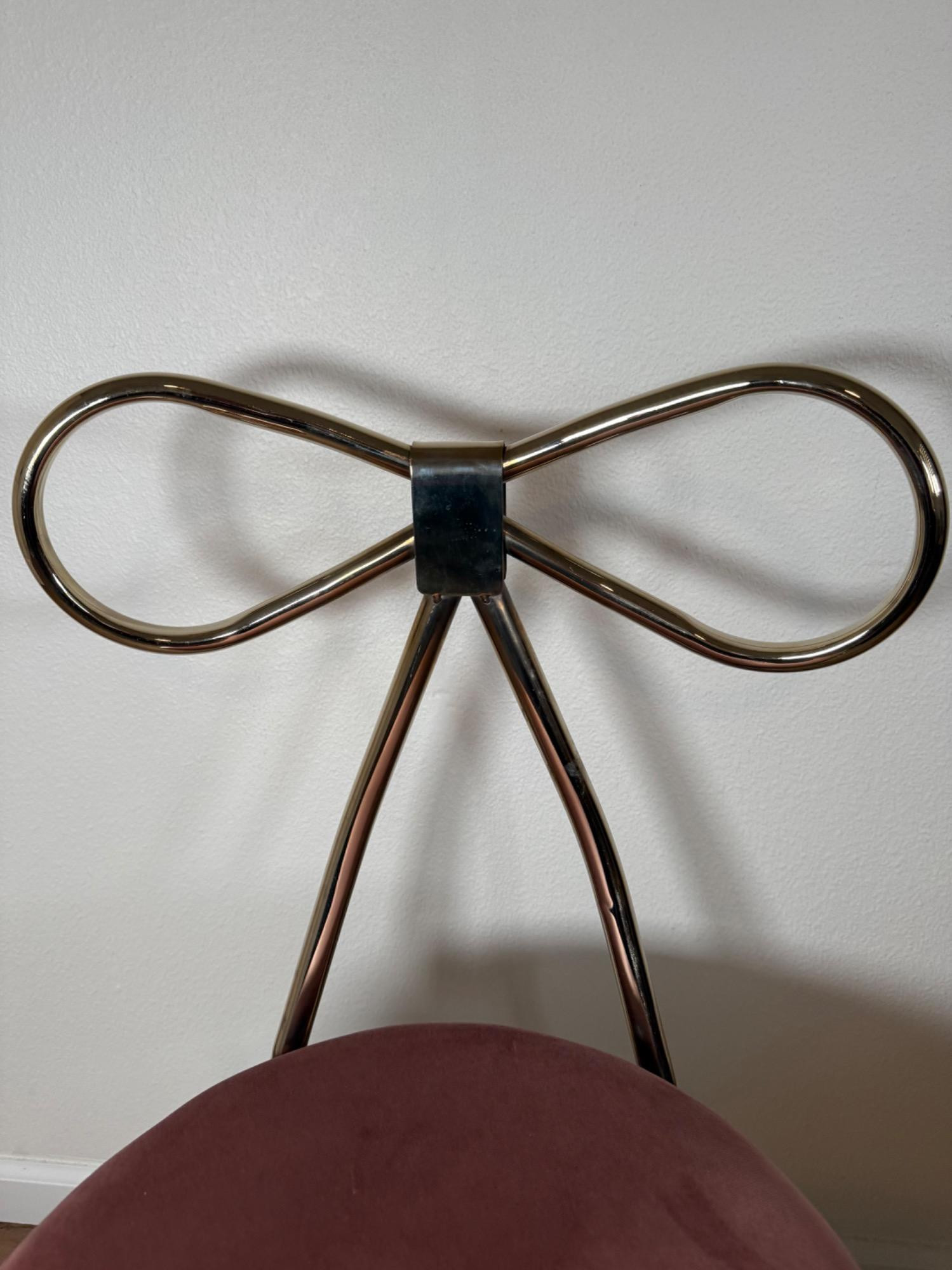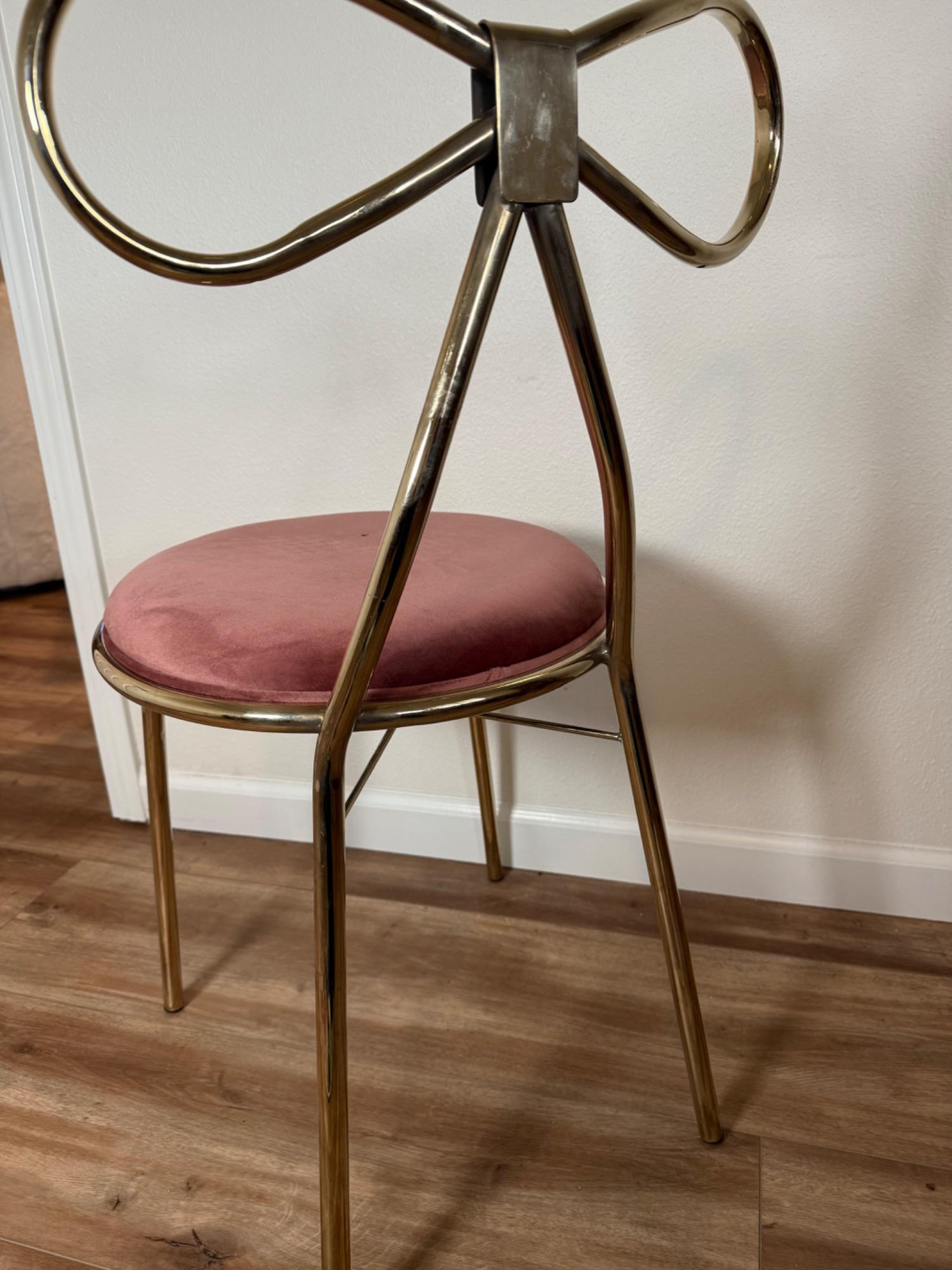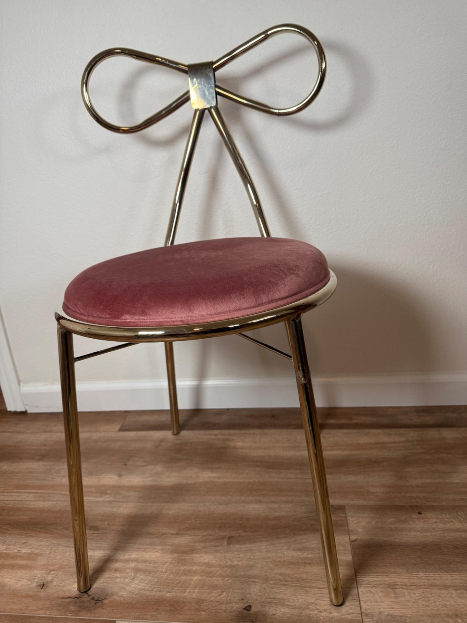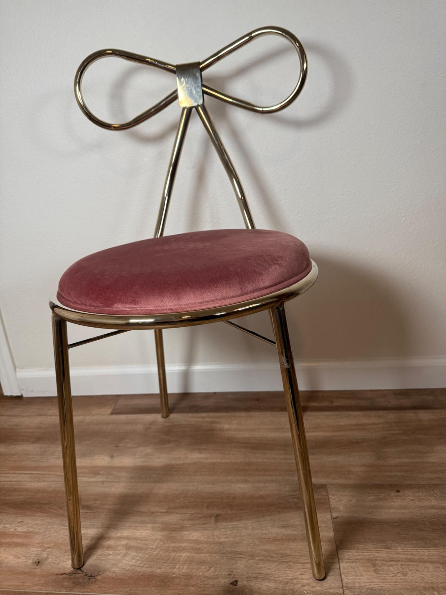 Elegant Lux Bow Chair featuring a striking gold-toned bow-shaped backrest and luxurious pink velvet upholstery. Measuring 32” tall at the back, with a seat height of 18.5” and width of 16”, this unique accent chair is perfect for adding a touch of sophistication and charm to any space. Ideal for a vanity, bedroom, or living area!