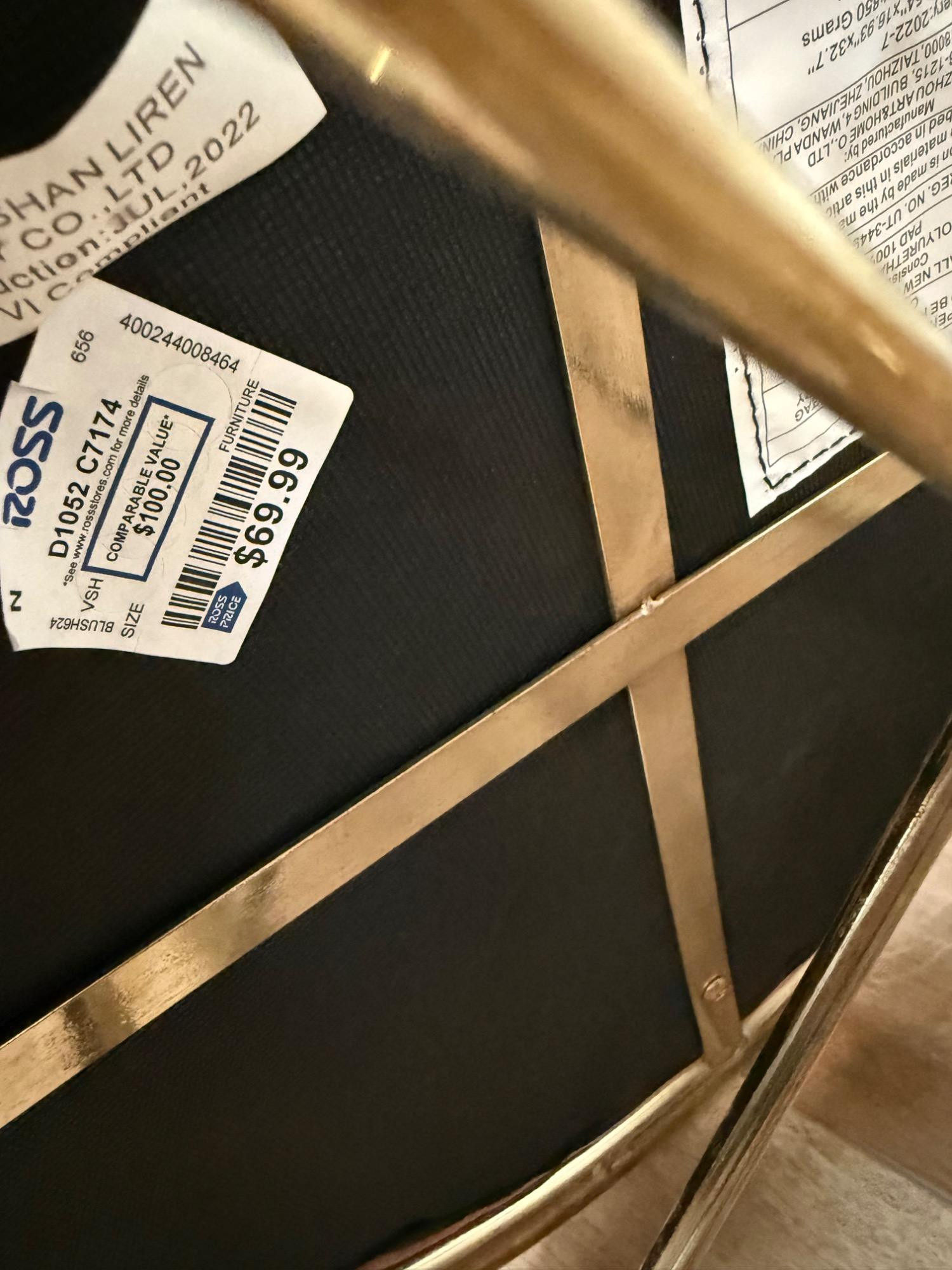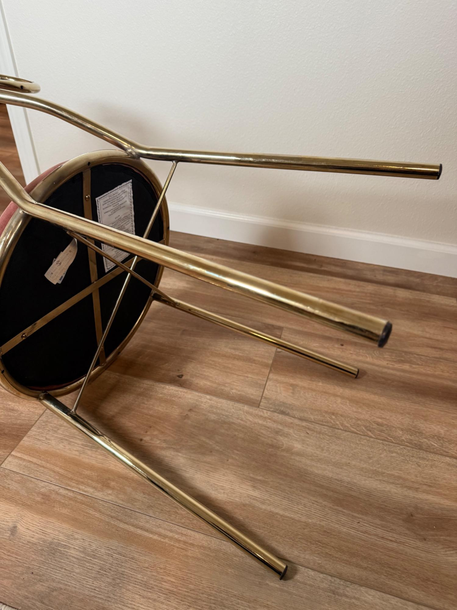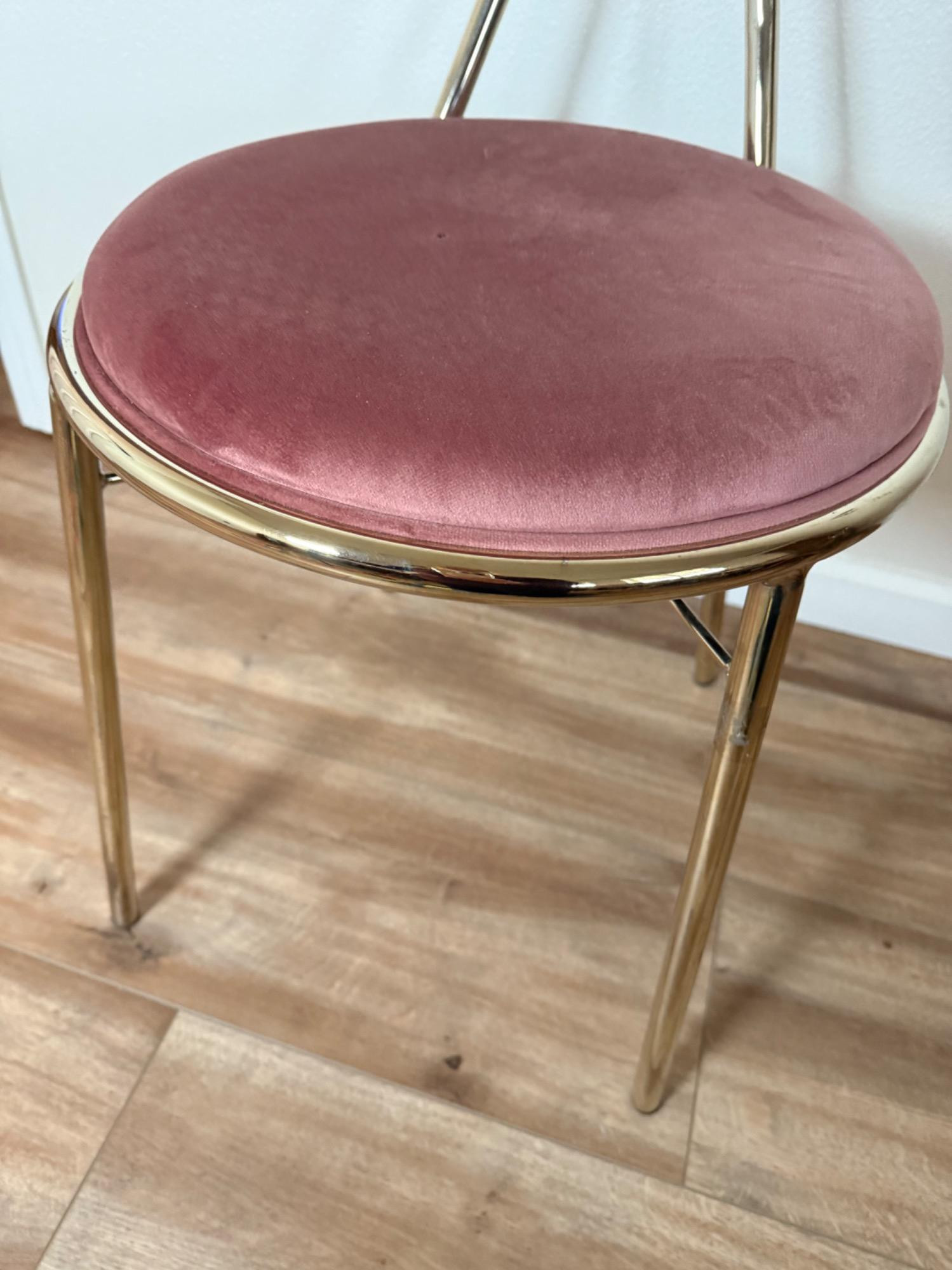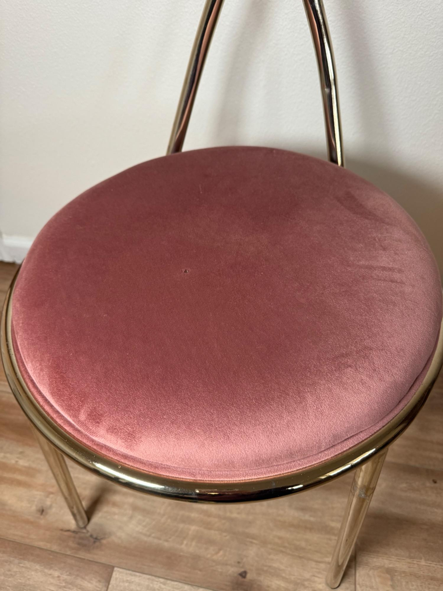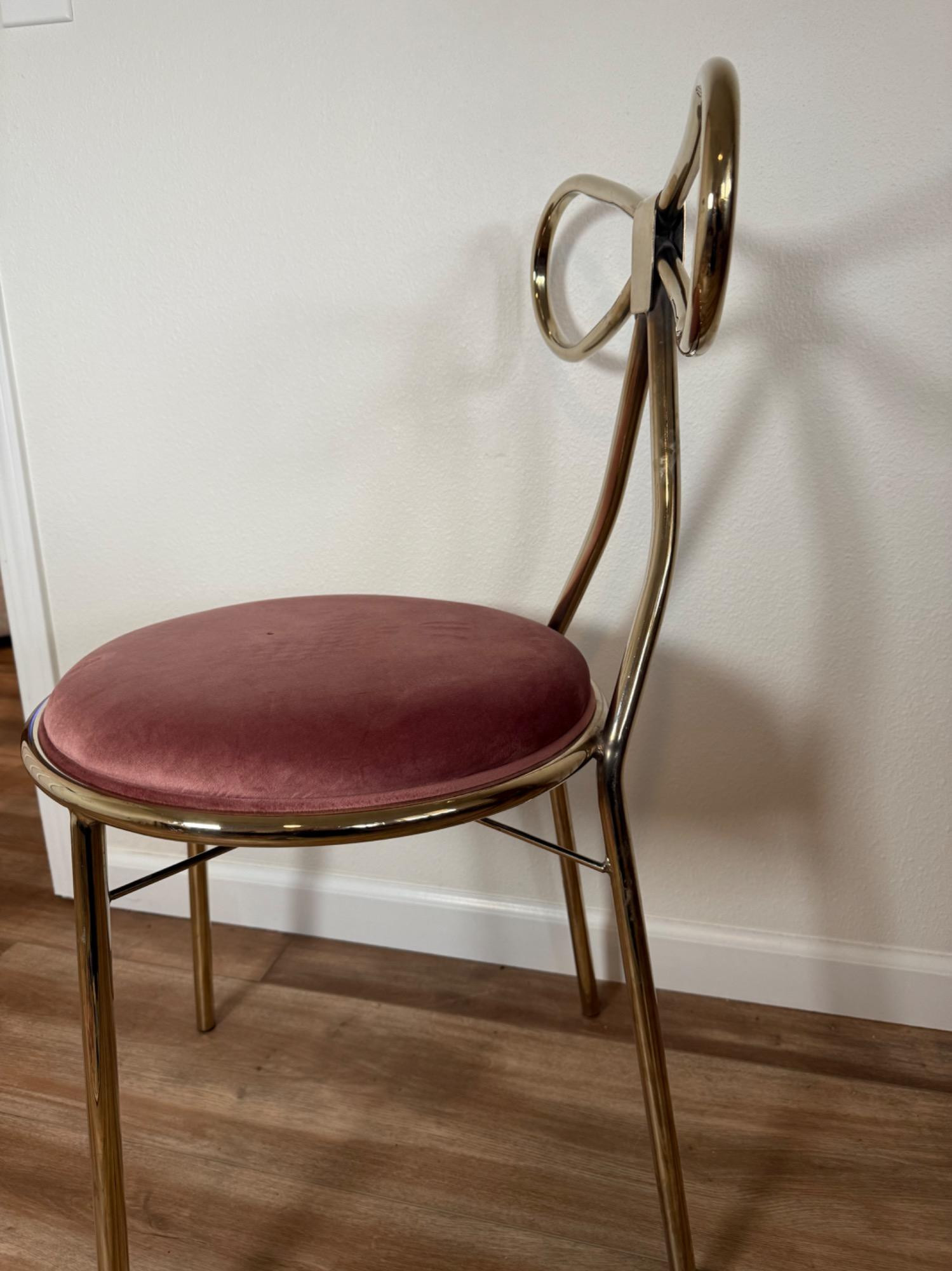 Elegant Lux Bow Chair featuring a striking gold-toned bow-shaped backrest and luxurious pink velvet upholstery. Measuring 32” tall at the back, with a seat height of 18.5” and width of 16”, this unique accent chair is perfect for adding a touch of sophistication and charm to any space. Ideal for a vanity, bedroom, or living area!