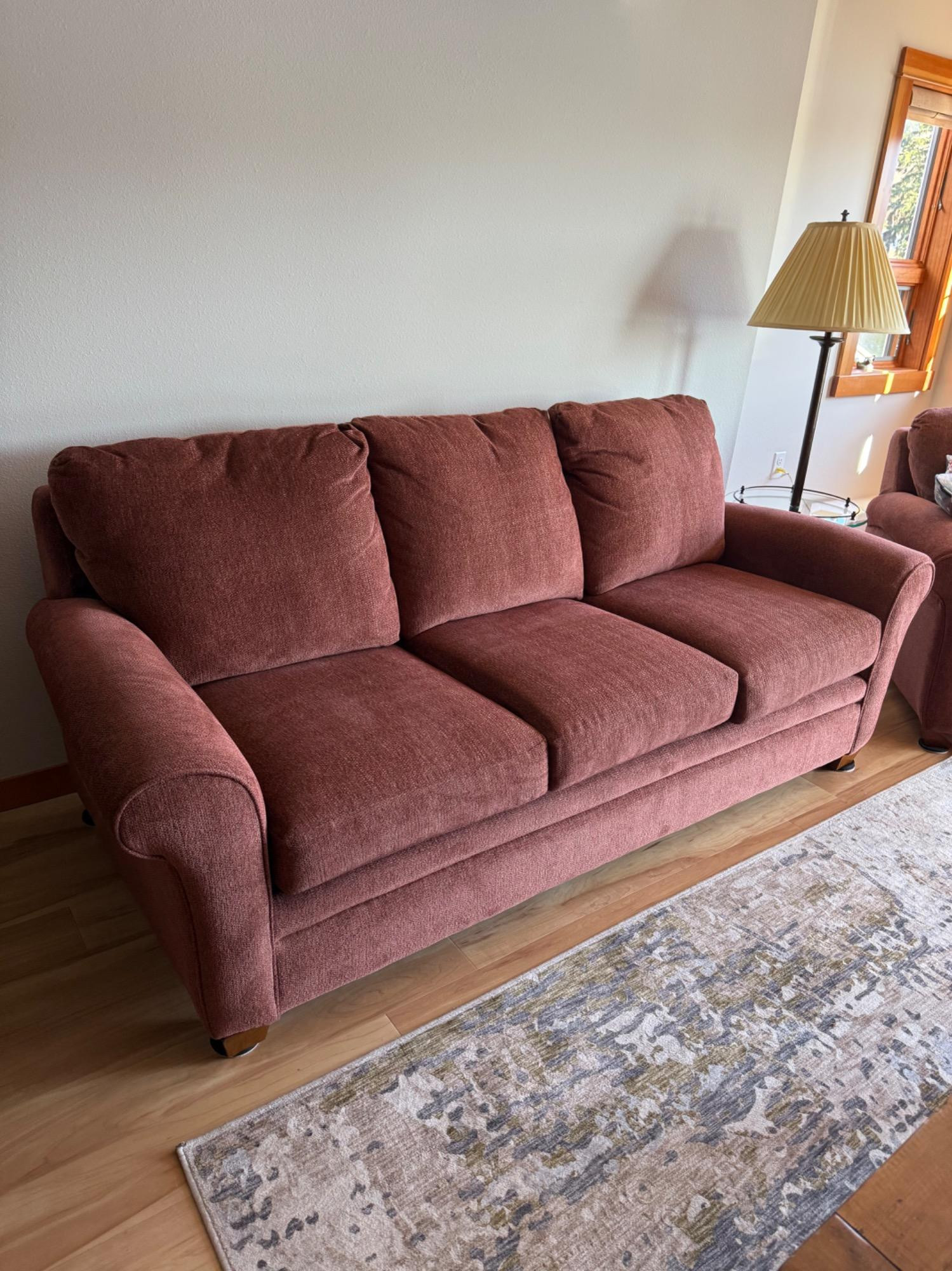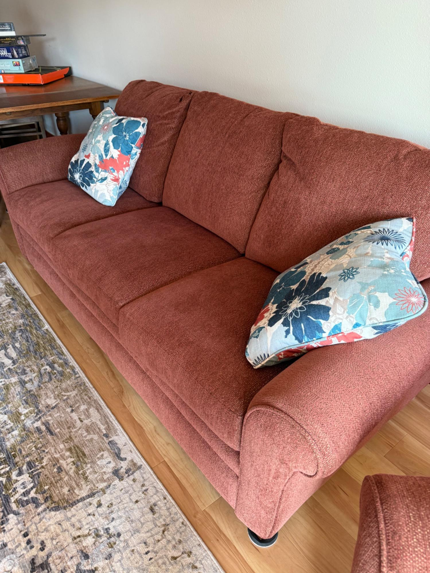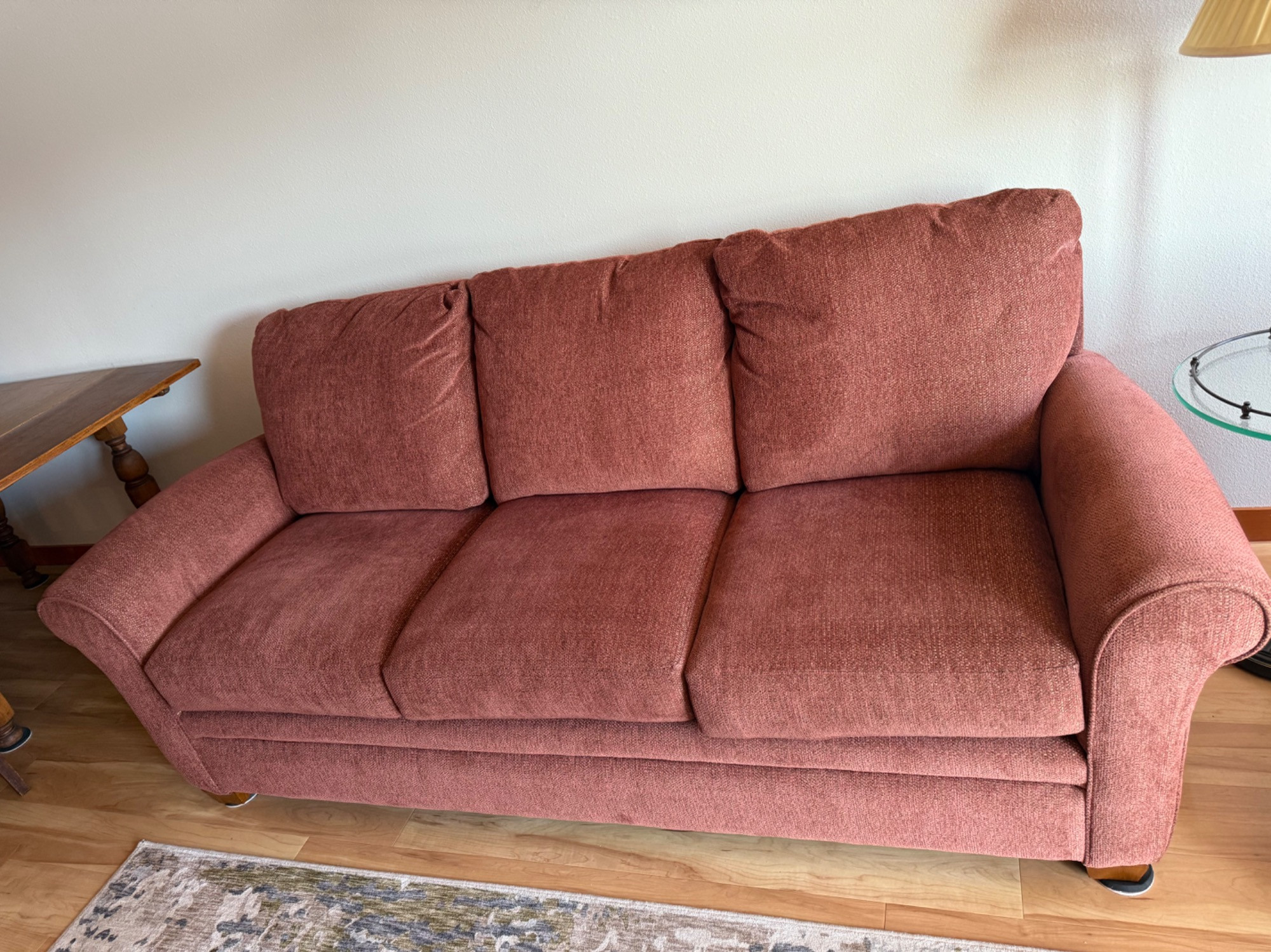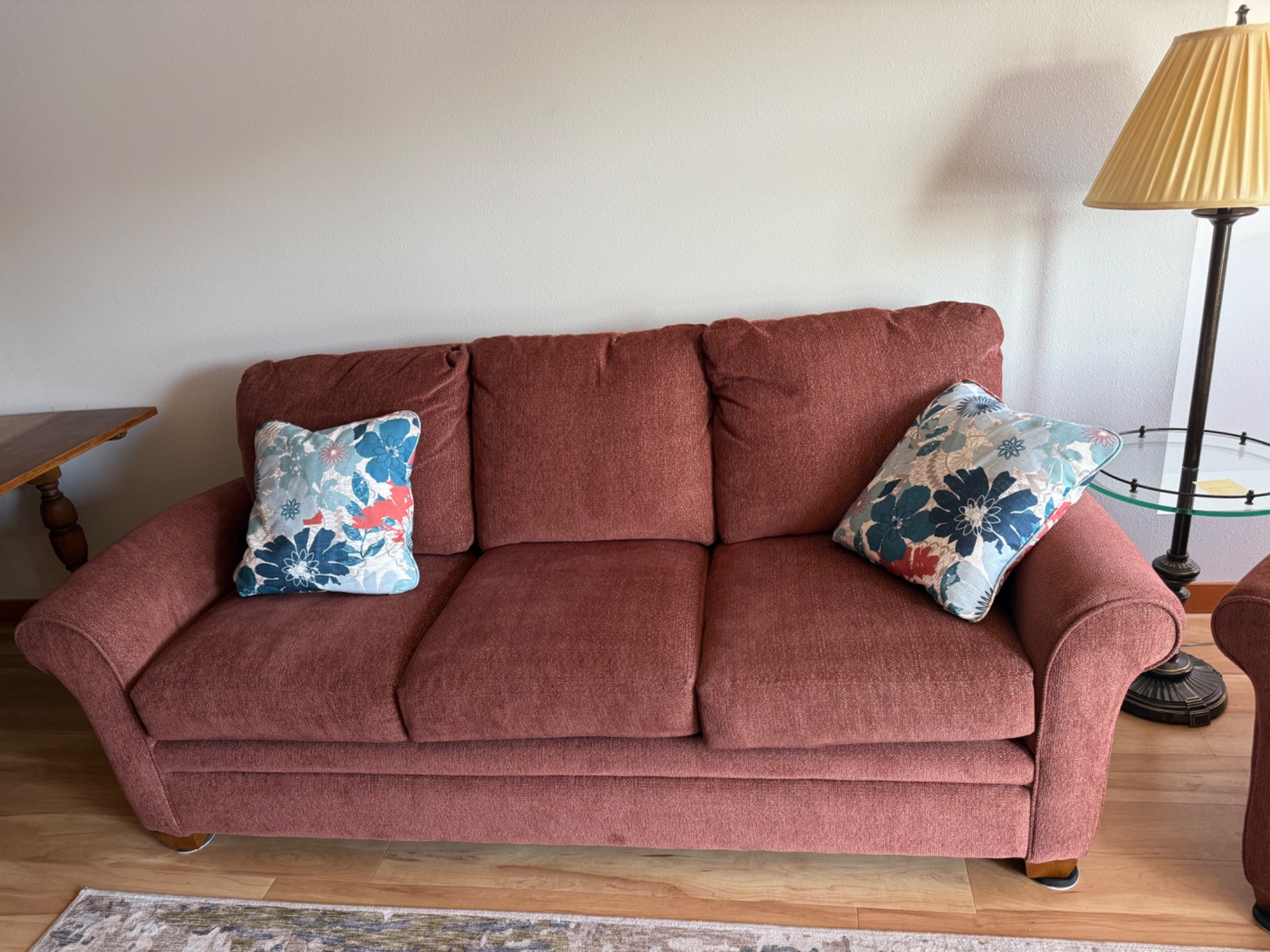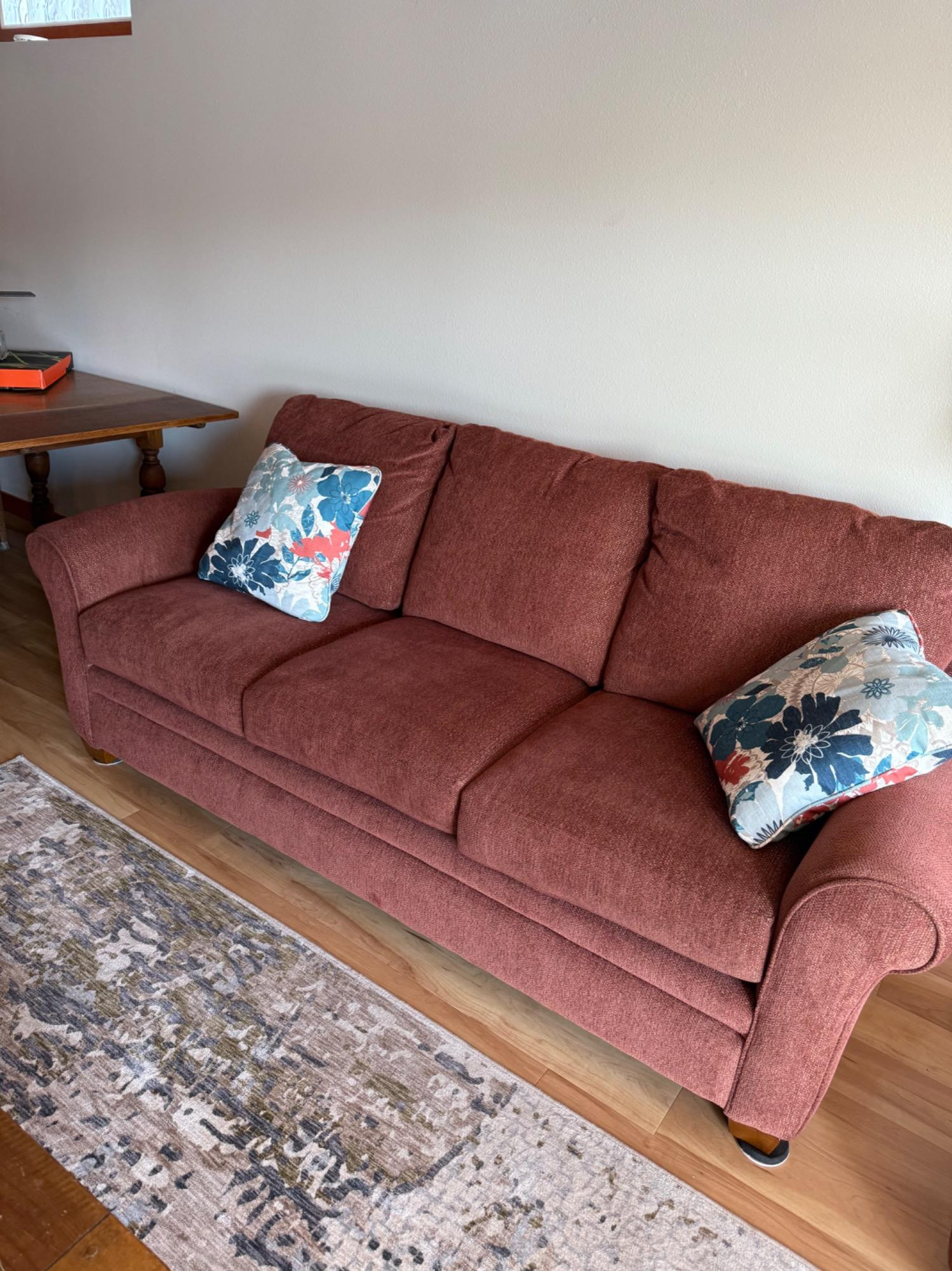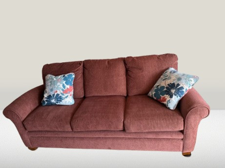 Spacious and stylish La-Z-Boy 3-seater sofa measuring 86” long, 36” wide, and 38” tall 21.5" Deep cushions, with seat cushions 21.5” deep. Comes with two decorative floral pillows for added charm. Perfect for any living room, this sofa combines comfort and elegance in a timeless design. A high-quality addition to your home! Bidding on this lot is an agreement that: (1.) You will have 2 capable, able-bodied persons to lift and load at a minimum. (2.) You will bring a hand truck and/or any other tools needed to remove this item. If these steps are not followed your item will be forfeited and no refund given.