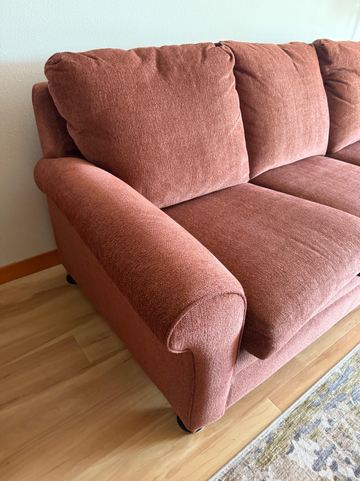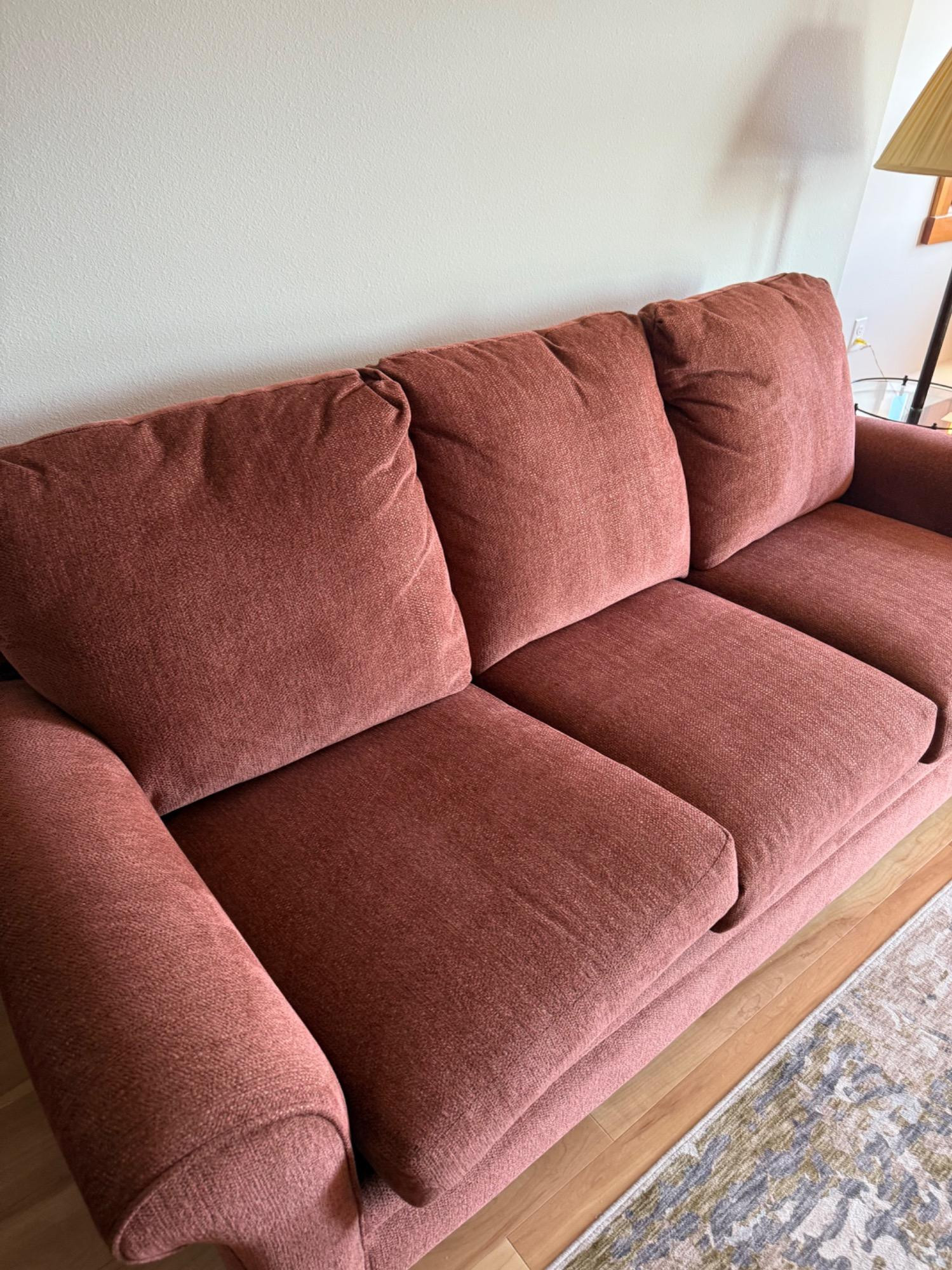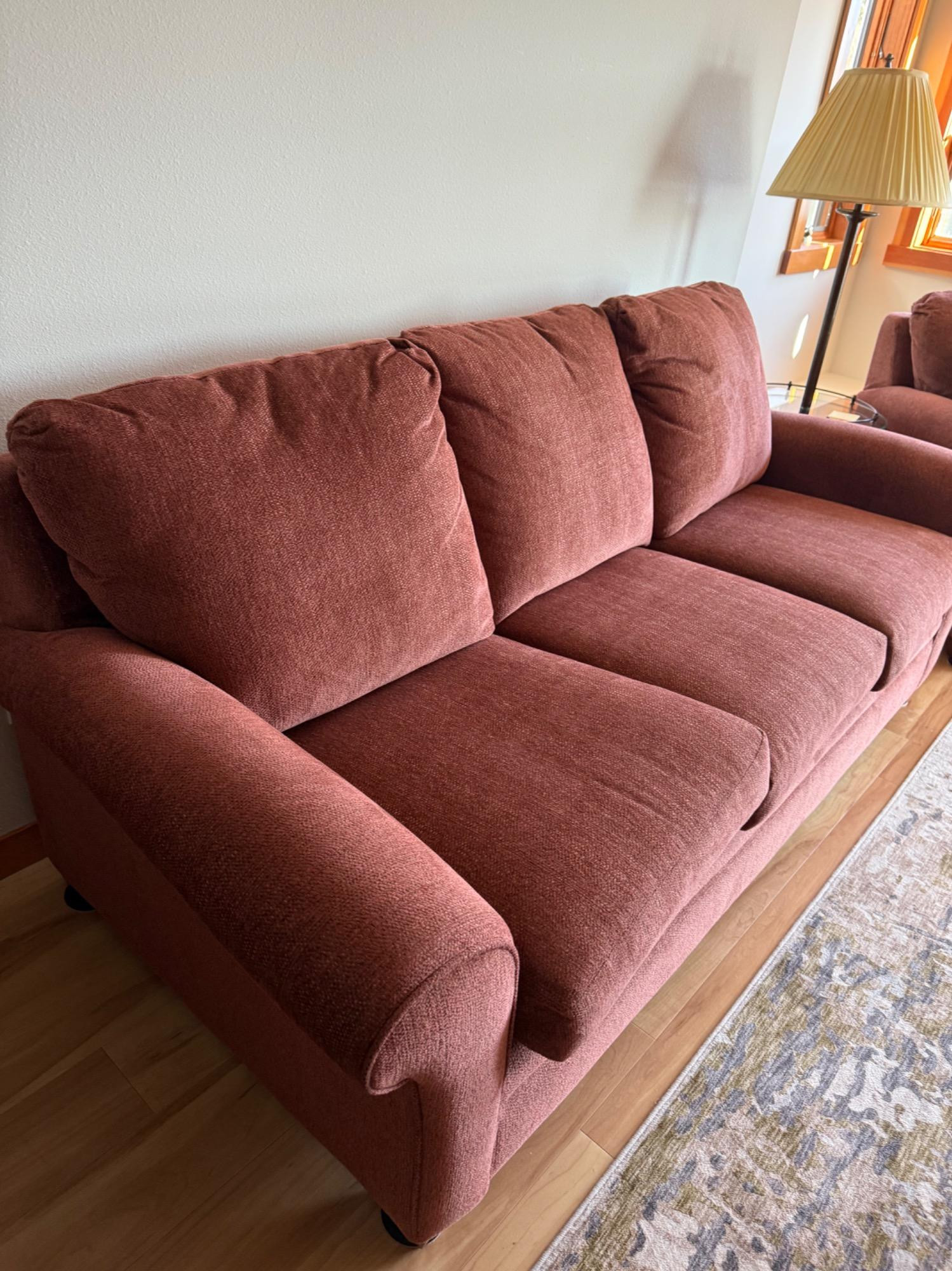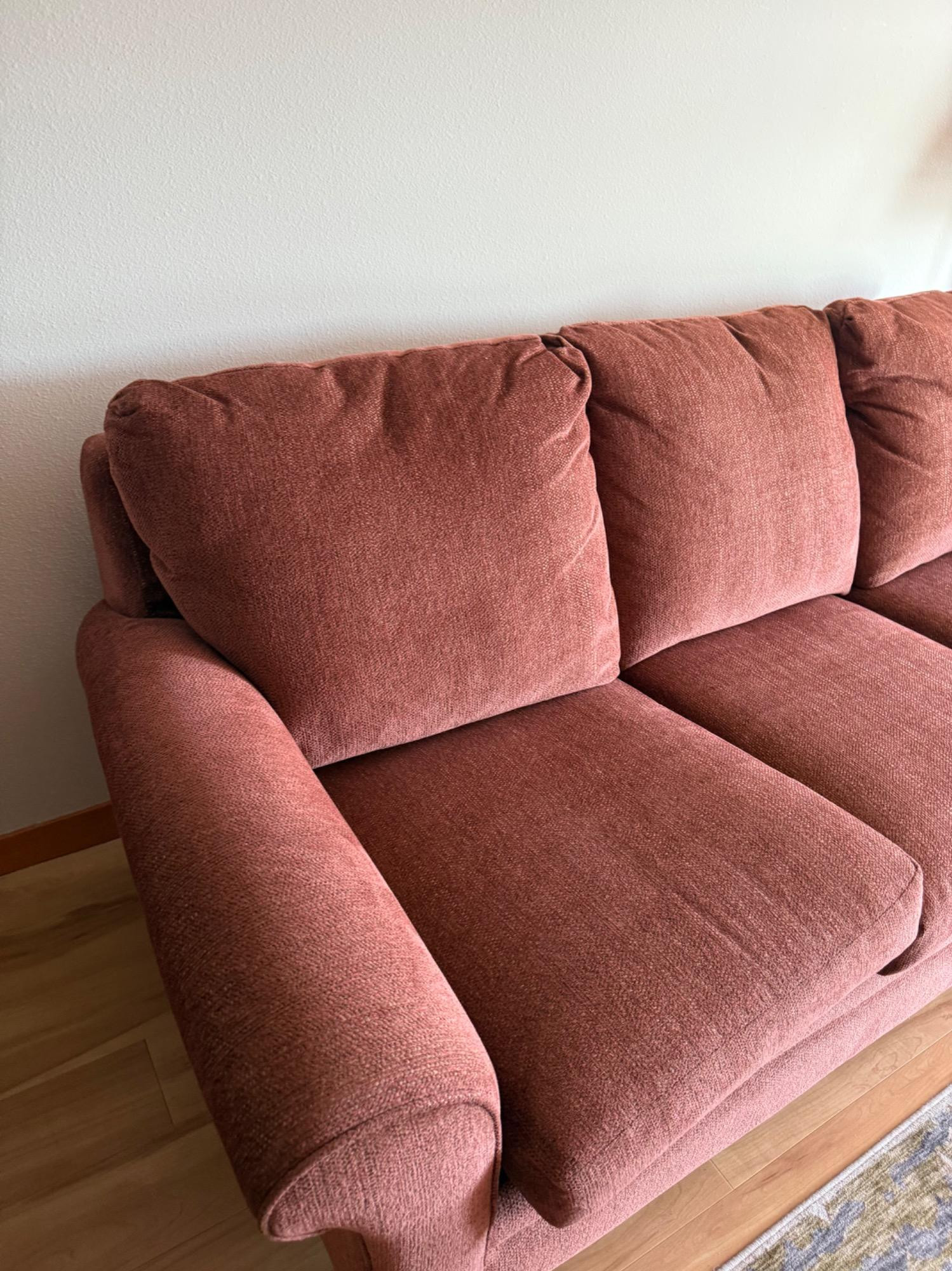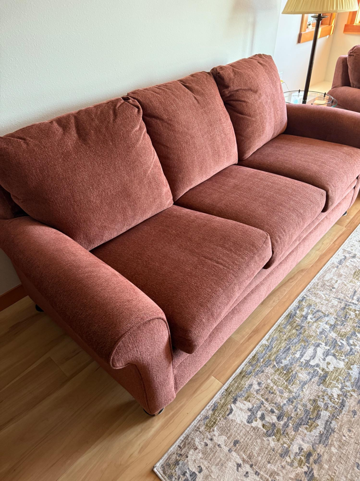 Spacious and stylish La-Z-Boy 3-seater sofa measuring 86” long, 36” wide, and 38” tall 21.5" Deep cushions, with seat cushions 21.5” deep. Comes with two decorative floral pillows for added charm. Perfect for any living room, this sofa combines comfort and elegance in a timeless design. A high-quality addition to your home! Bidding on this lot is an agreement that: (1.) You will have 2 capable, able-bodied persons to lift and load at a minimum. (2.) You will bring a hand truck and/or any other tools needed to remove this item. If these steps are not followed your item will be forfeited and no refund given.