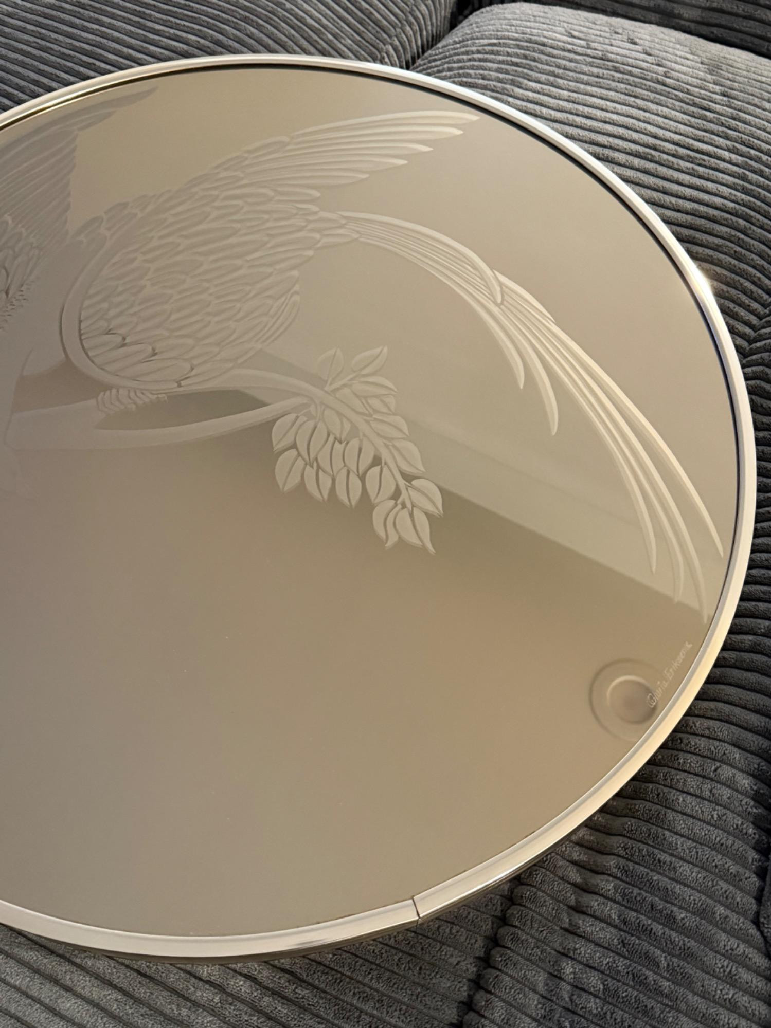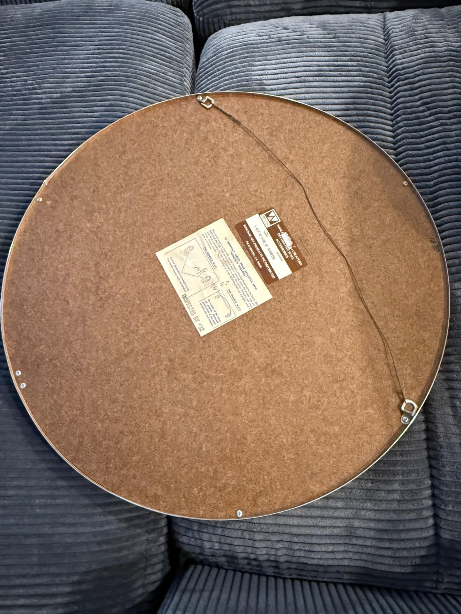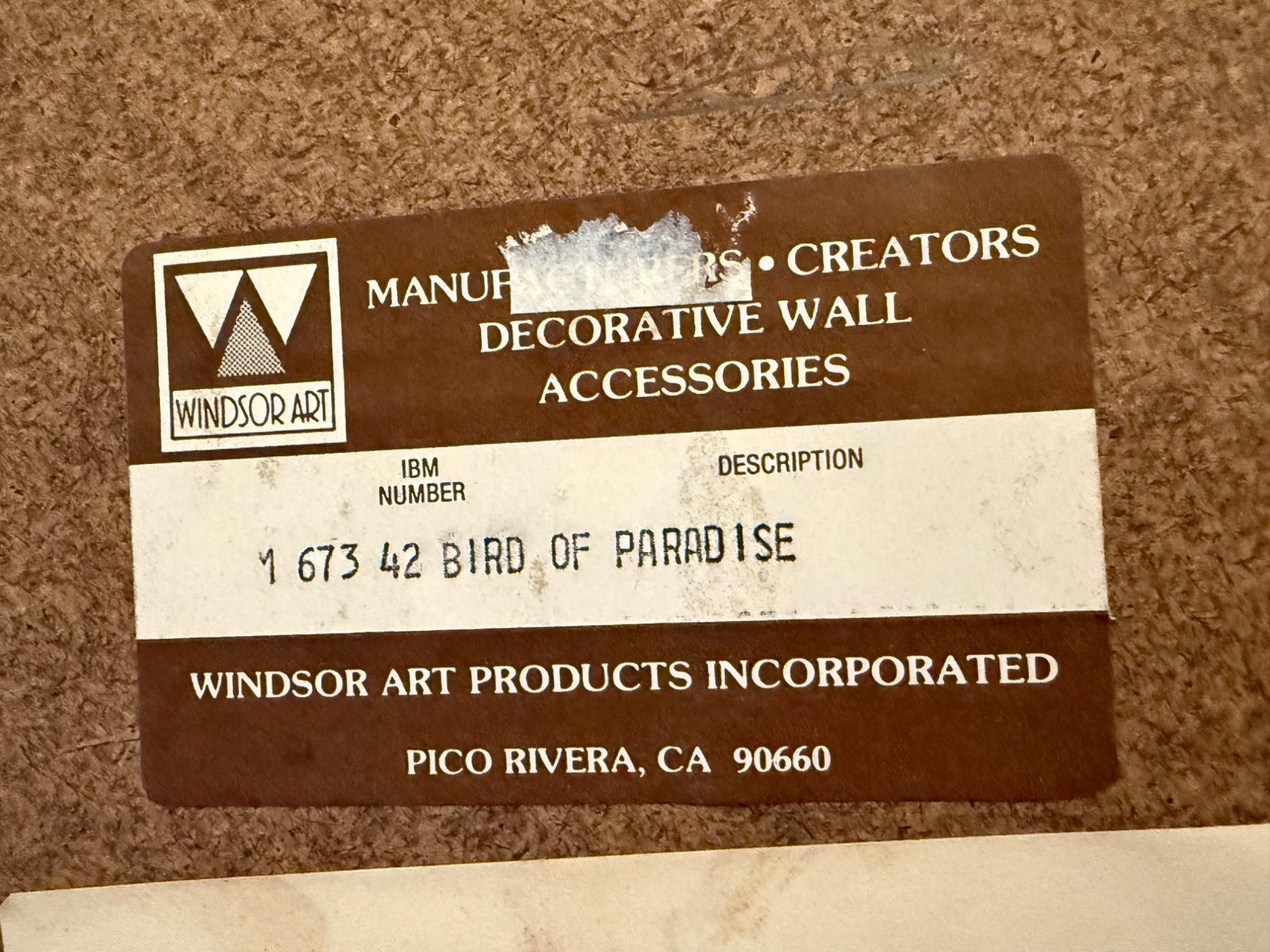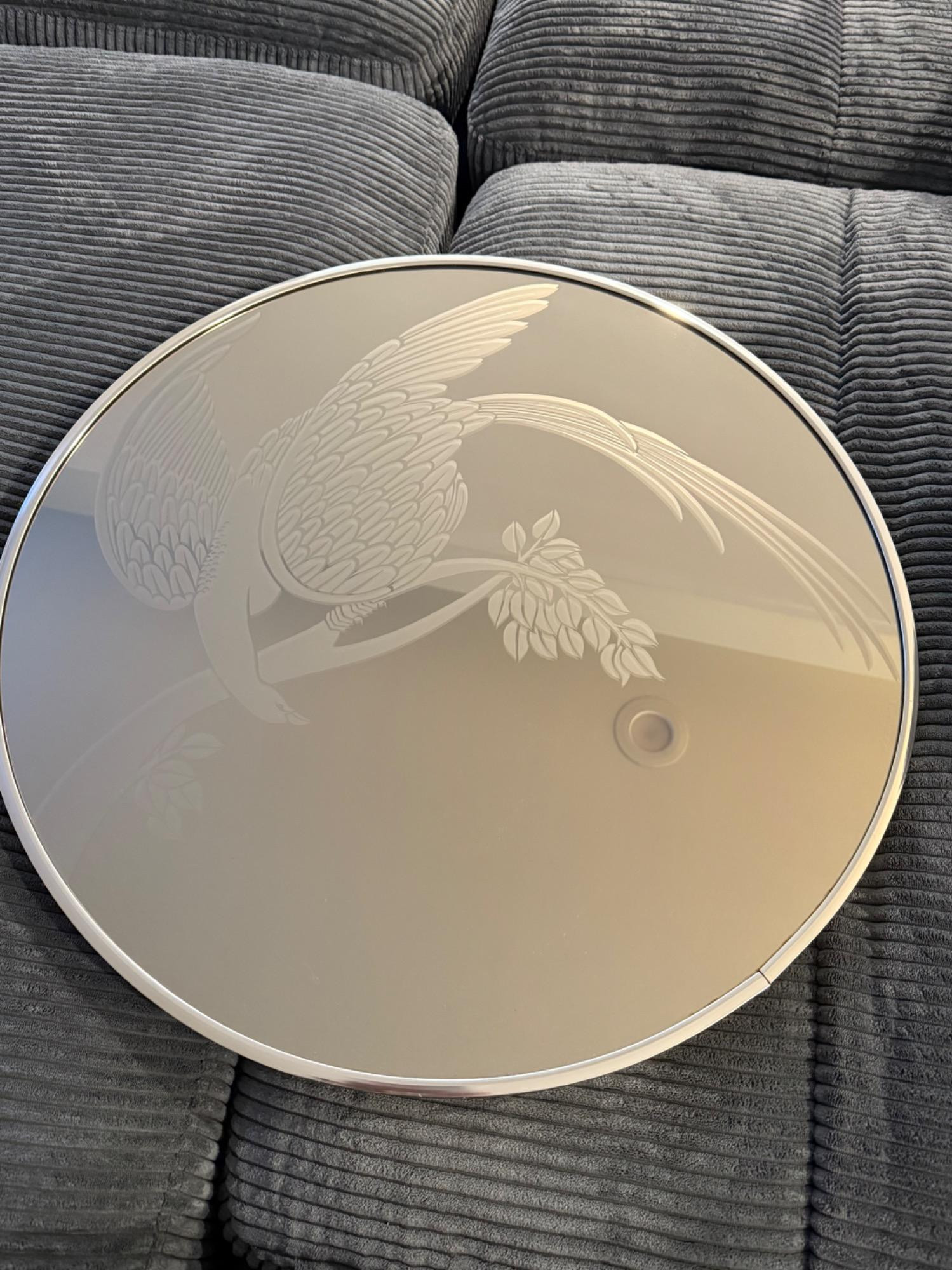 Gorgeous Mid-Century Modern etched mirror featuring a detailed "Bird of Paradise" design, crafted by Windsor Art Products. This stunning piece includes a silver-toned frame and measures 23.5” in diameter. A sophisticated and timeless addition to any decor, perfect for collectors or enthusiasts of MCM design!