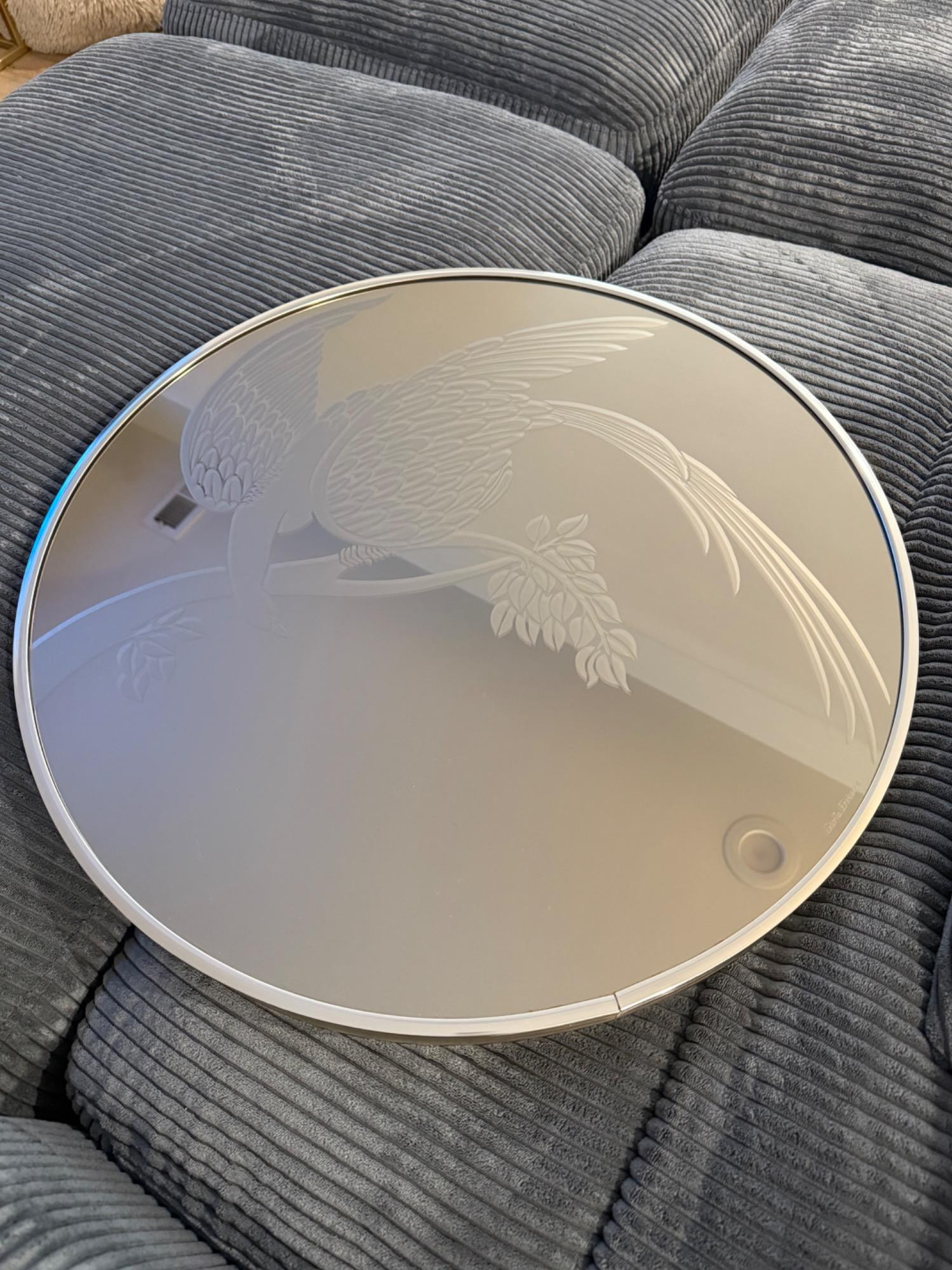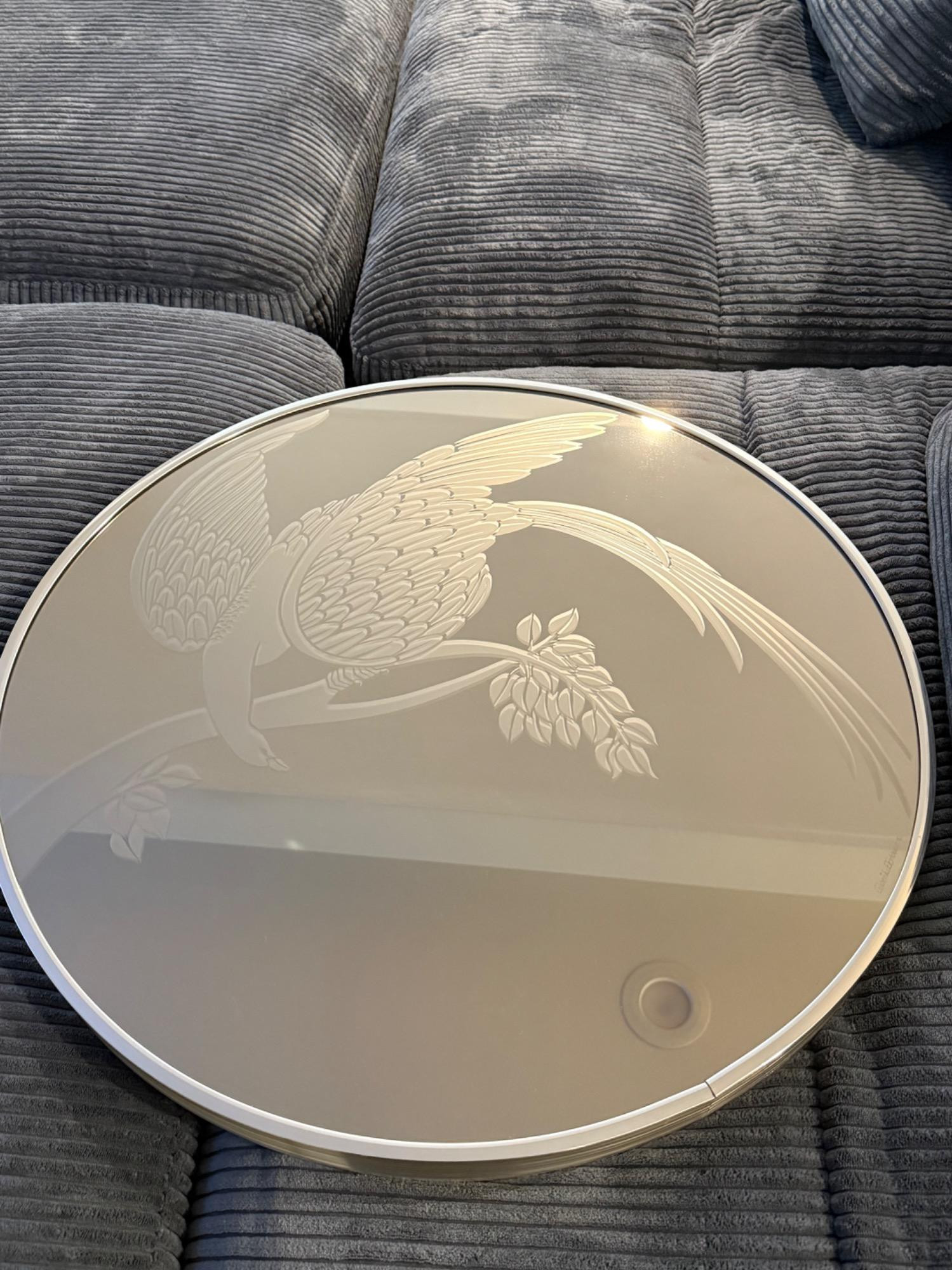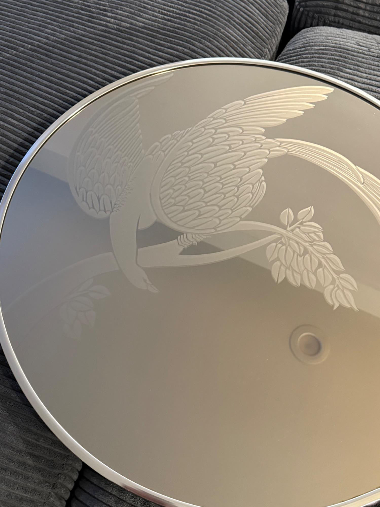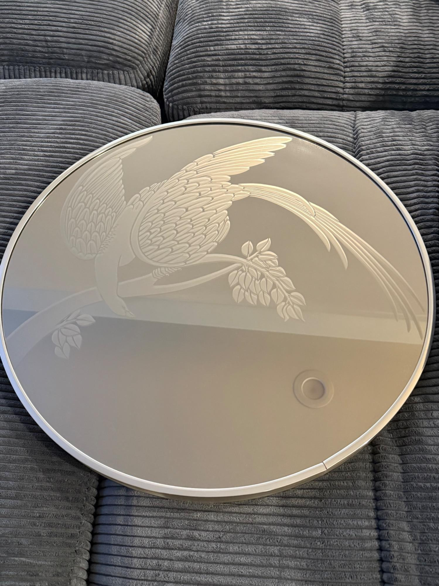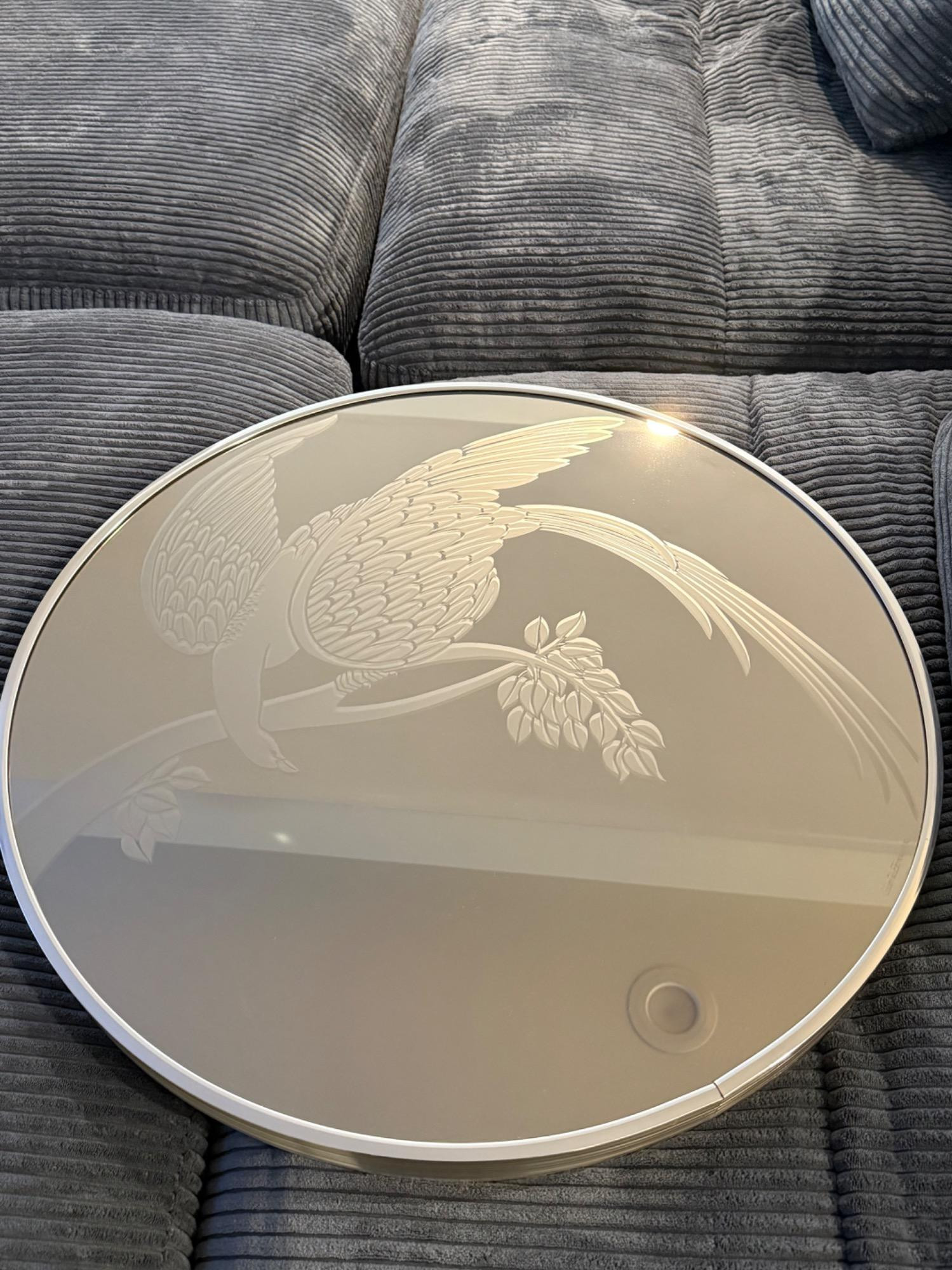 Gorgeous Mid-Century Modern etched mirror featuring a detailed "Bird of Paradise" design, crafted by Windsor Art Products. This stunning piece includes a silver-toned frame and measures 23.5” in diameter. A sophisticated and timeless addition to any decor, perfect for collectors or enthusiasts of MCM design!