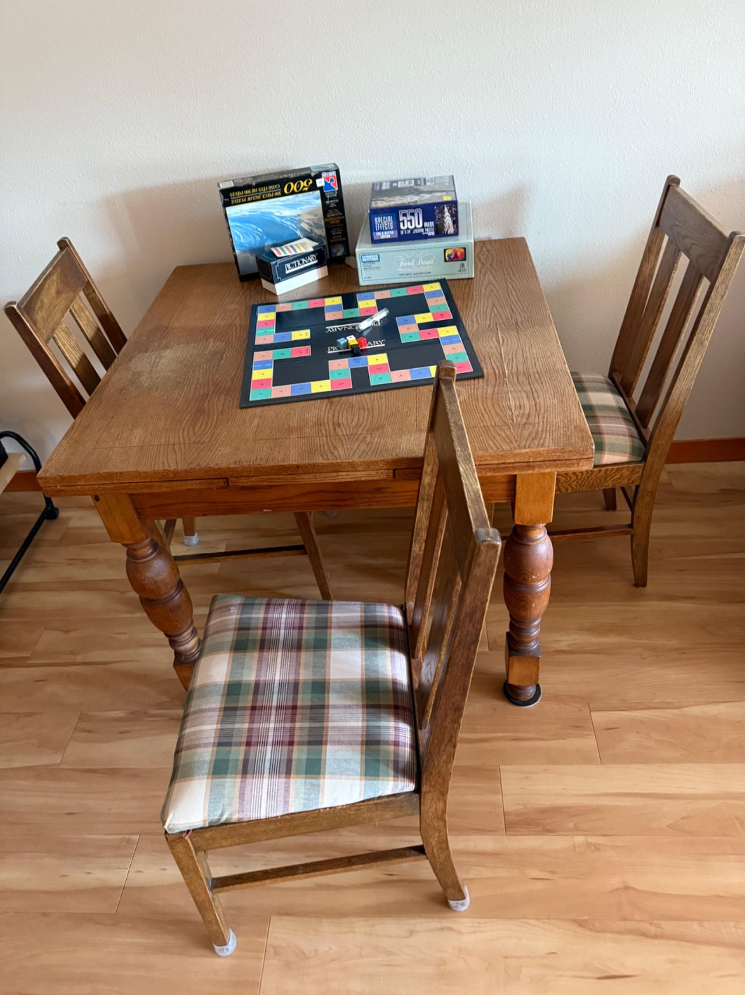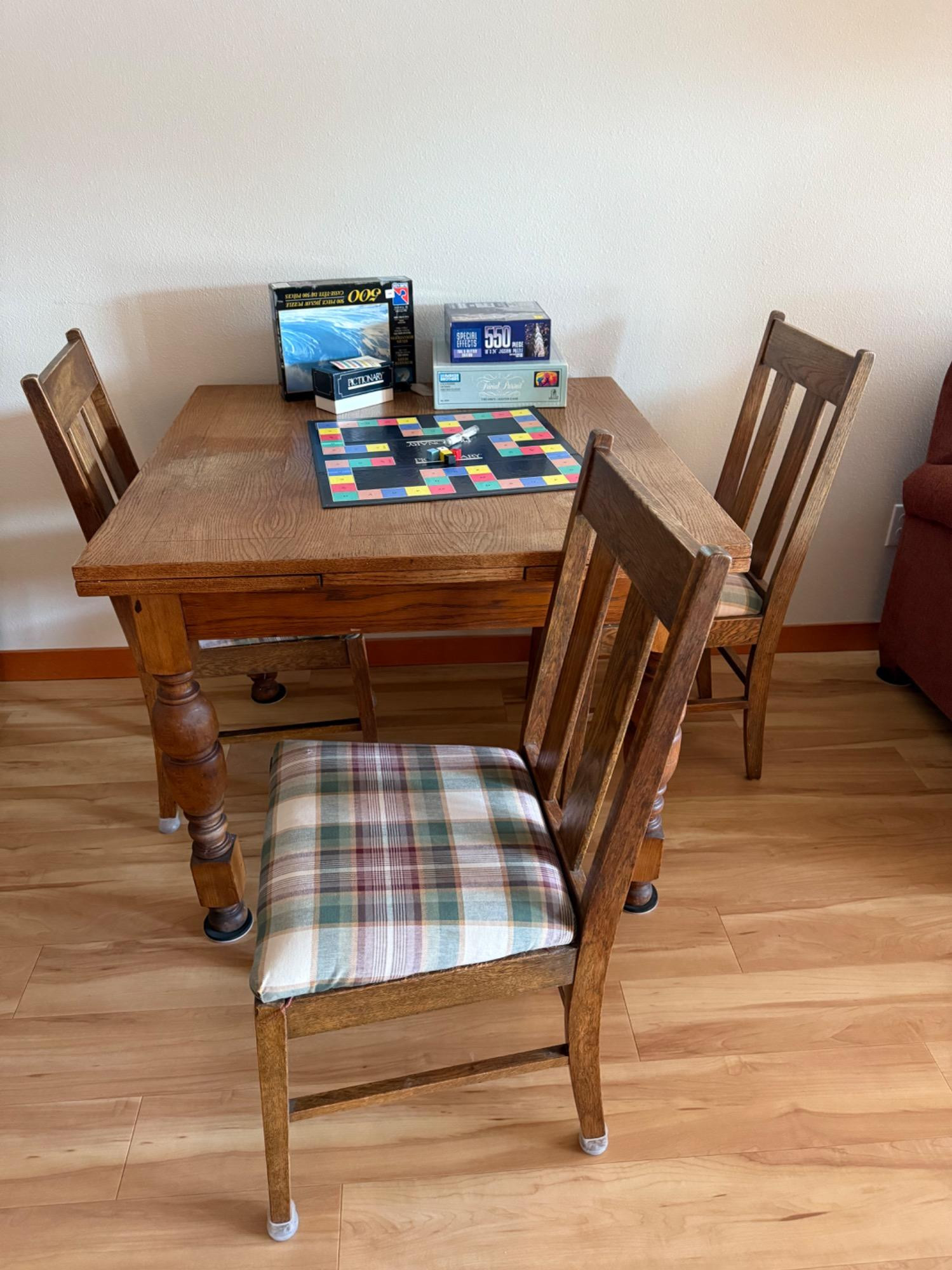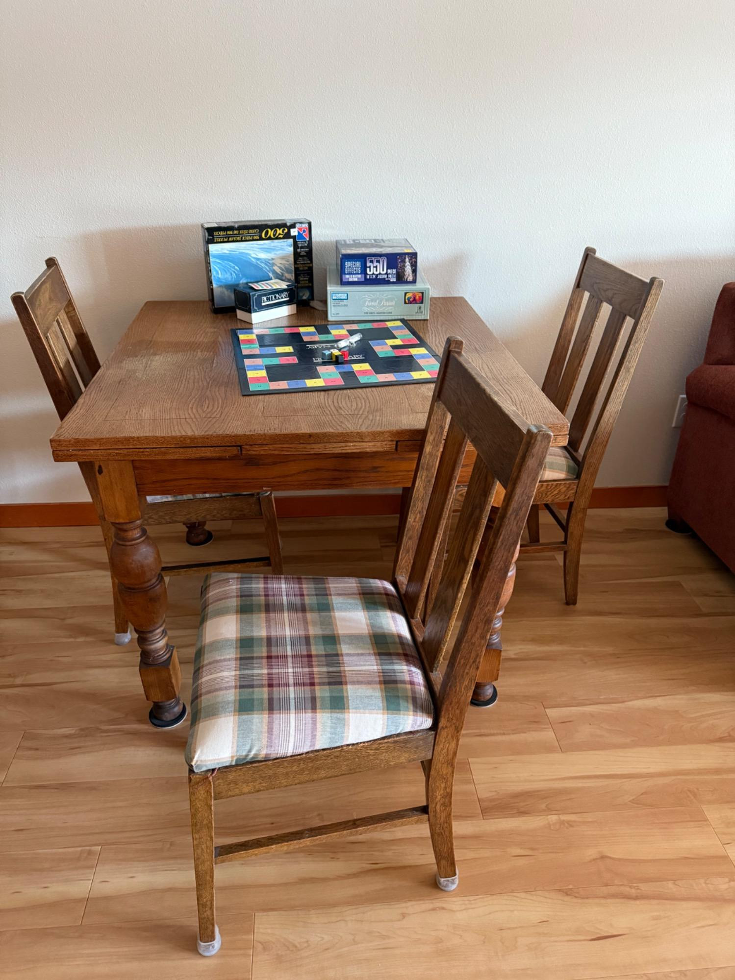 Versatile game table with an extendable design, perfect for family game nights or casual dining. The table measures 61.5” long (extended), 36” wide, and 30” tall, and includes three matching chairs (17” W x 16.5” D x 37” T) with comfortable plaid cushions. Comes with popular games like Pictionary, a glow play table tennis set, and more. A fun and functional addition to any home! Bidding on this lot is an agreement that: (1.) You will have 2 capable, able-bodied persons to lift and load at a minimum. (2.) You will bring a hand truck and/or any other tools needed to remove this item. If these steps are not followed your item will be forfeited and no refund given.