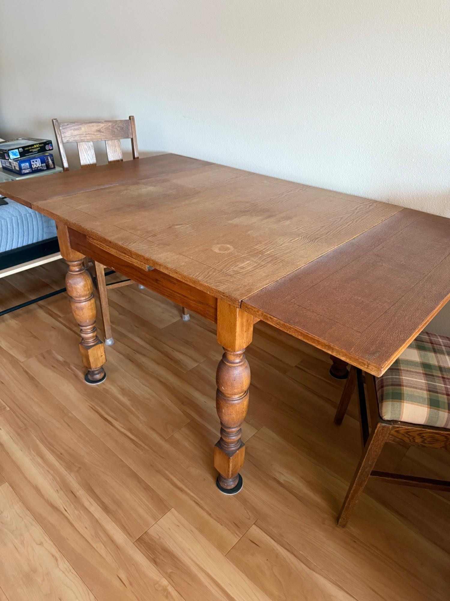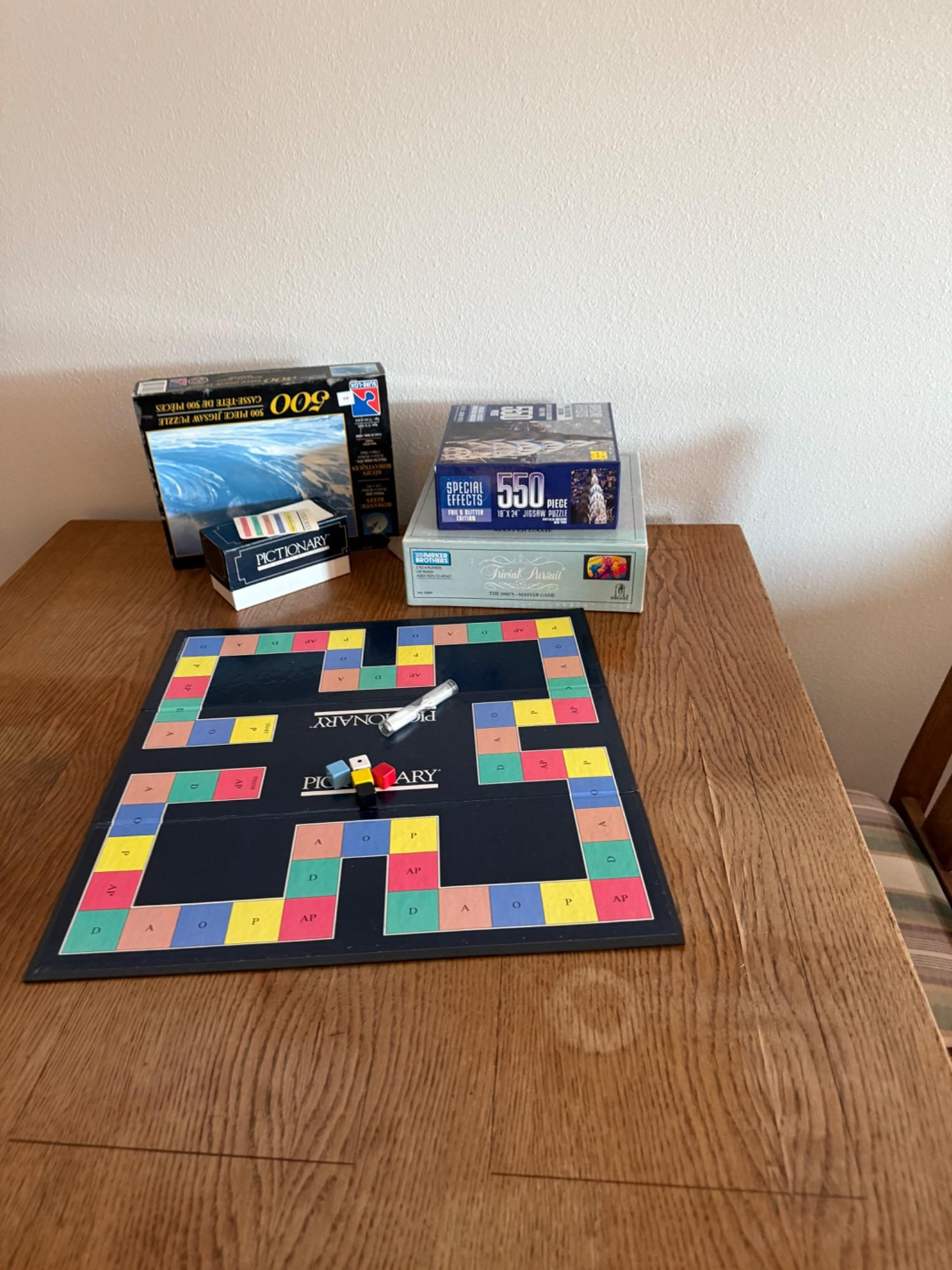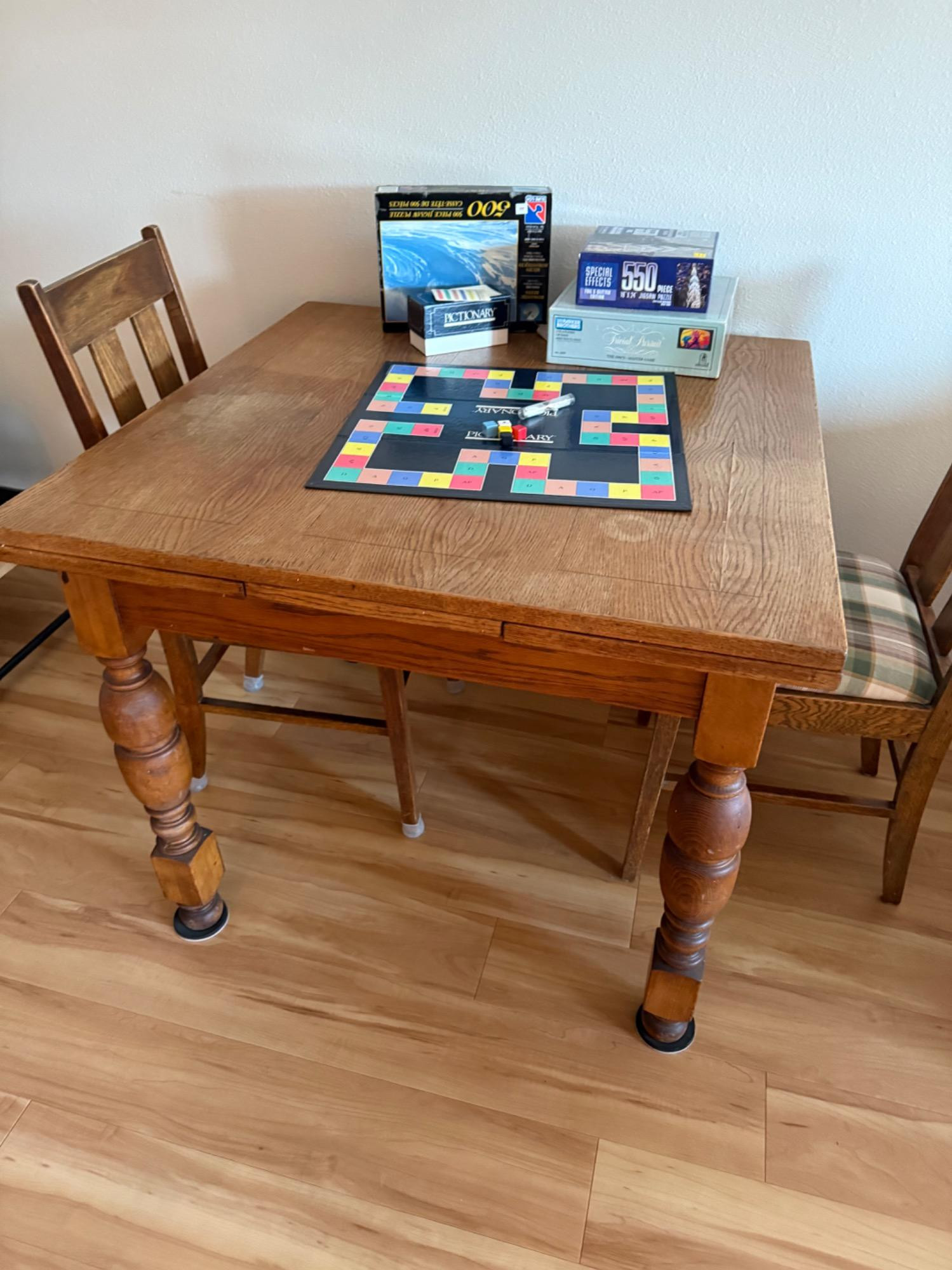 Versatile game table with an extendable design, perfect for family game nights or casual dining. The table measures 61.5” long (extended), 36” wide, and 30” tall, and includes three matching chairs (17” W x 16.5” D x 37” T) with comfortable plaid cushions. Comes with popular games like Pictionary, a glow play table tennis set, and more. A fun and functional addition to any home! Bidding on this lot is an agreement that: (1.) You will have 2 capable, able-bodied persons to lift and load at a minimum. (2.) You will bring a hand truck and/or any other tools needed to remove this item. If these steps are not followed your item will be forfeited and no refund given.
