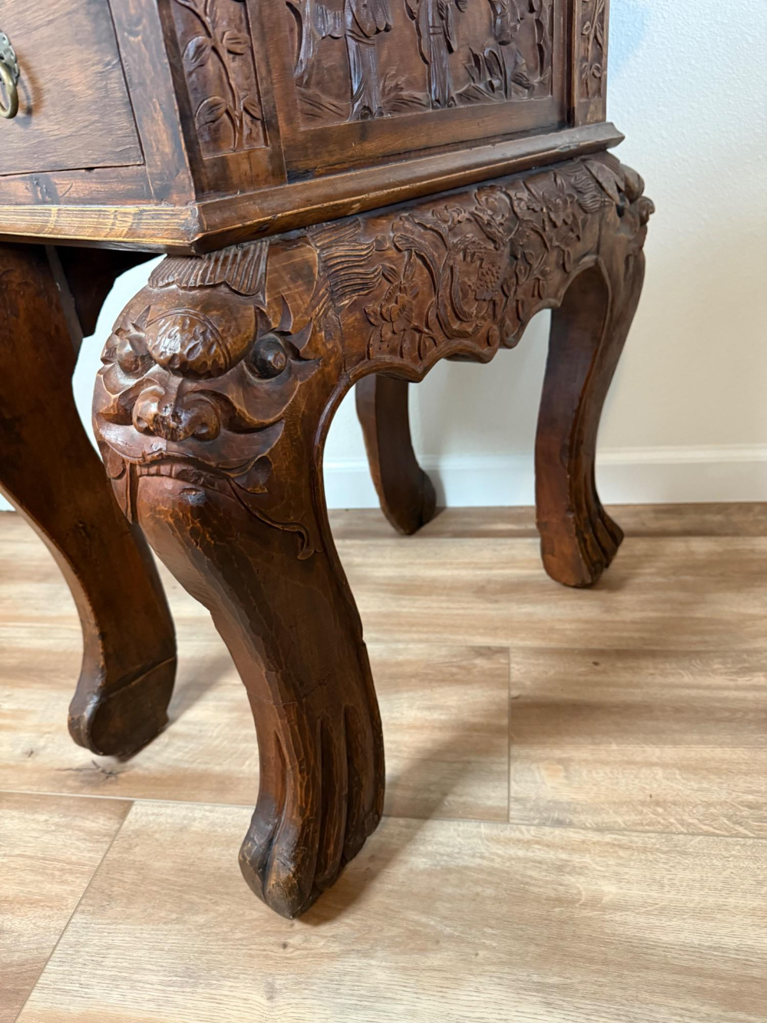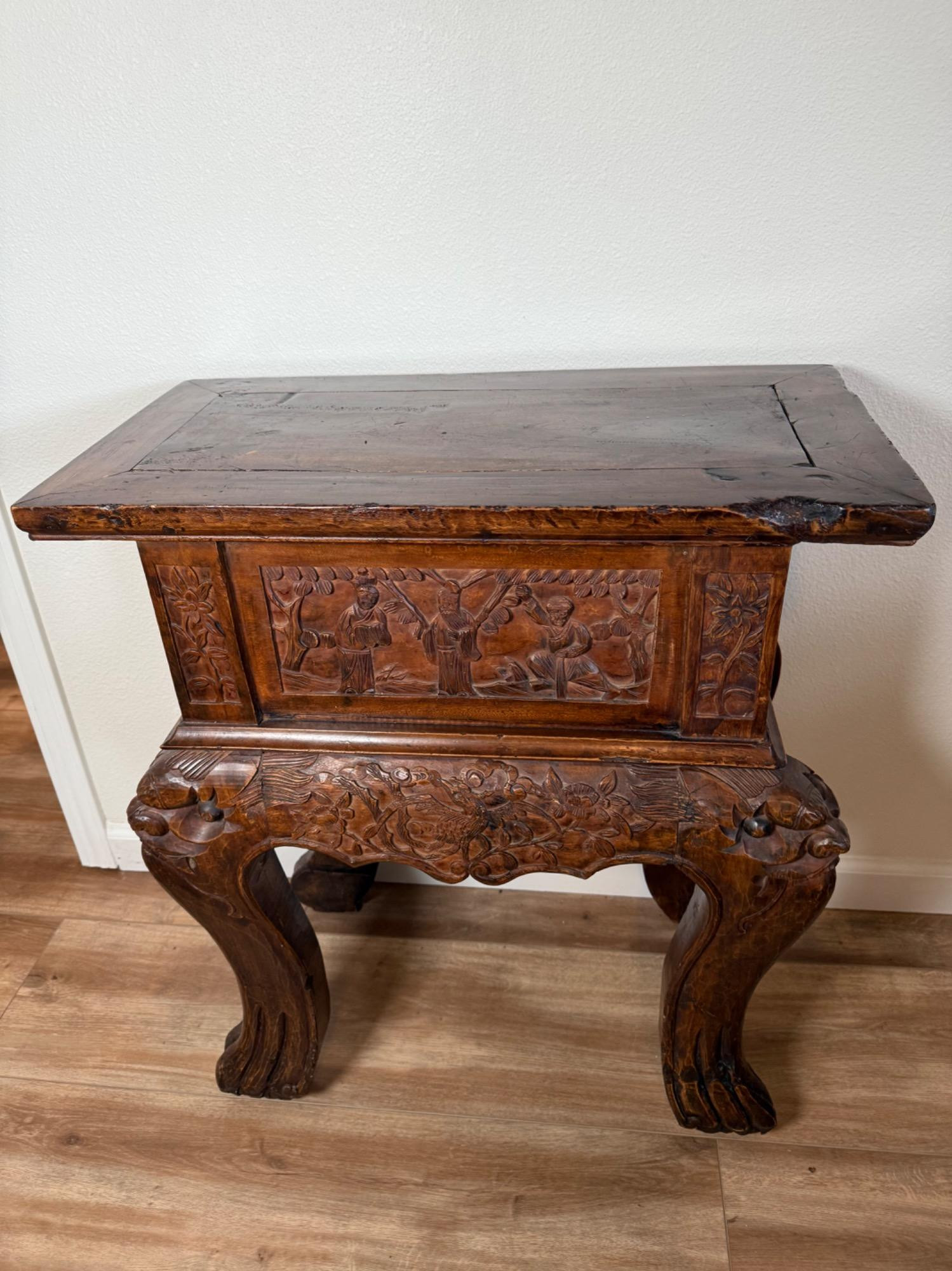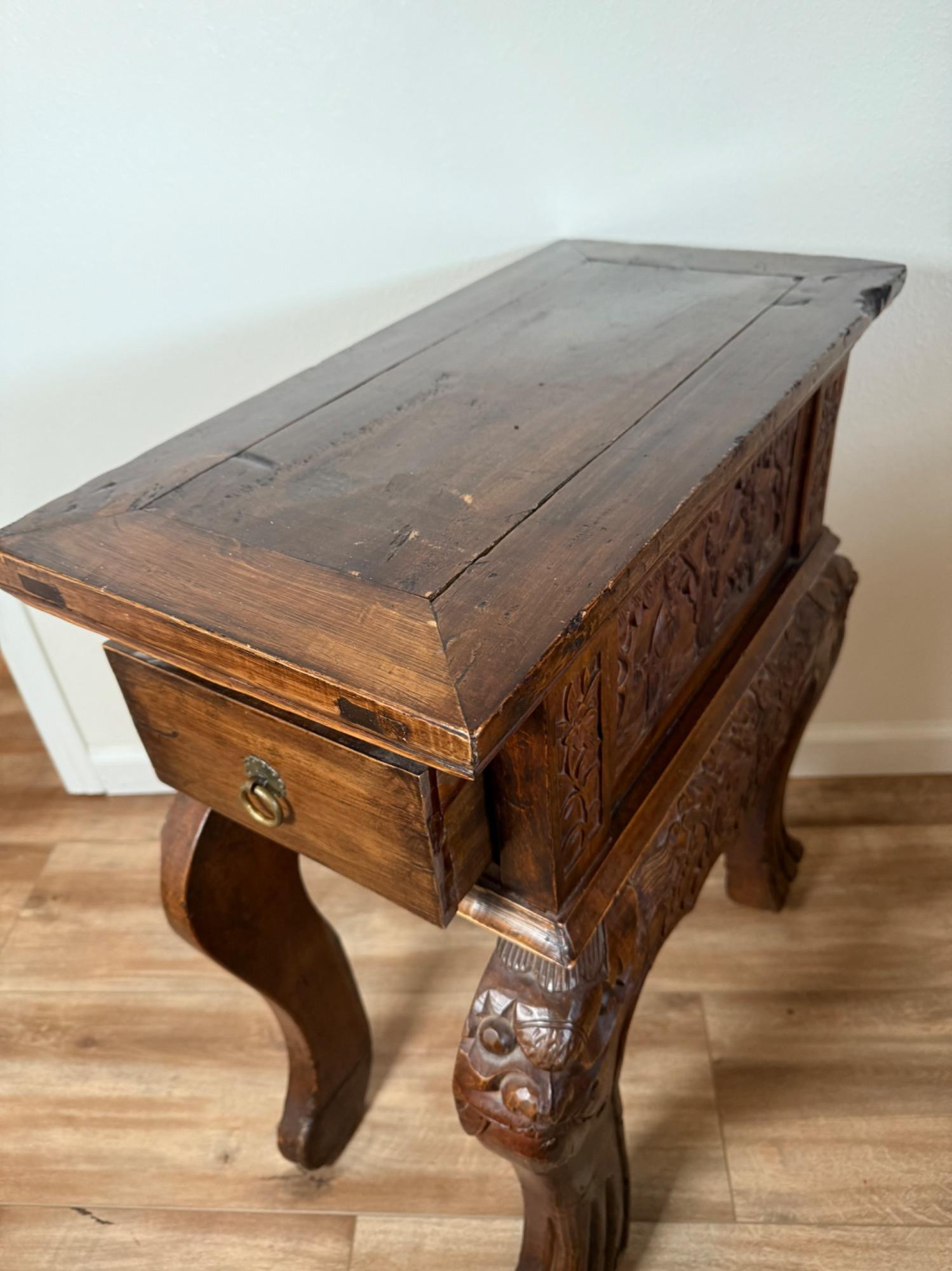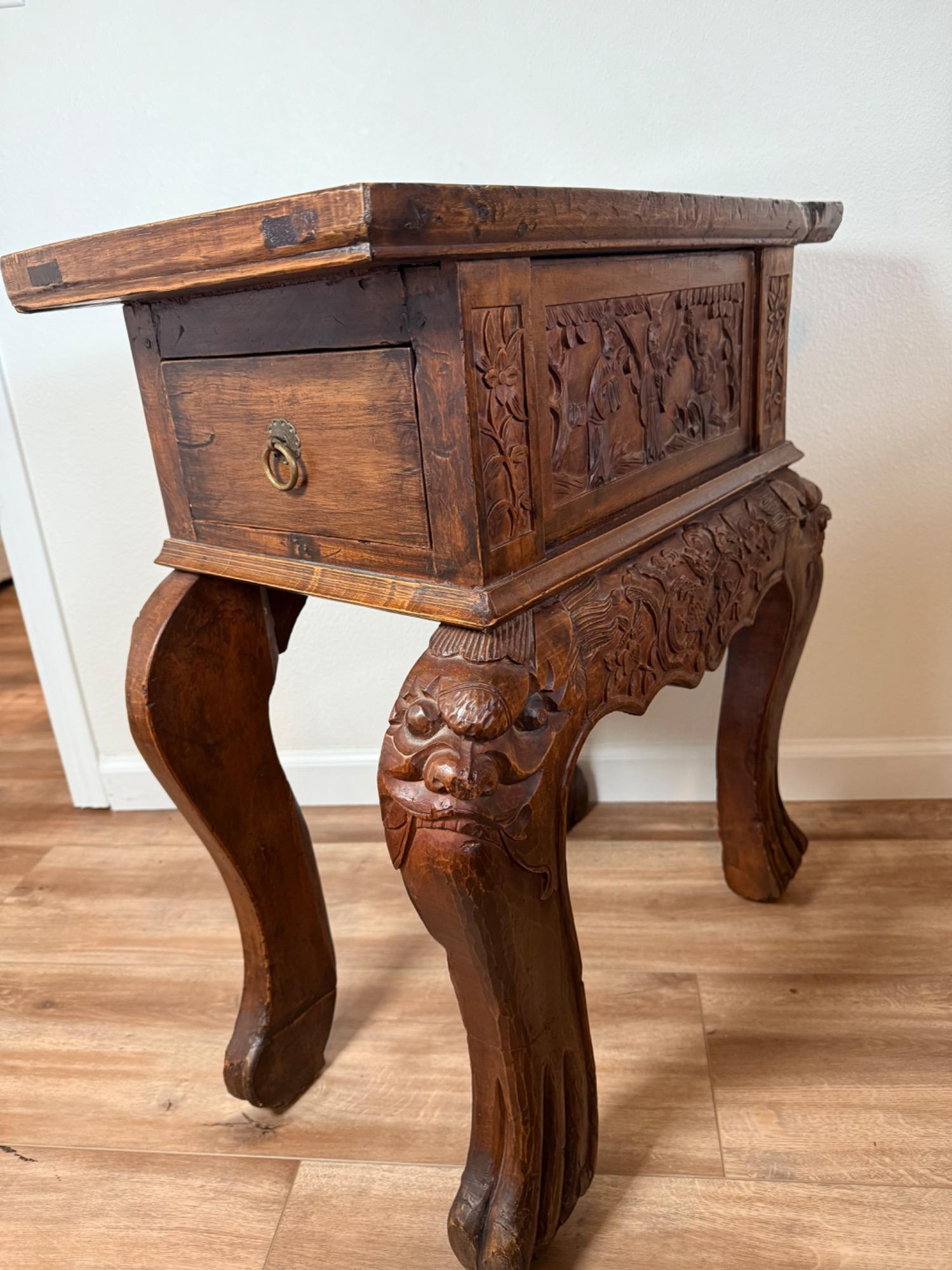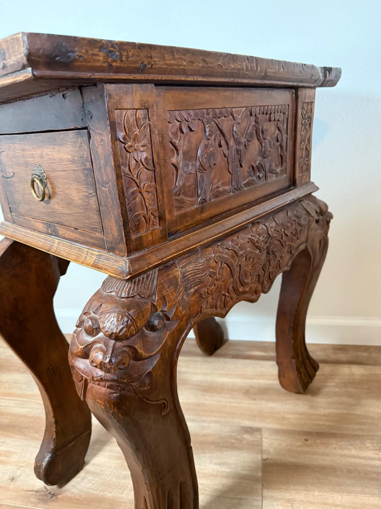 Beautifully hand-carved Asian table featuring intricate floral and animal motifs on the sides and legs, along with a functional drawer for storage. Measuring 24"D x 12"W x 28"T, this piece is the perfect size for use as an accent table or a unique focal point in any room. The detailed craftsmanship and unique design make this table a stunning addition to any home. Bidding on this lot is an agreement that: (1.) You will have 2 capable, able-bodied persons to lift and load at a minimum. (2.) You will bring a hand truck and/or any other tools needed to remove this item. If these steps are not followed your item will be forfeited and no refund given.