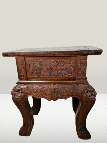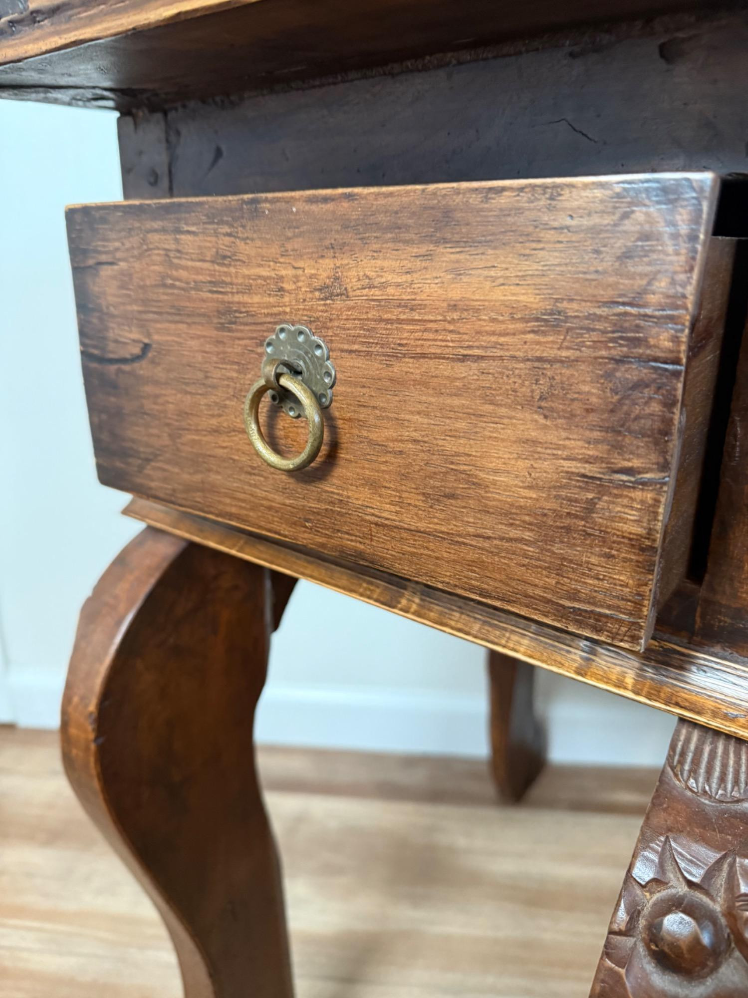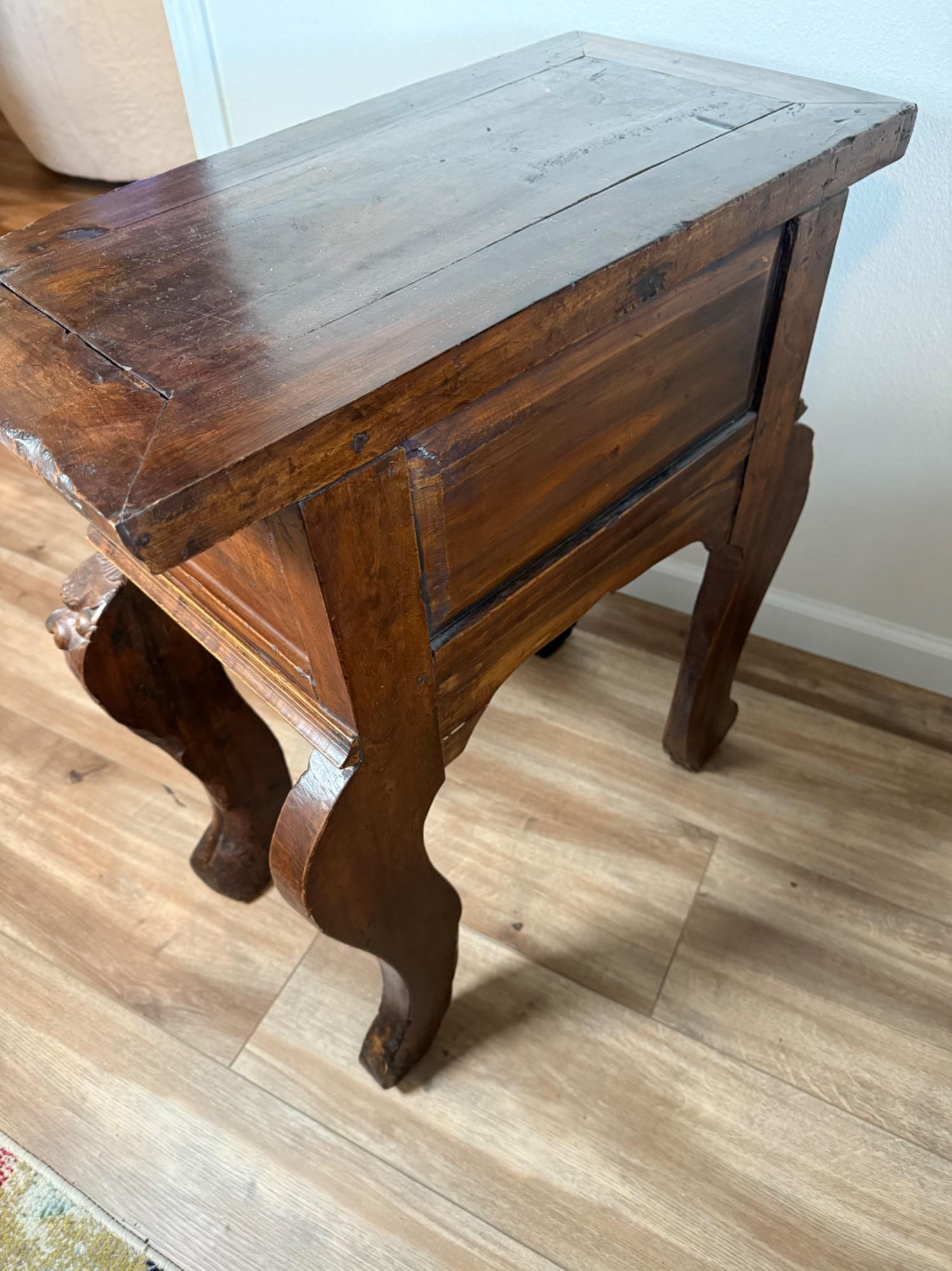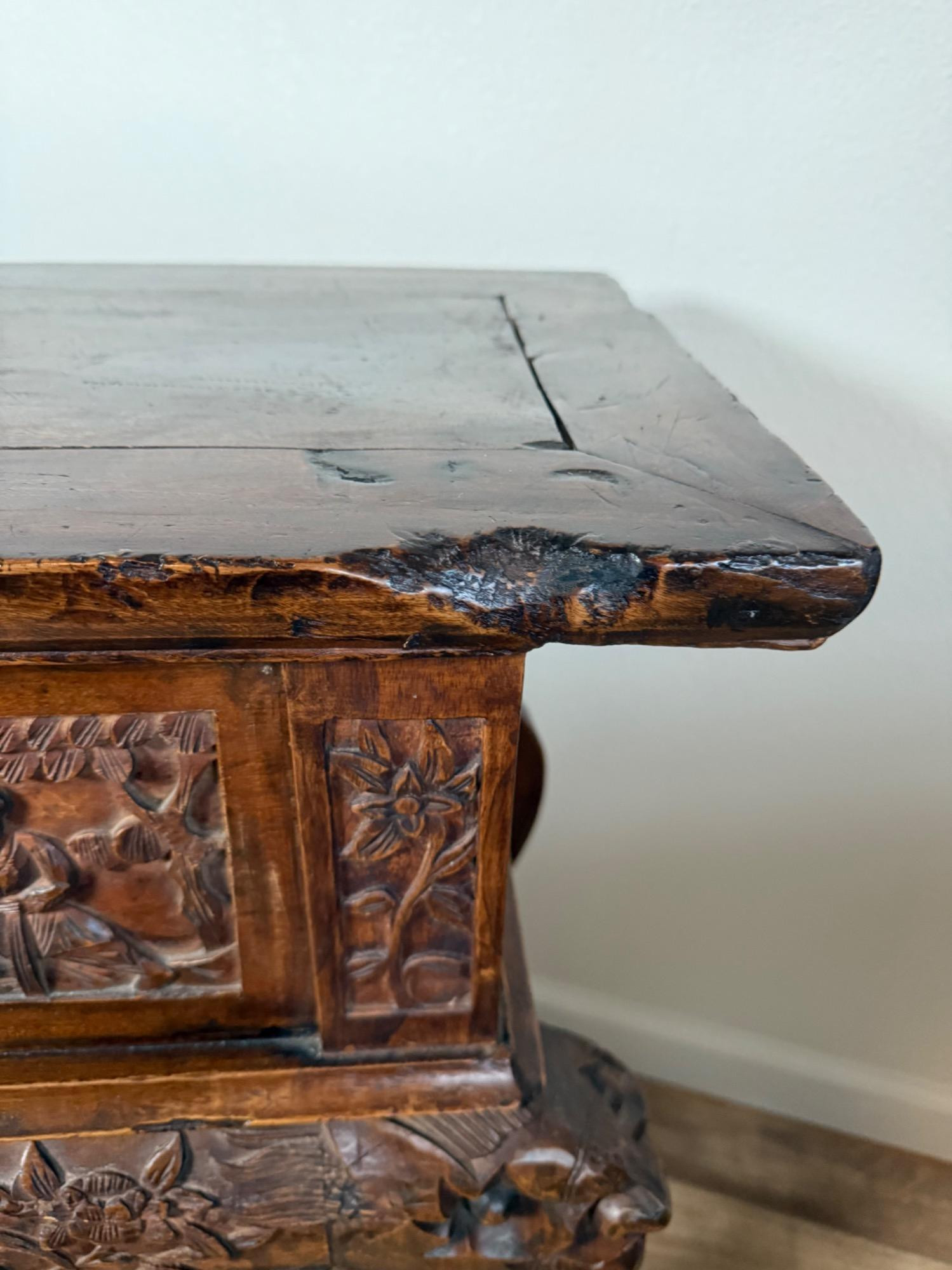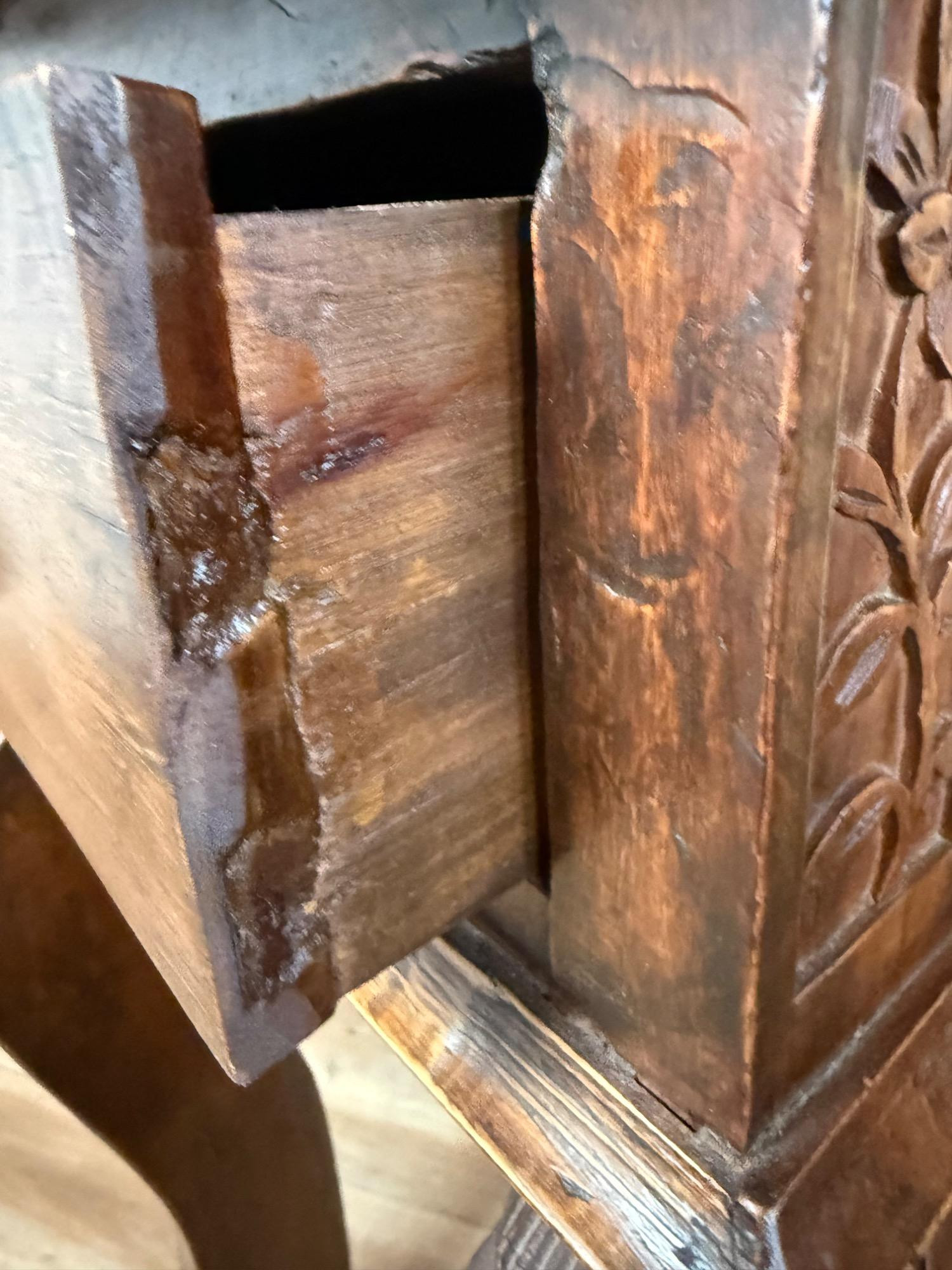 Beautifully hand-carved Asian table featuring intricate floral and animal motifs on the sides and legs, along with a functional drawer for storage. Measuring 24"D x 12"W x 28"T, this piece is the perfect size for use as an accent table or a unique focal point in any room. The detailed craftsmanship and unique design make this table a stunning addition to any home. Bidding on this lot is an agreement that: (1.) You will have 2 capable, able-bodied persons to lift and load at a minimum. (2.) You will bring a hand truck and/or any other tools needed to remove this item. If these steps are not followed your item will be forfeited and no refund given.