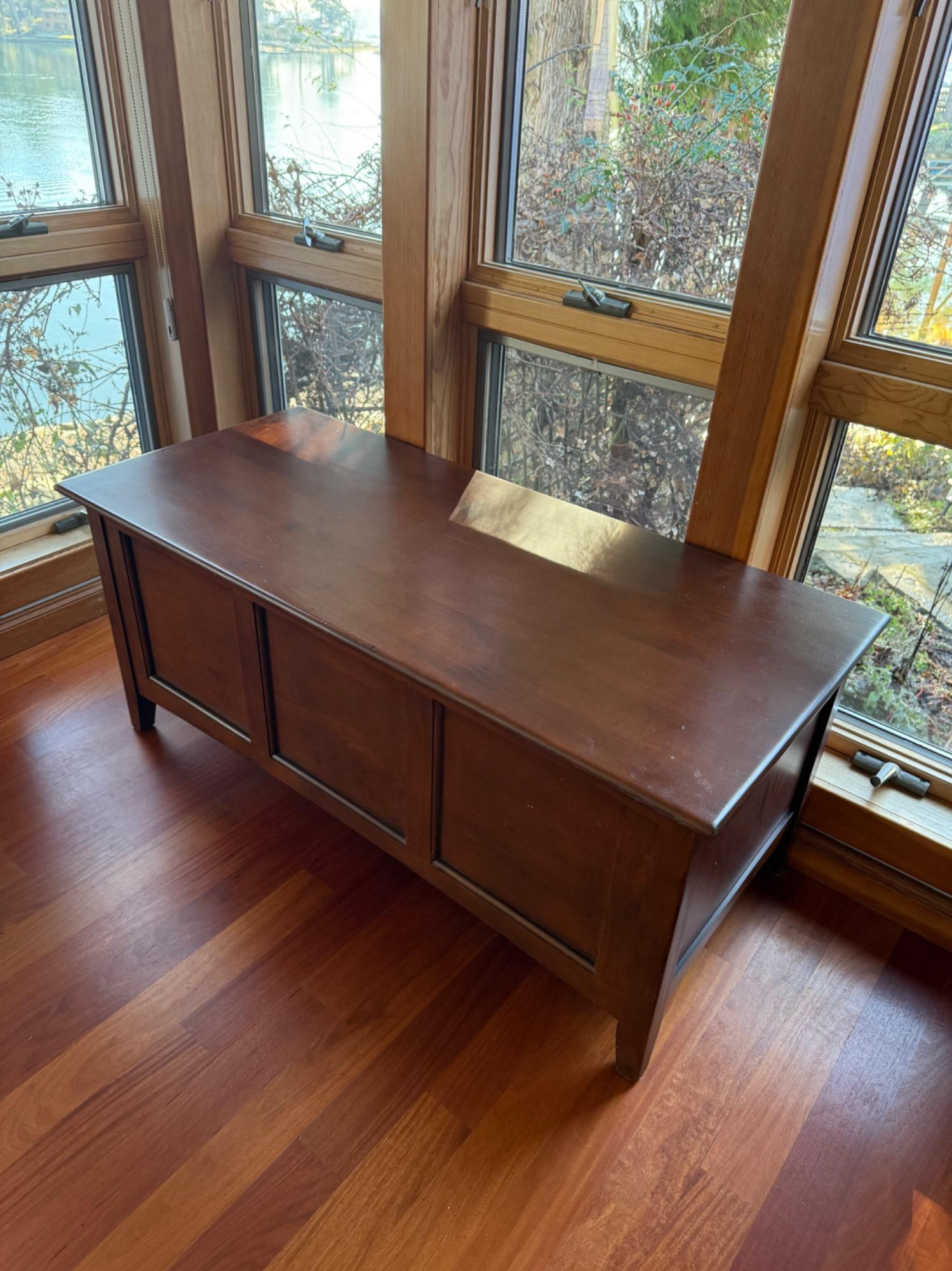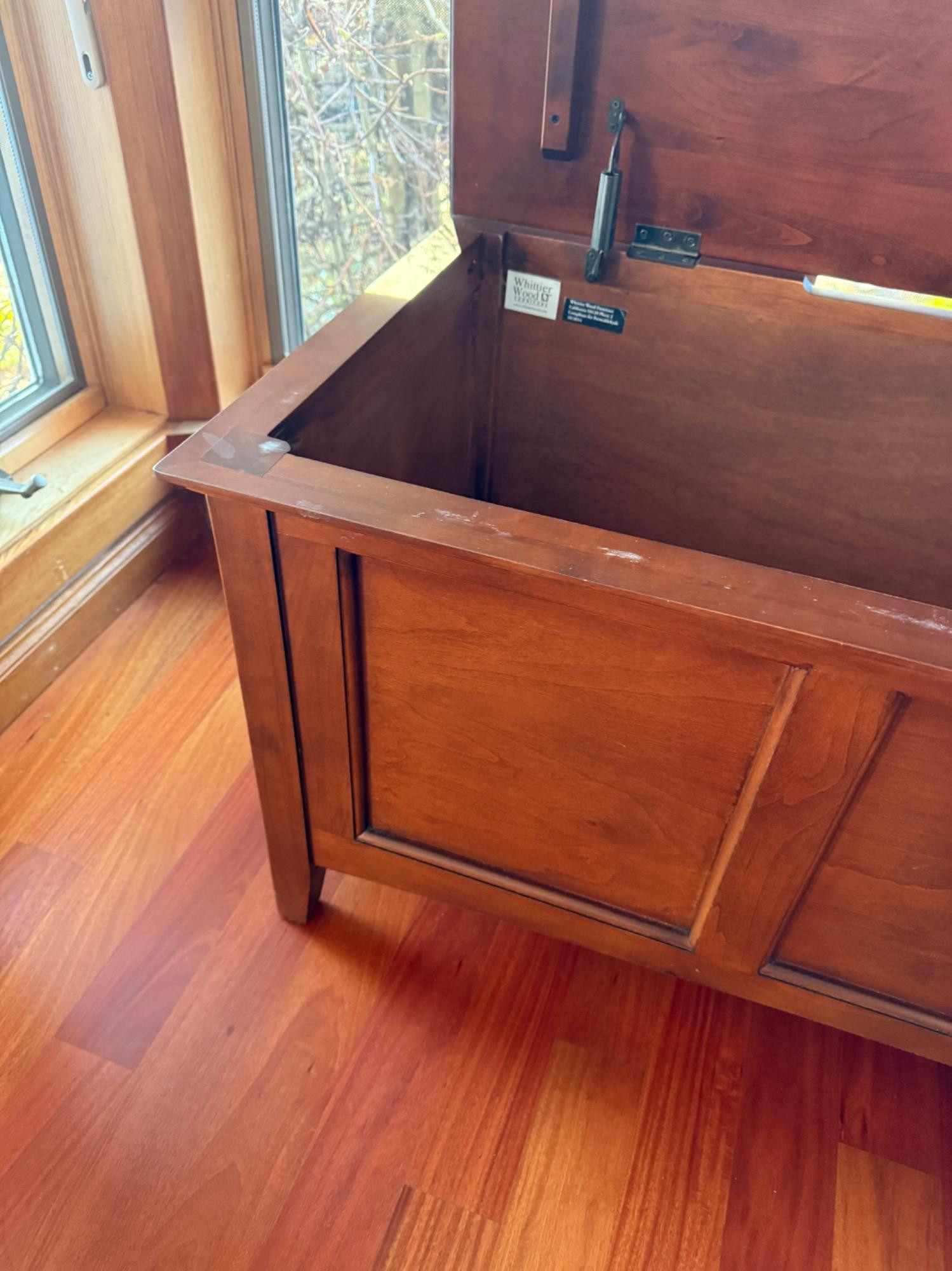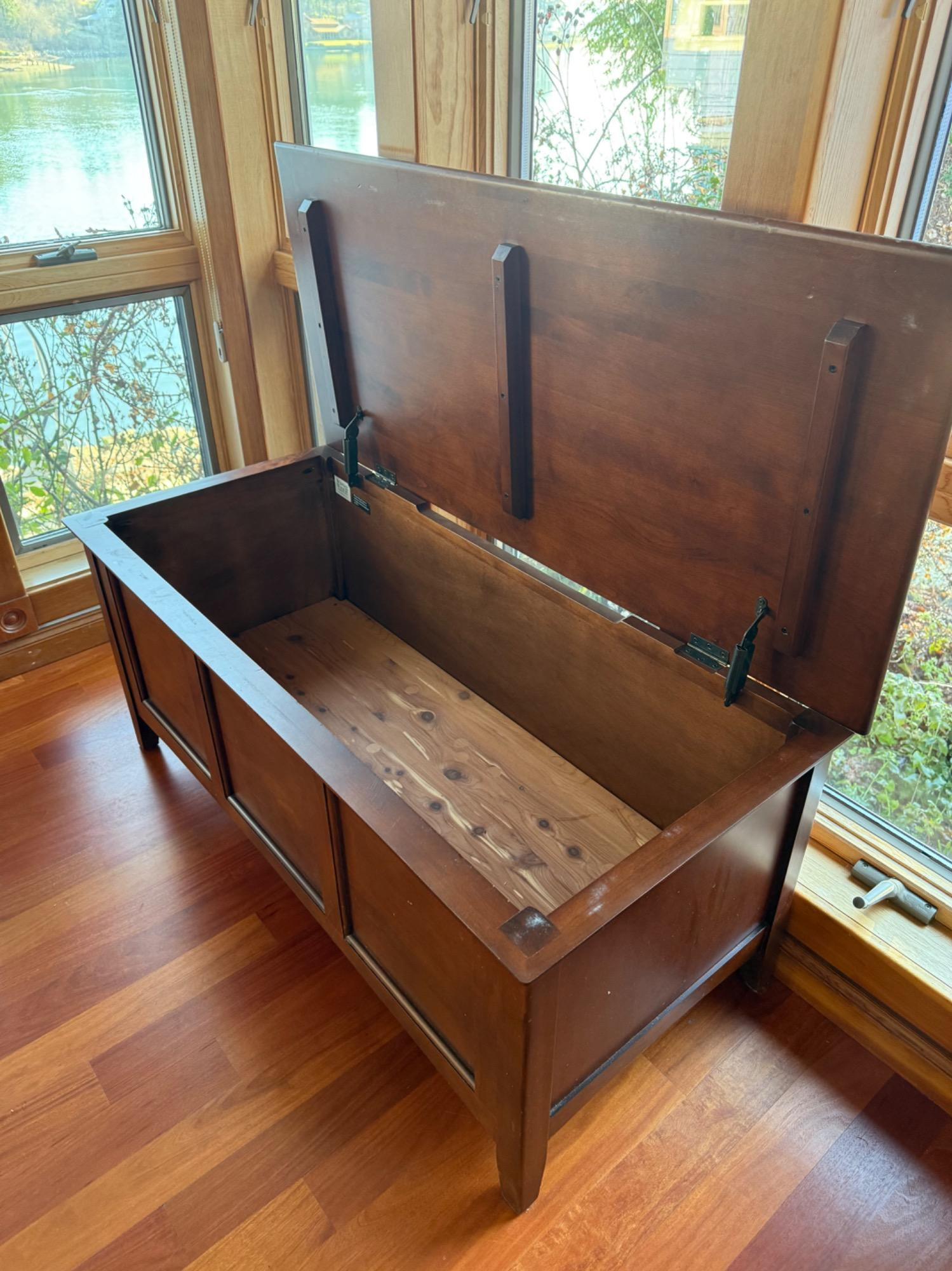 The Whittier Wood McKenzie storage chest offers a charming blend of homey traditional design and efficient keepsake storage. Measuring 21” tall, 21.5” wide, and 48” long, it features a cedar-lined bottom, a lift lid, and a spacious interior ideal for storing family heirlooms, bedding, or extra clothing. The reinforced lid doubles as a sturdy seating option, making this chest both functional and elegant—a perfect addition to any home. Bidding on this lot is an agreement that: (1.) You will have 2 capable, able-bodied persons to lift and load at a minimum. (2.) You will bring a hand truck and/or any other tools needed to remove this item. If these steps are not followed your item will be forfeited and no refund given.