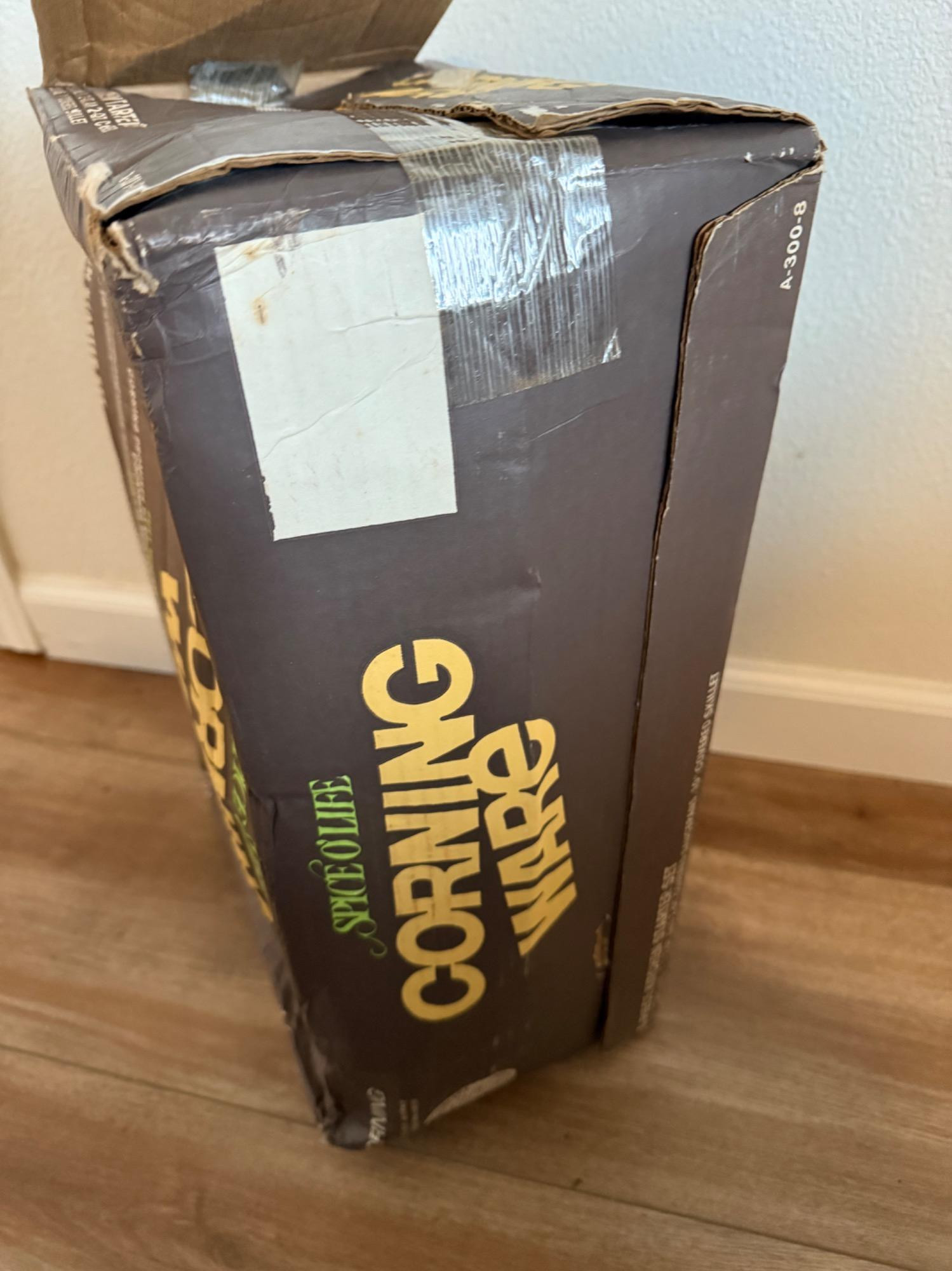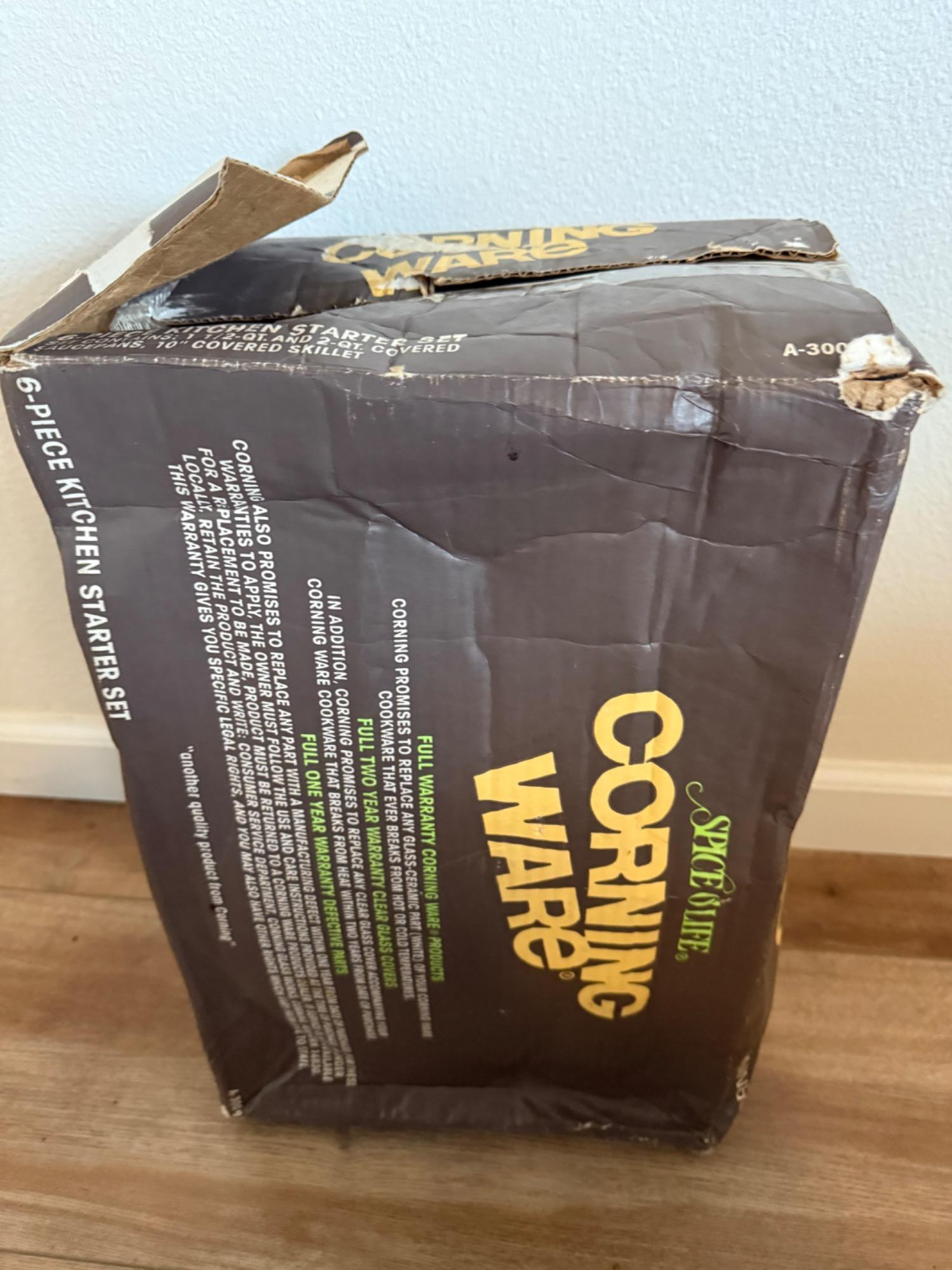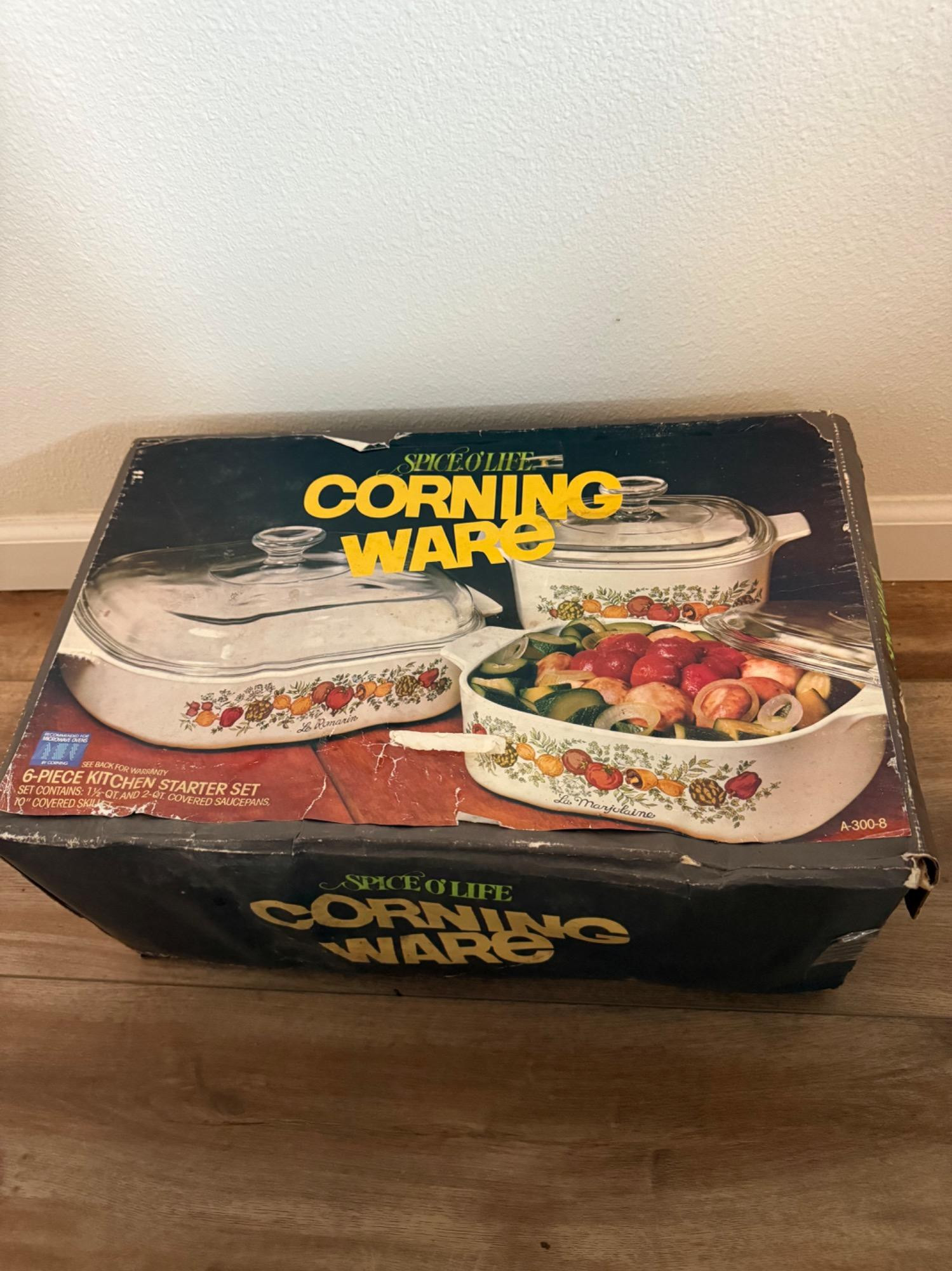 Vintage Corning Ware "Spice of Life" 6-piece kitchen starter set, featuring iconic casserole dishes and saucepans with glass lids. This charming set is perfect for cooking, serving, and storing, blending practicality with retro appeal. The original box is included but shows some wear.