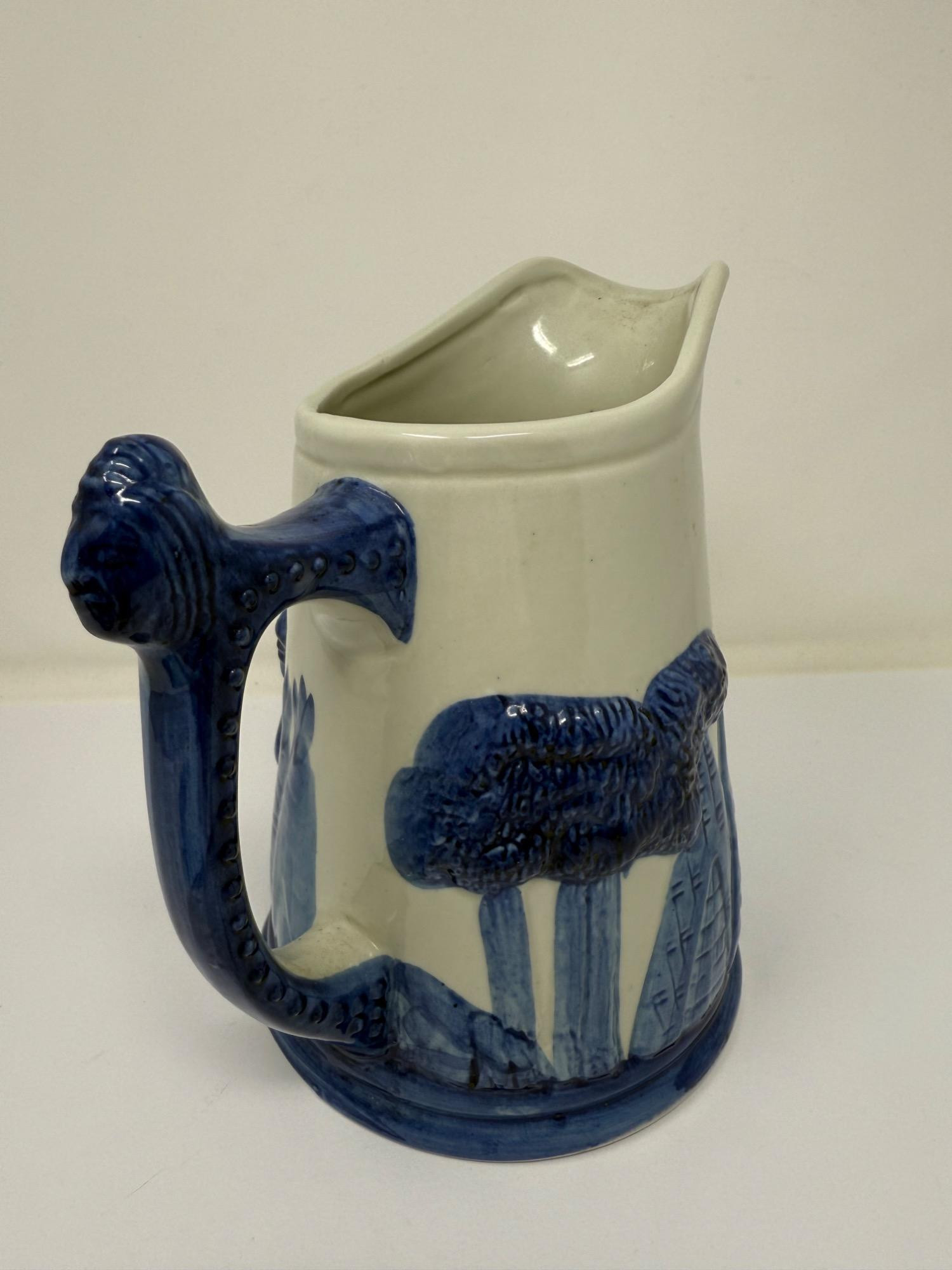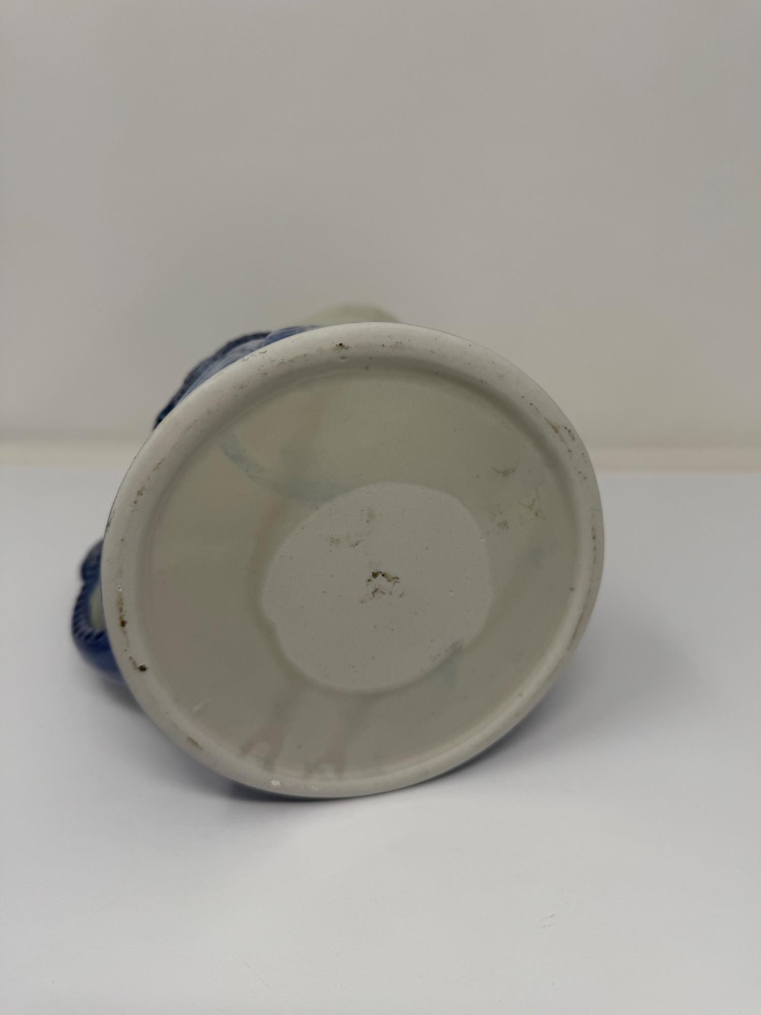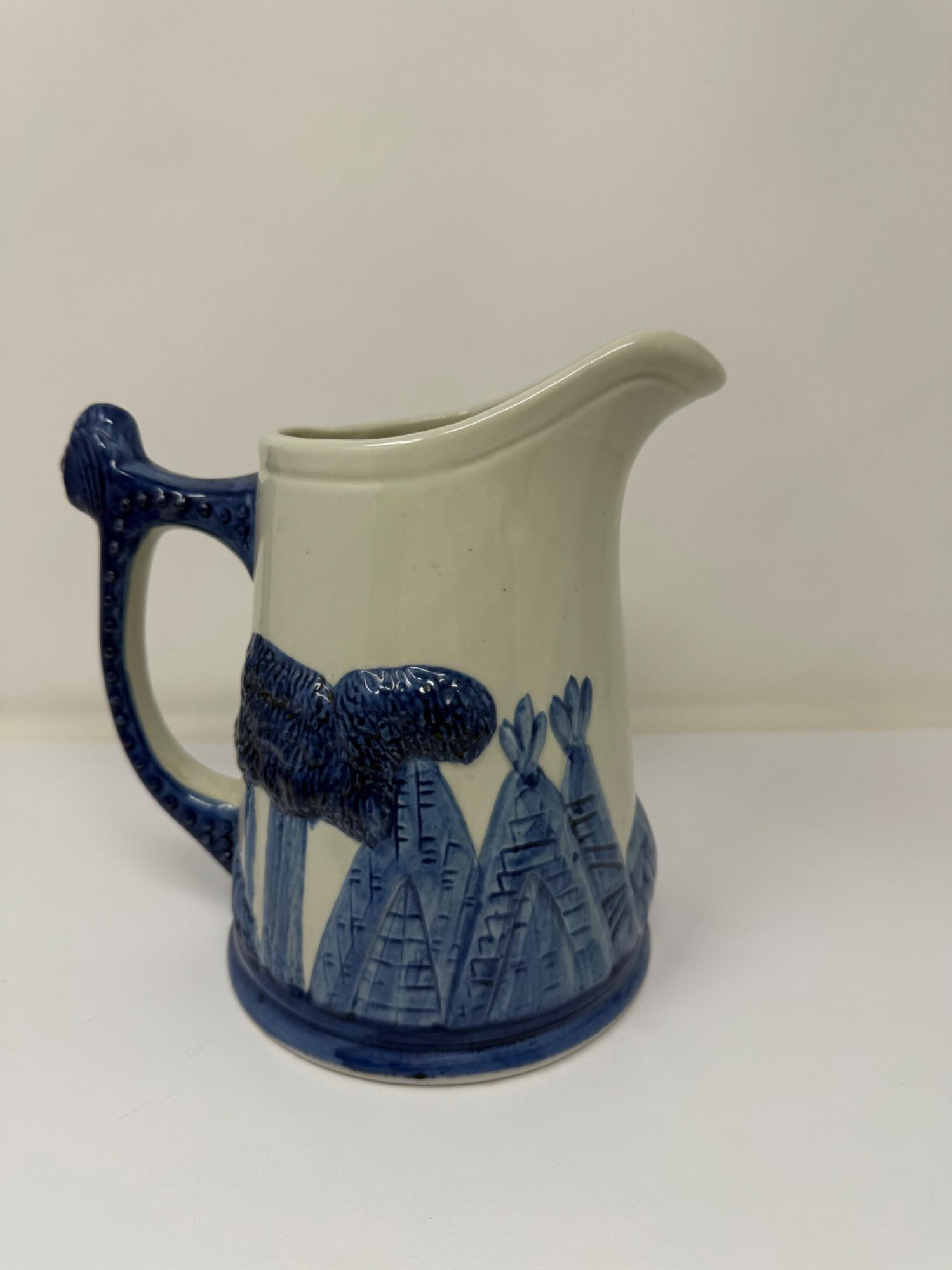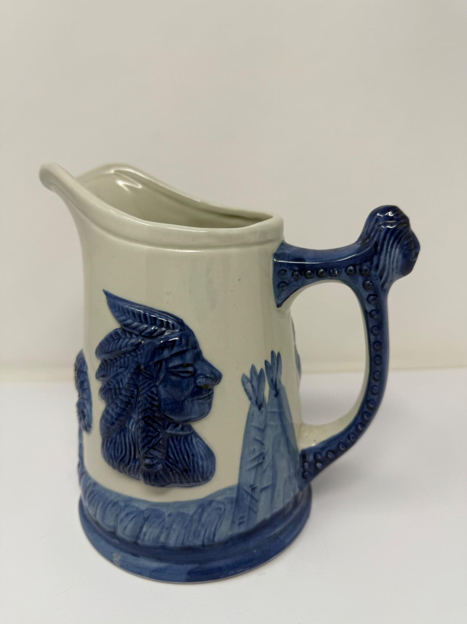 #2 Old Sleepy Eye Pottery Pitcher – 8" x 7.5" Classic Blue & Cream Iconic Sleepy Eye blue and white pitcher featuring a detailed Native American Chief motif on the sides. This classic piece measures approximately 8” tall by 7.5” wide, making it a substantial addition to any collection. The intricate design and rich cobalt blue details make this pitcher a standout display item or functional vintage collectible. Perfect for collectors of Sleepy Eye or Americana pottery.